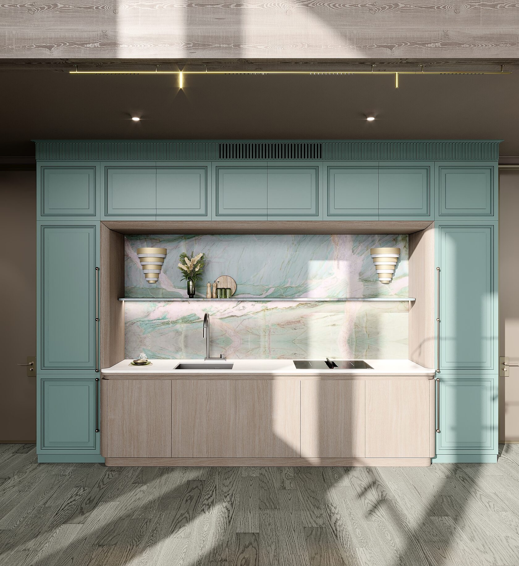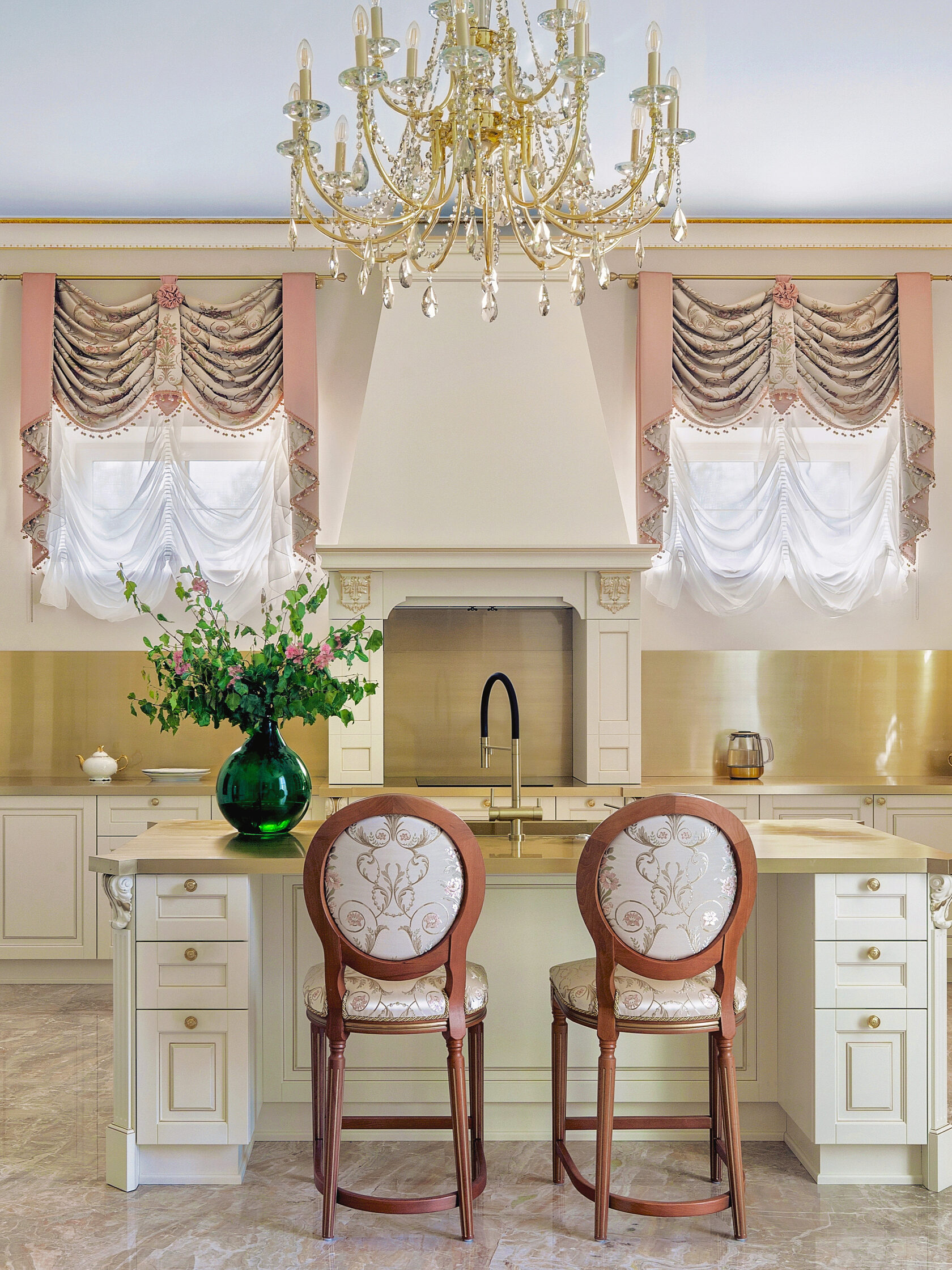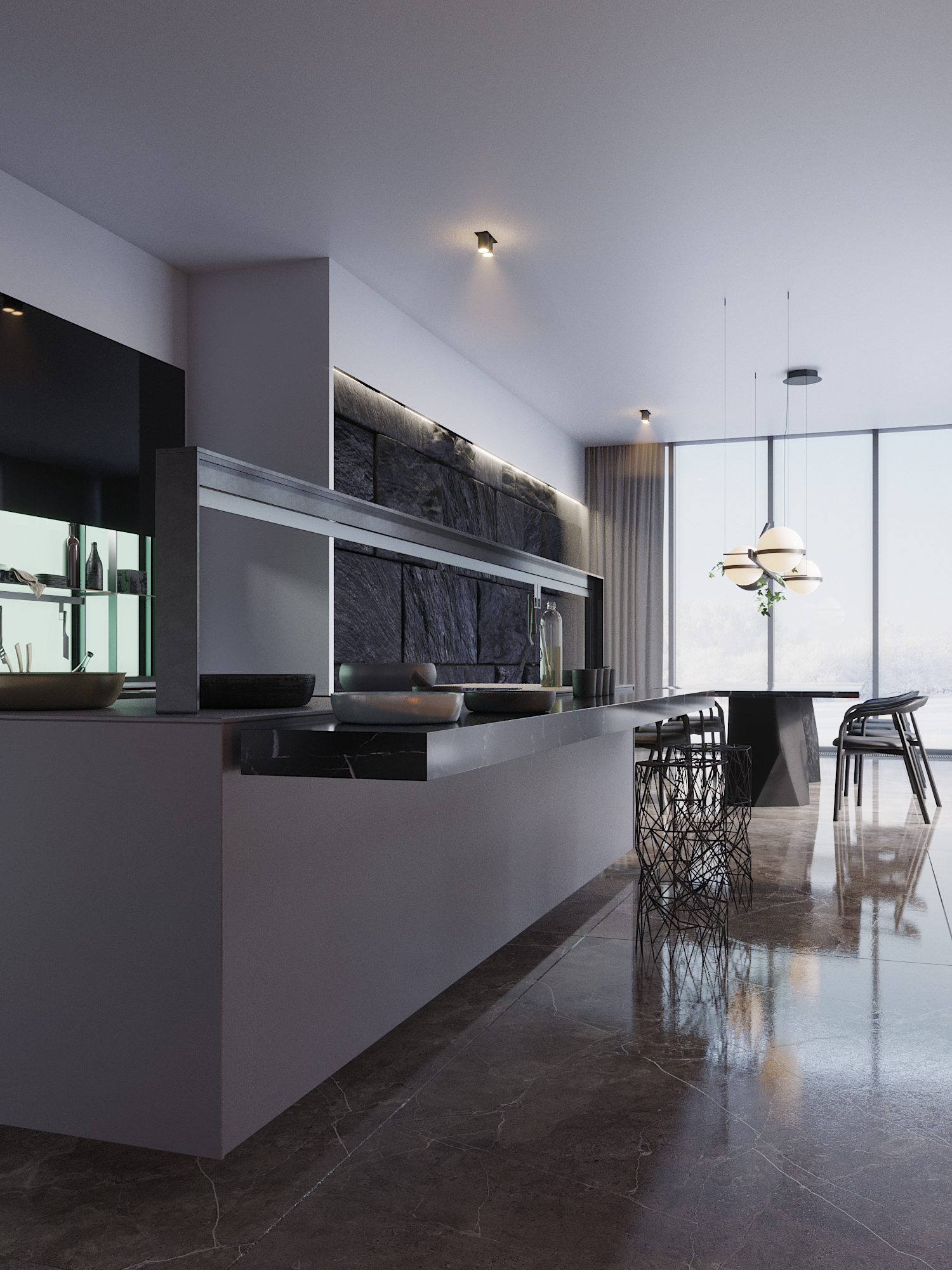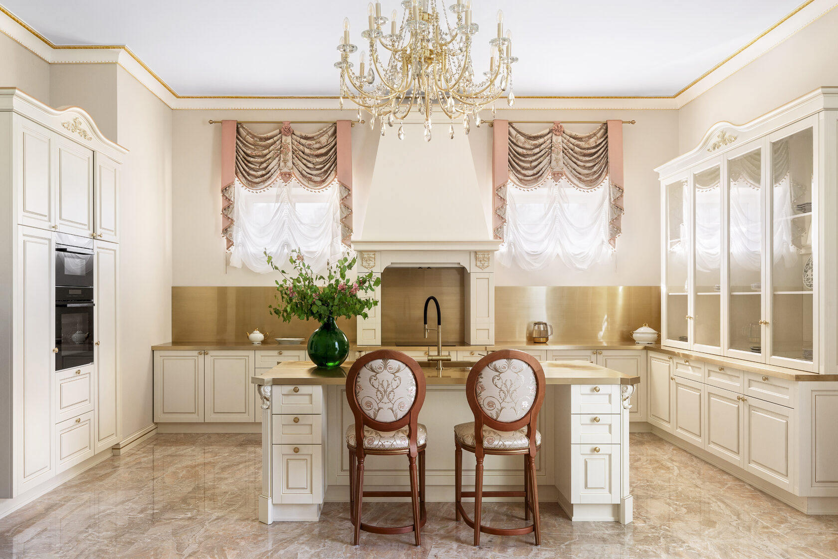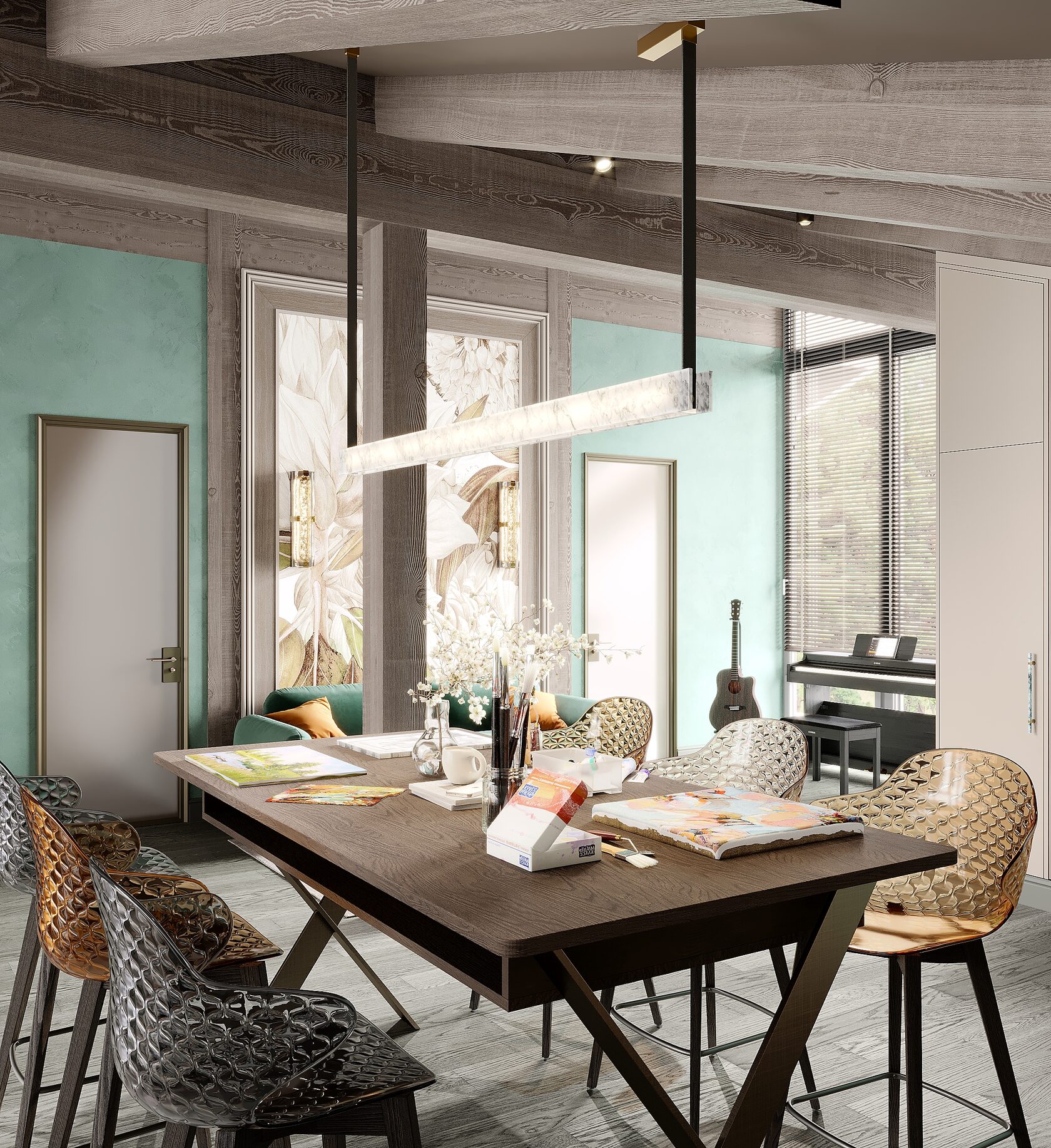 Концепция: В основе концепции лежит создание атмосферы уютного семейного гнезда с акцентом на классический стиль, дополненный изящными элементами шинуазри. Особое внимание уделено деталям декора и освещению. Центральным элементом интерьера стали уникальные светящиеся столешницы из кварца. Интегрированная подсветка не только раскрывает природную красоту камня, но и создаёт мягкое, обволакивающее вечернее освещение, трансформируя пространство и настраивая на искренние семейные беседы.