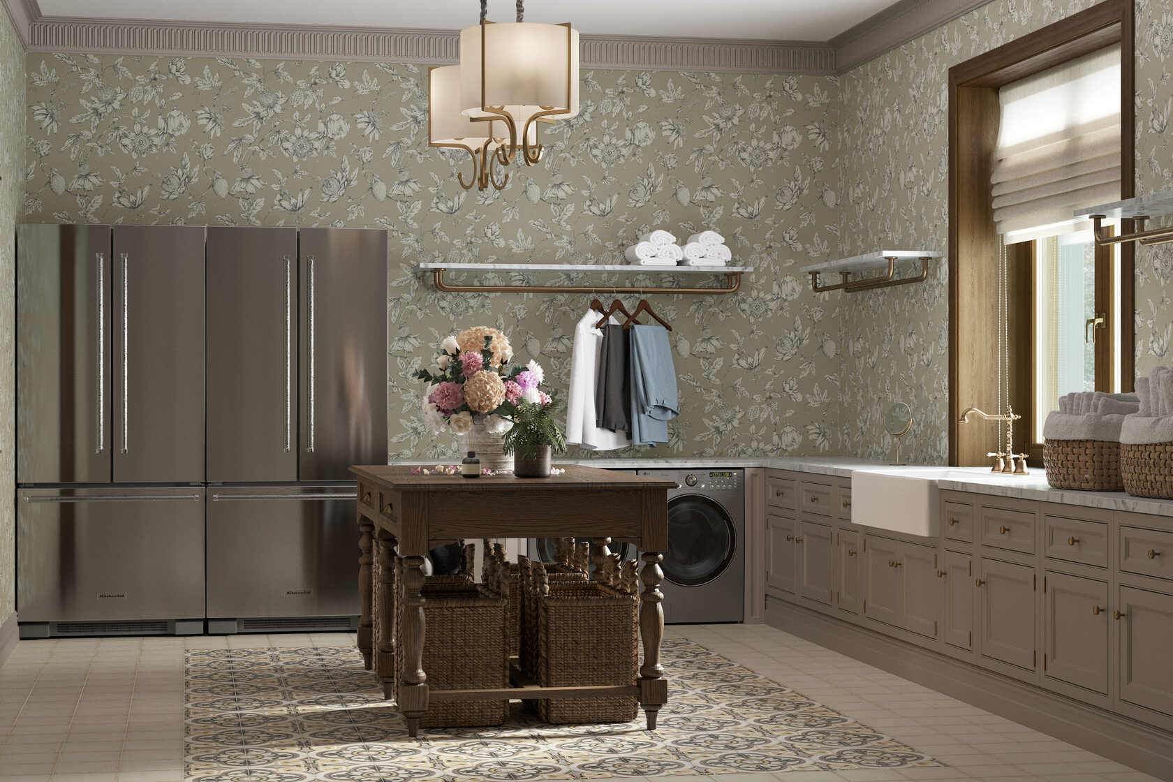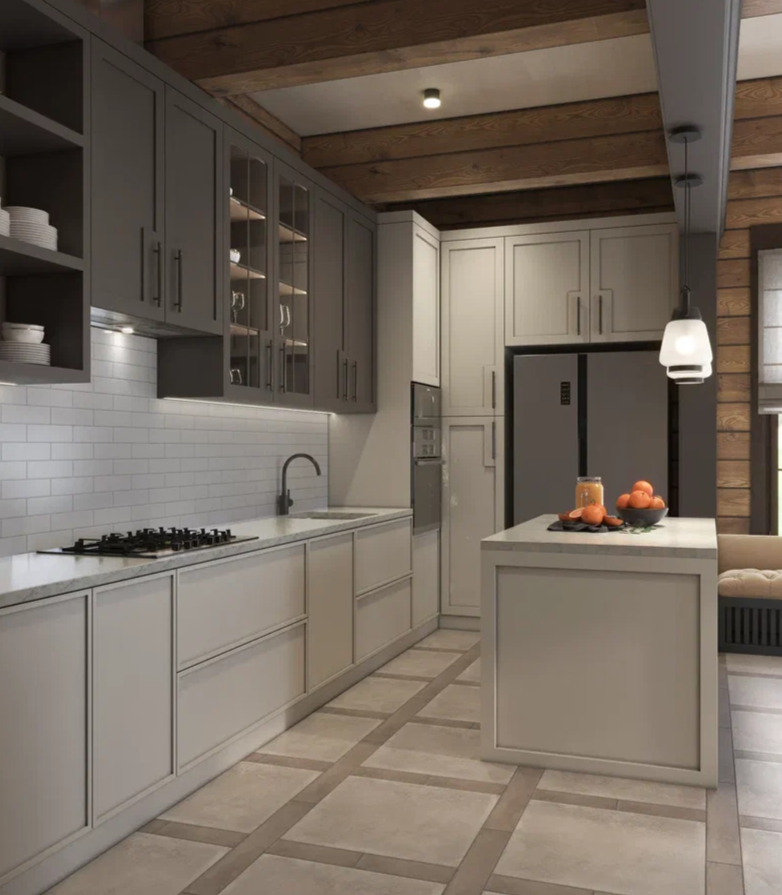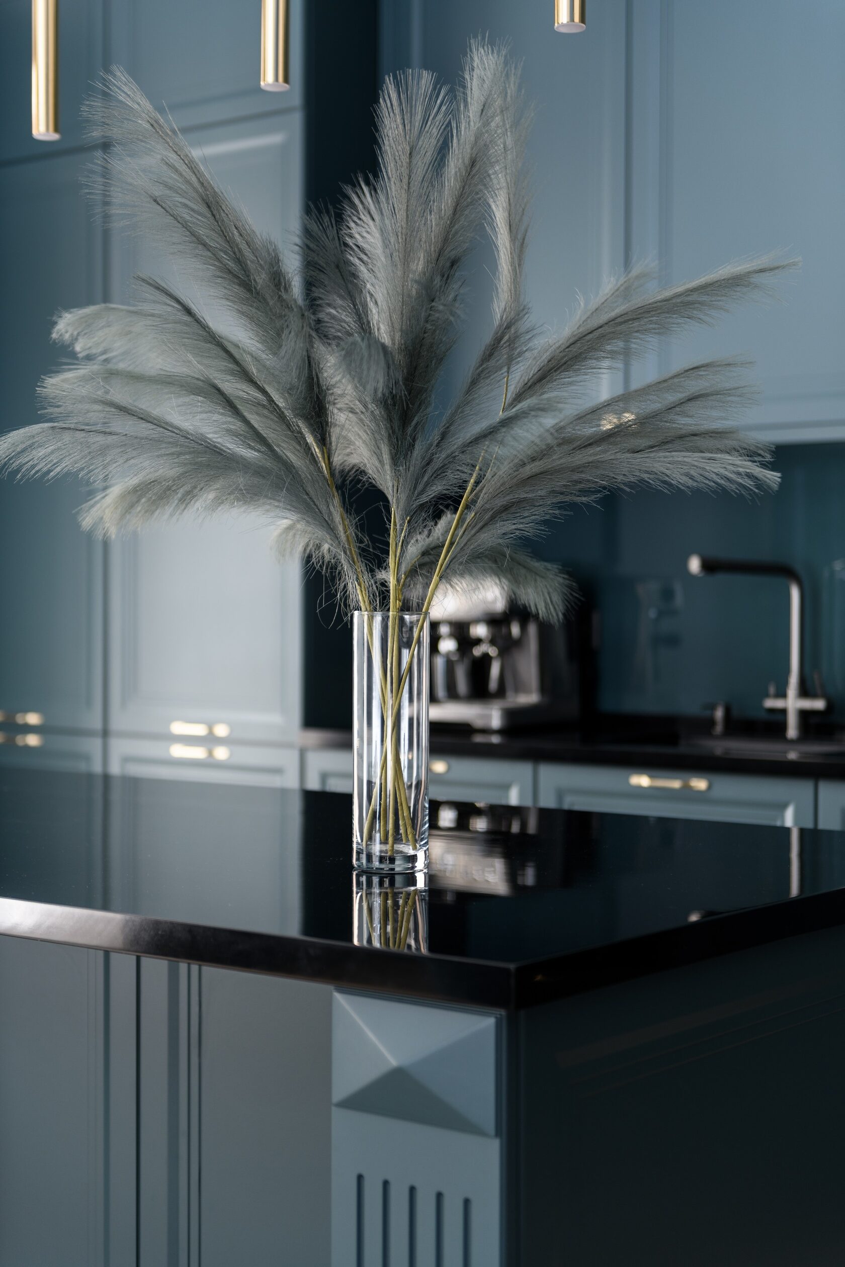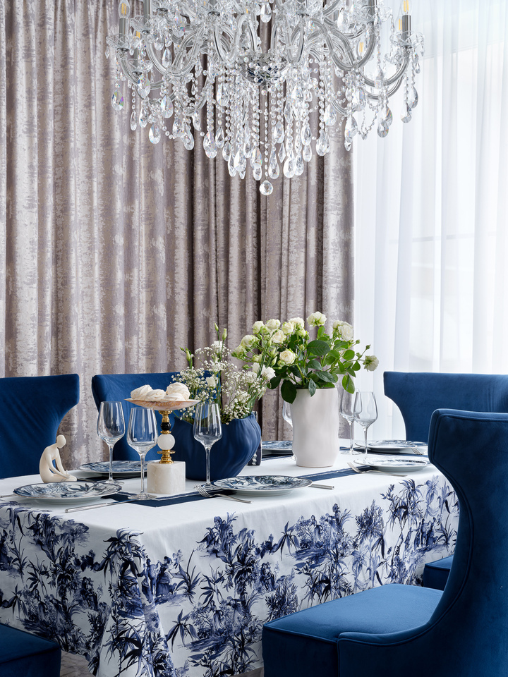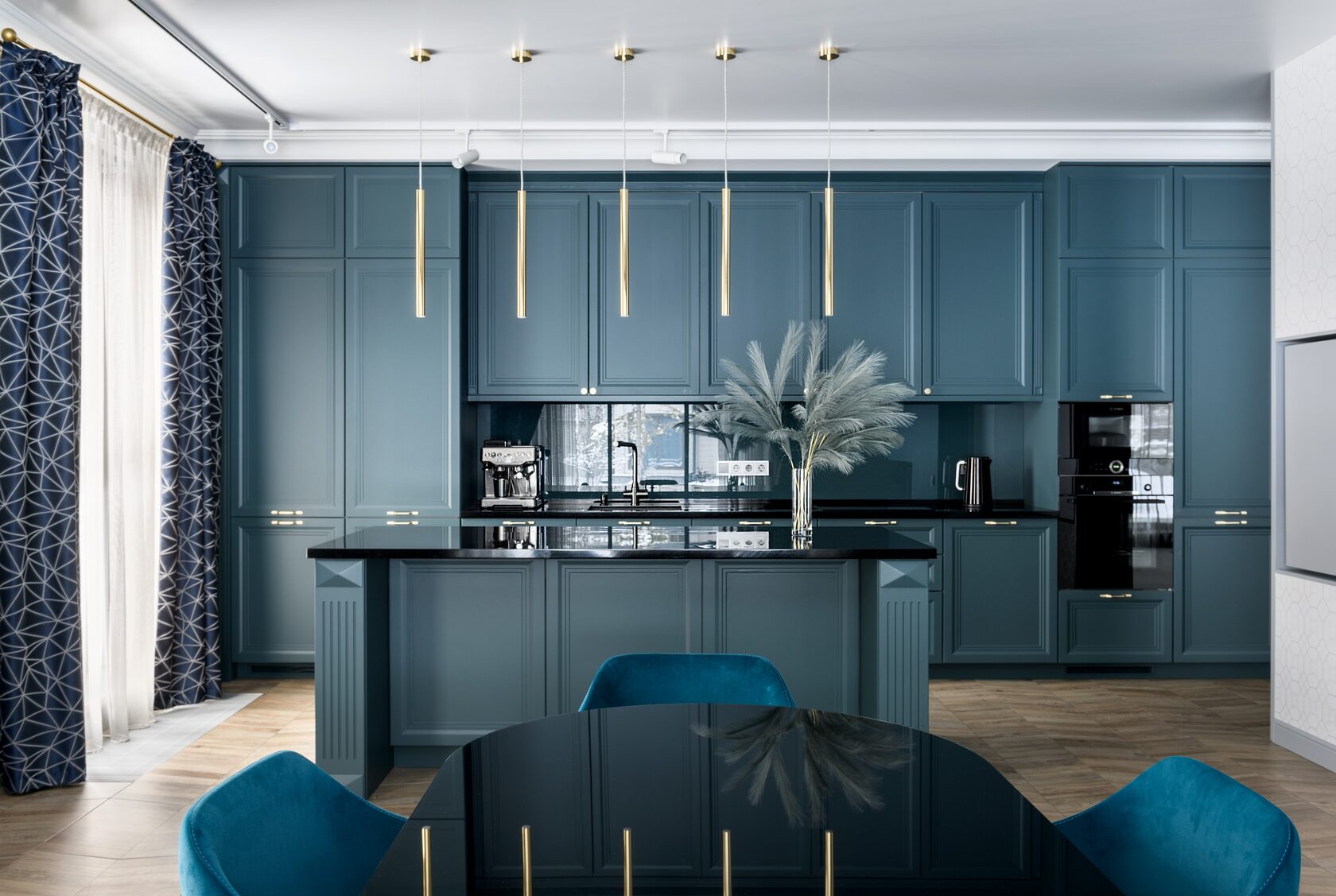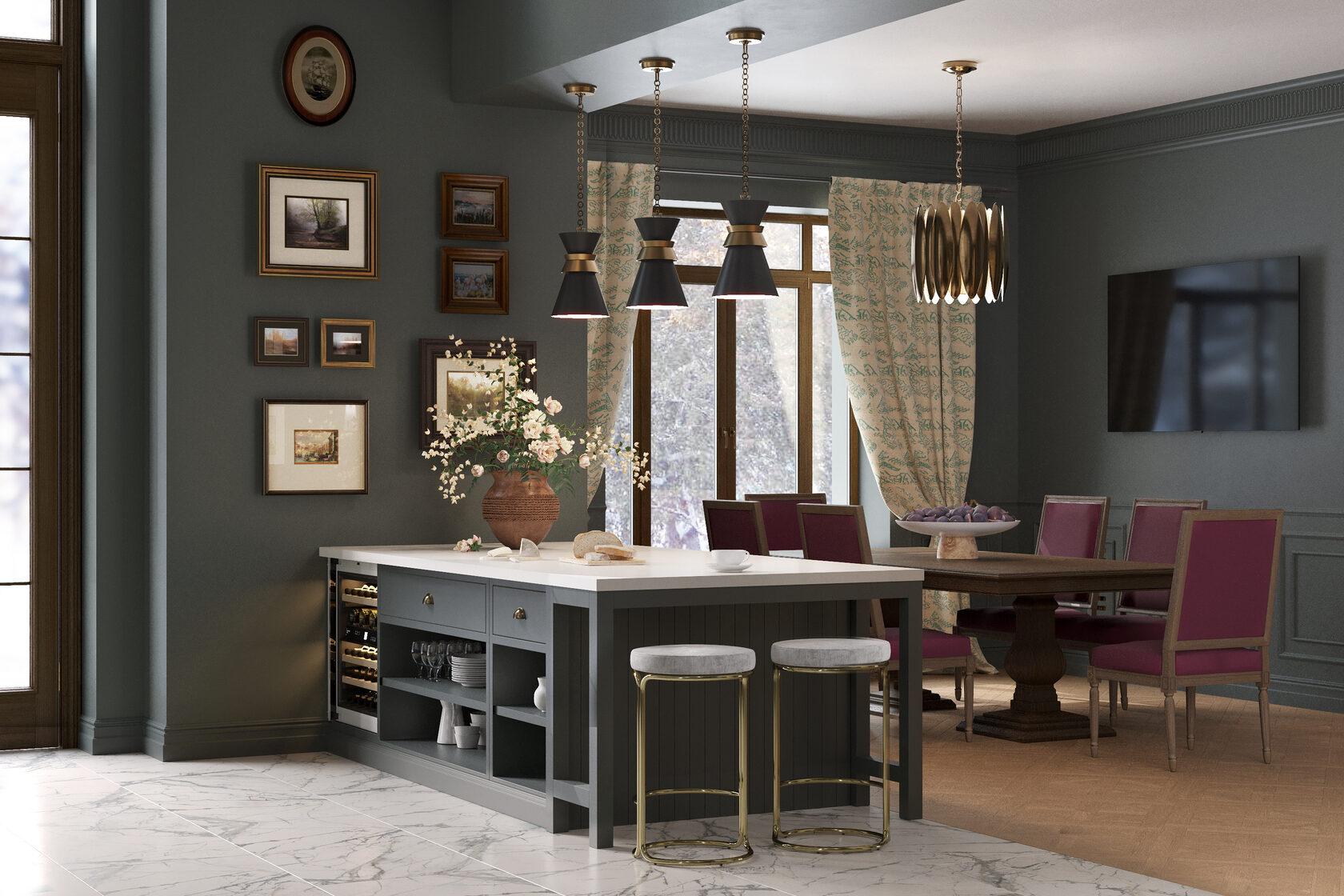 Концепция: В основе концепции лежит создание атмосферы уютного семейного гнезда с акцентом на классический стиль, дополненный изящными элементами шинуазри. Особое внимание уделено деталям декора и освещению. Центральным элементом интерьера стали уникальные светящиеся столешницы из кварца. Интегрированная подсветка не только раскрывает природную красоту камня, но и создаёт мягкое, обволакивающее вечернее освещение, трансформируя пространство и настраивая на искренние семейные беседы.