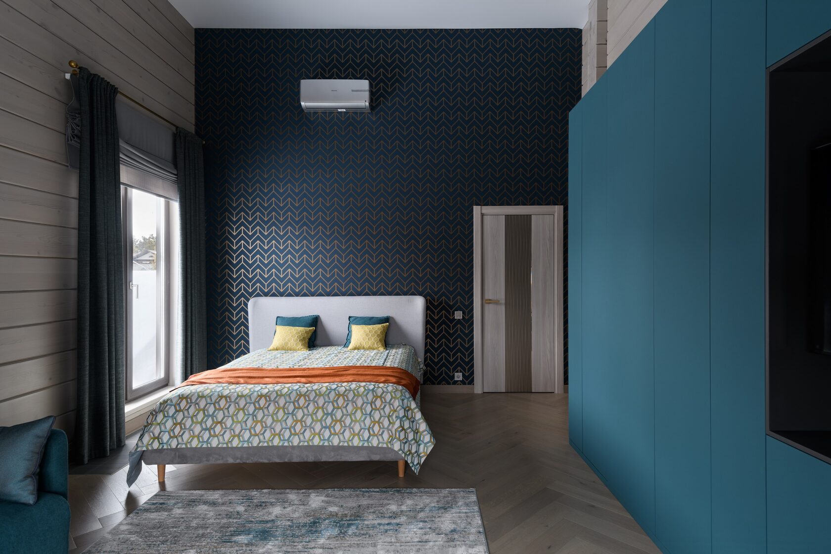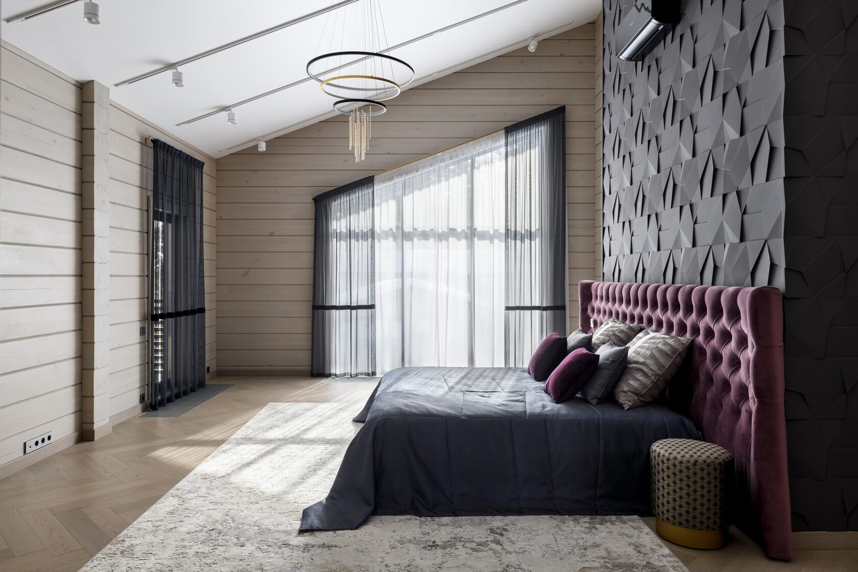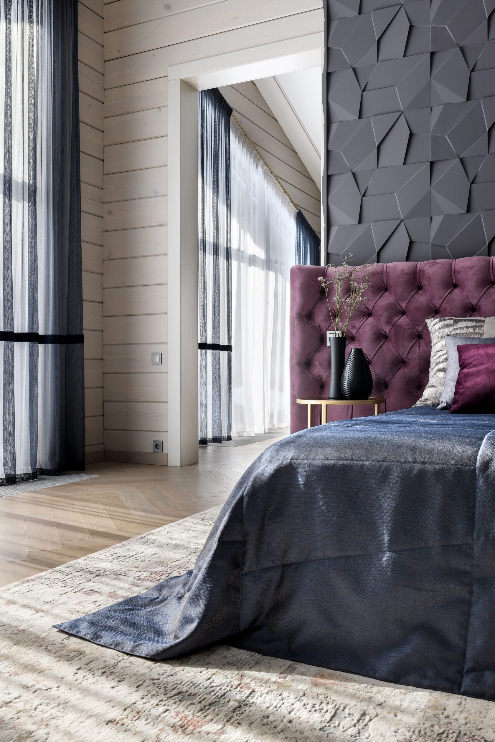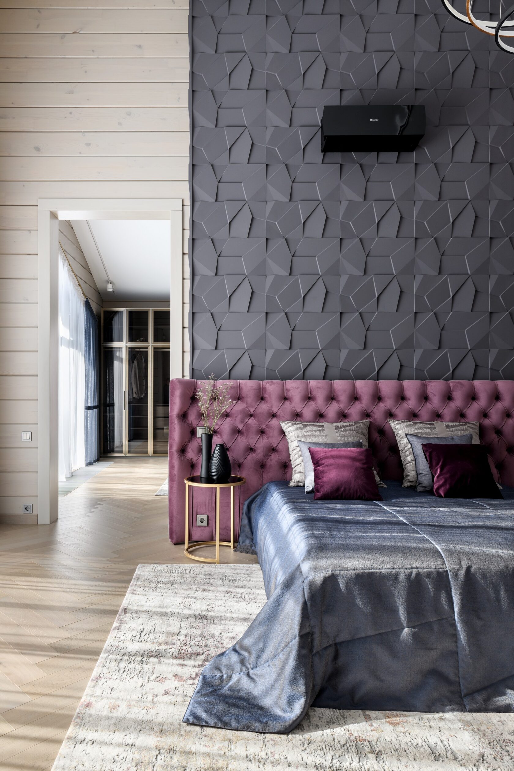 Концепция: Планировка: первый этаж после реконструкции, второй этаж — мансардный, вновь возведённый из клееного бруса с большой высотой. Центральный элемент первого этажа — трёхсторонний камин, разделяющий гостиную и столовую. Перегородка с вращающимся телевизором позволяет всей семье смотреть ТВ из любой точки общего пространства. Функциональные решения: короб вокруг дымохода второго этажа скрывает коммуникации и трассы кондиционера. Приватная зона включает мастер-спальню, собственную ванную и большую гардеробную. Стиль и цвет: смешанный стиль — современная классика и ар-деко. Основной холст — серый цвет разных оттенков, дополненный томным синим и сложным винным цветом в мебели и отделке. Высокая стена мастер-спальни оформлена 3D-панелями в цвете «Тёмная Ночь», создающими игру светотени. Освещение: продуманы различные сценарии: основной рабочий свет, локальный, приглушённый и рассеянный. Возможность сценарного освещения позволяет менять атмосферу пространства.