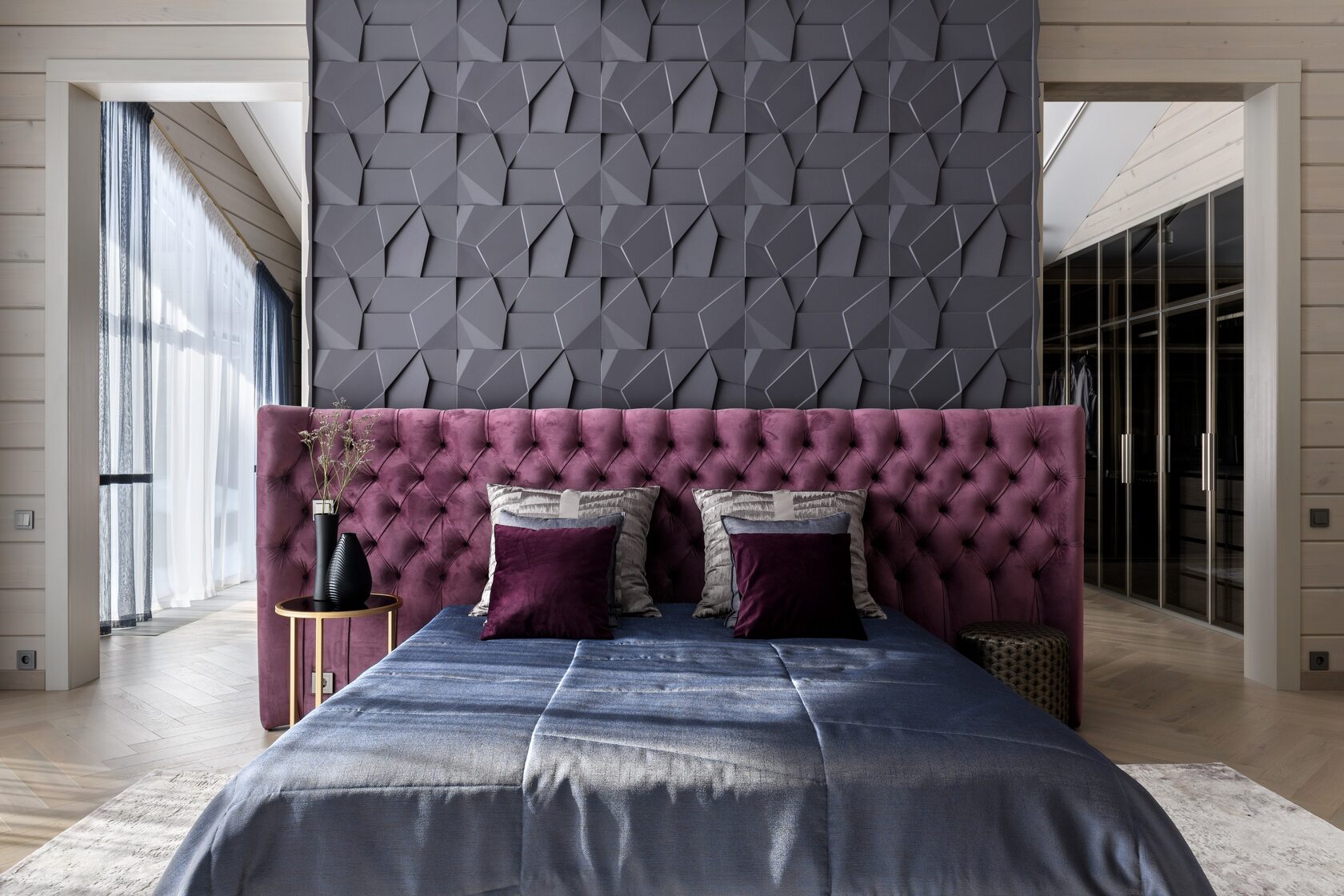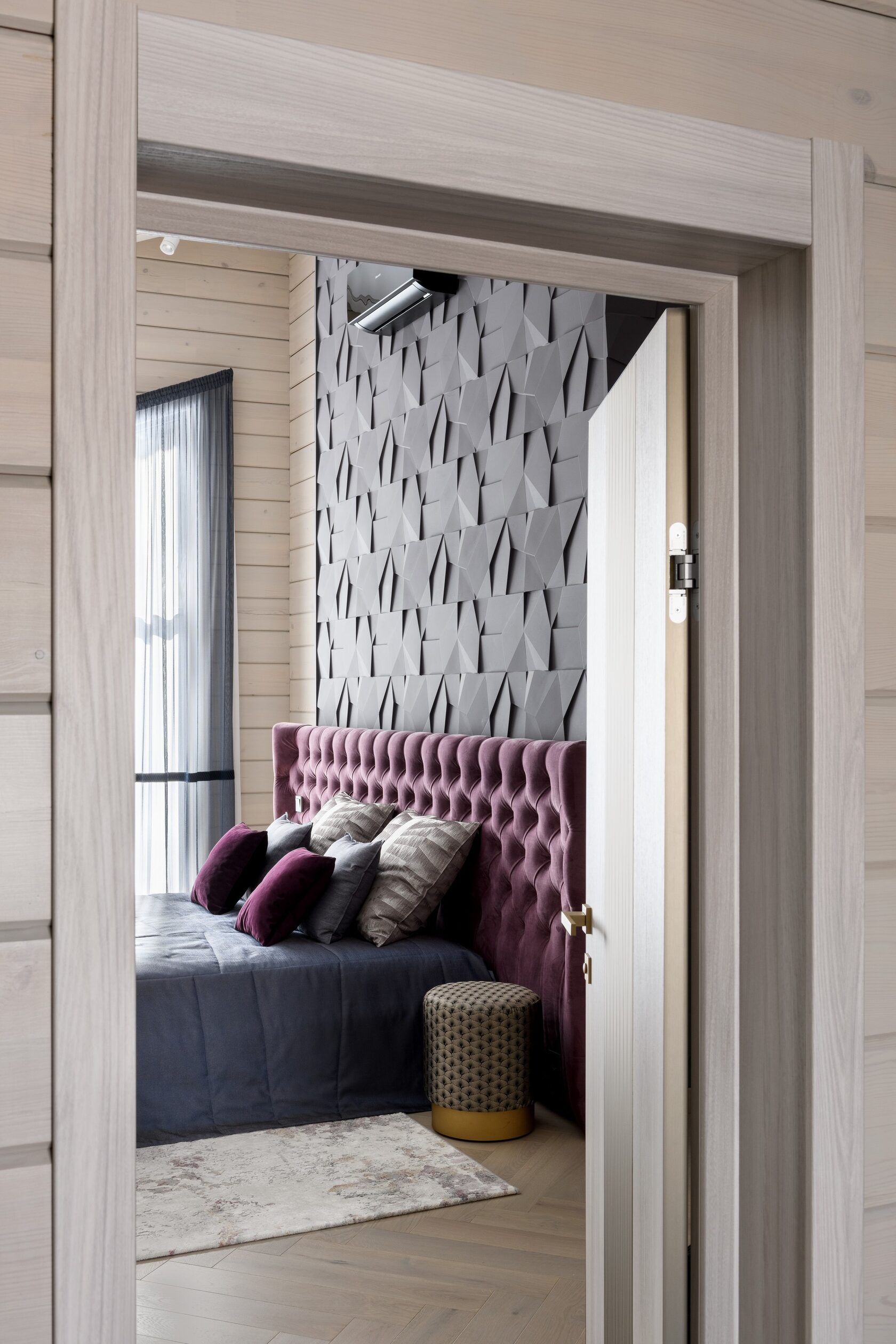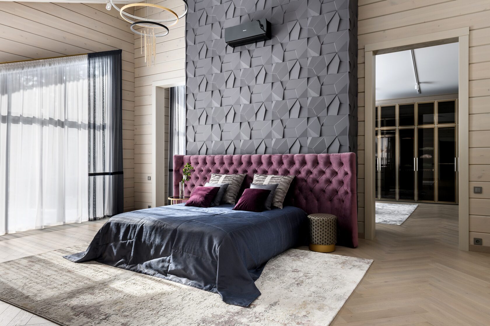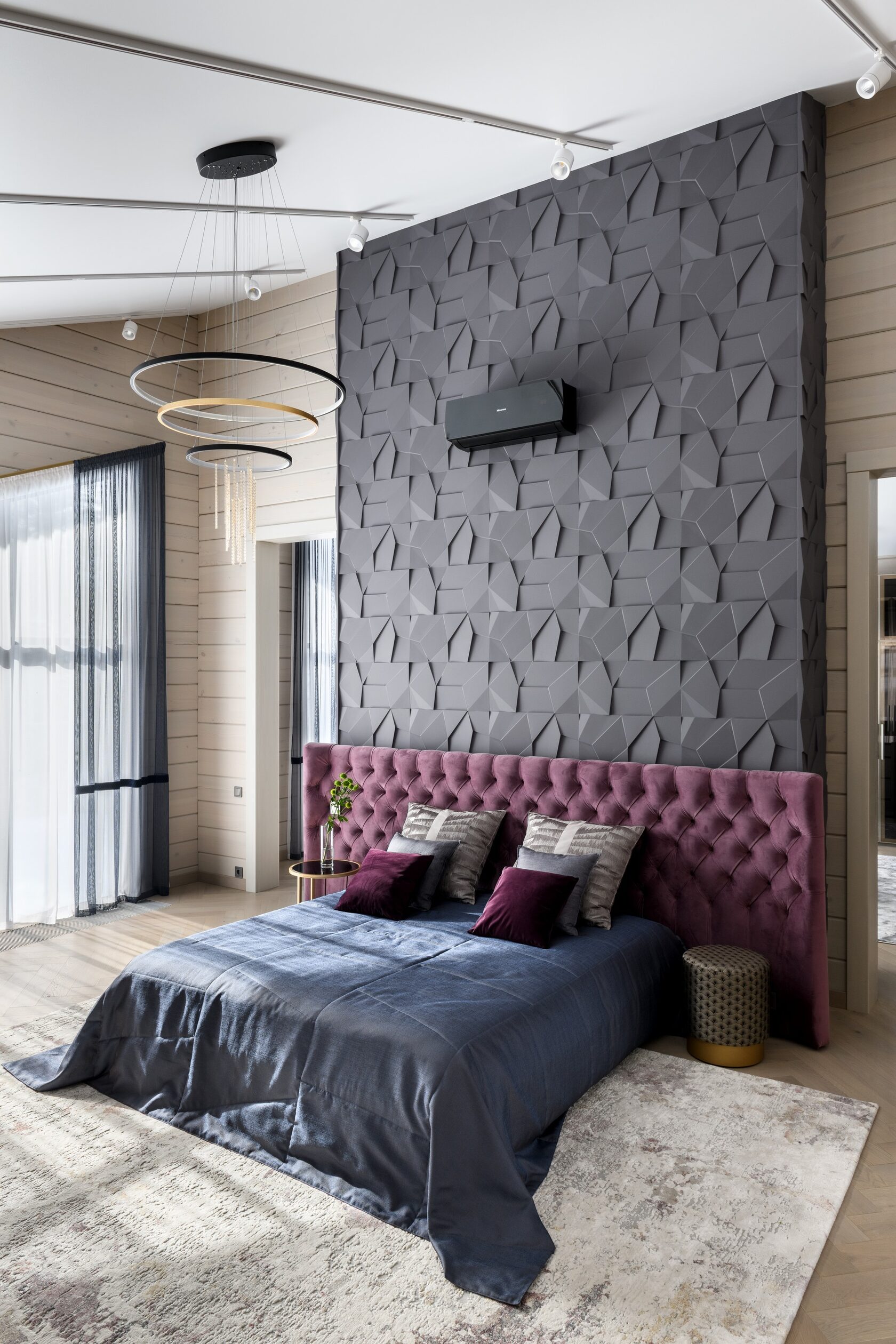 Концепция: Планировка: первый этаж после реконструкции, второй этаж — мансардный, вновь возведённый из клееного бруса с большой высотой. Центральный элемент первого этажа — трёхсторонний камин, разделяющий гостиную и столовую. Перегородка с вращающимся телевизором позволяет всей семье смотреть ТВ из любой точки общего пространства. Функциональные решения: короб вокруг дымохода второго этажа скрывает коммуникации и трассы кондиционера. Приватная зона включает мастер-спальню, собственную ванную и большую гардеробную. Стиль и цвет: смешанный стиль — современная классика и ар-деко. Основной холст — серый цвет разных оттенков, дополненный томным синим и сложным винным цветом в мебели и отделке. Высокая стена мастер-спальни оформлена 3D-панелями в цвете «Тёмная Ночь», создающими игру светотени. Освещение: продуманы различные сценарии: основной рабочий свет, локальный, приглушённый и рассеянный. Возможность сценарного освещения позволяет менять атмосферу пространства.