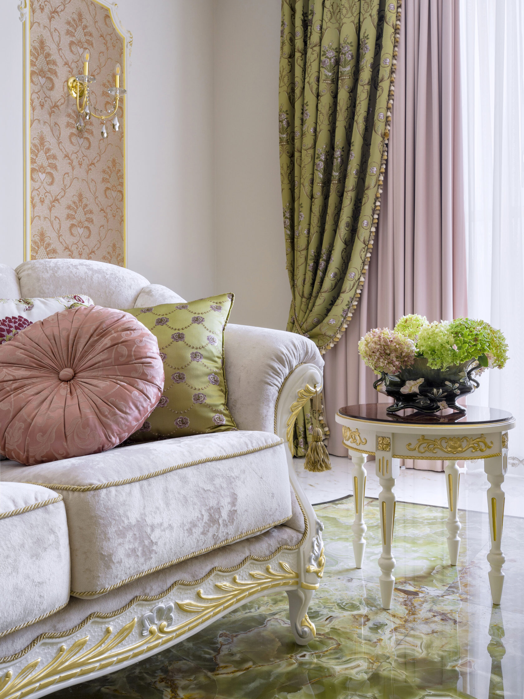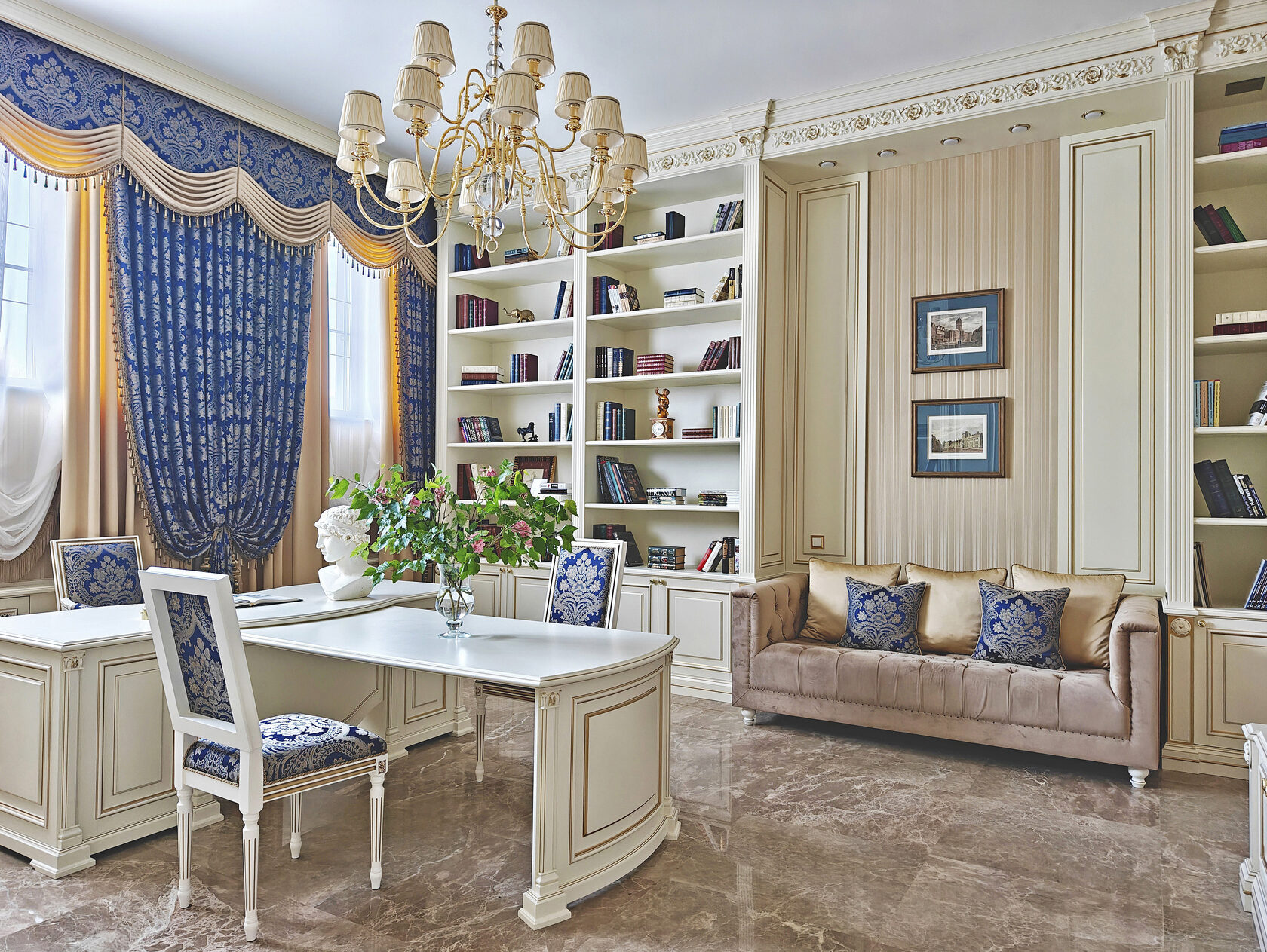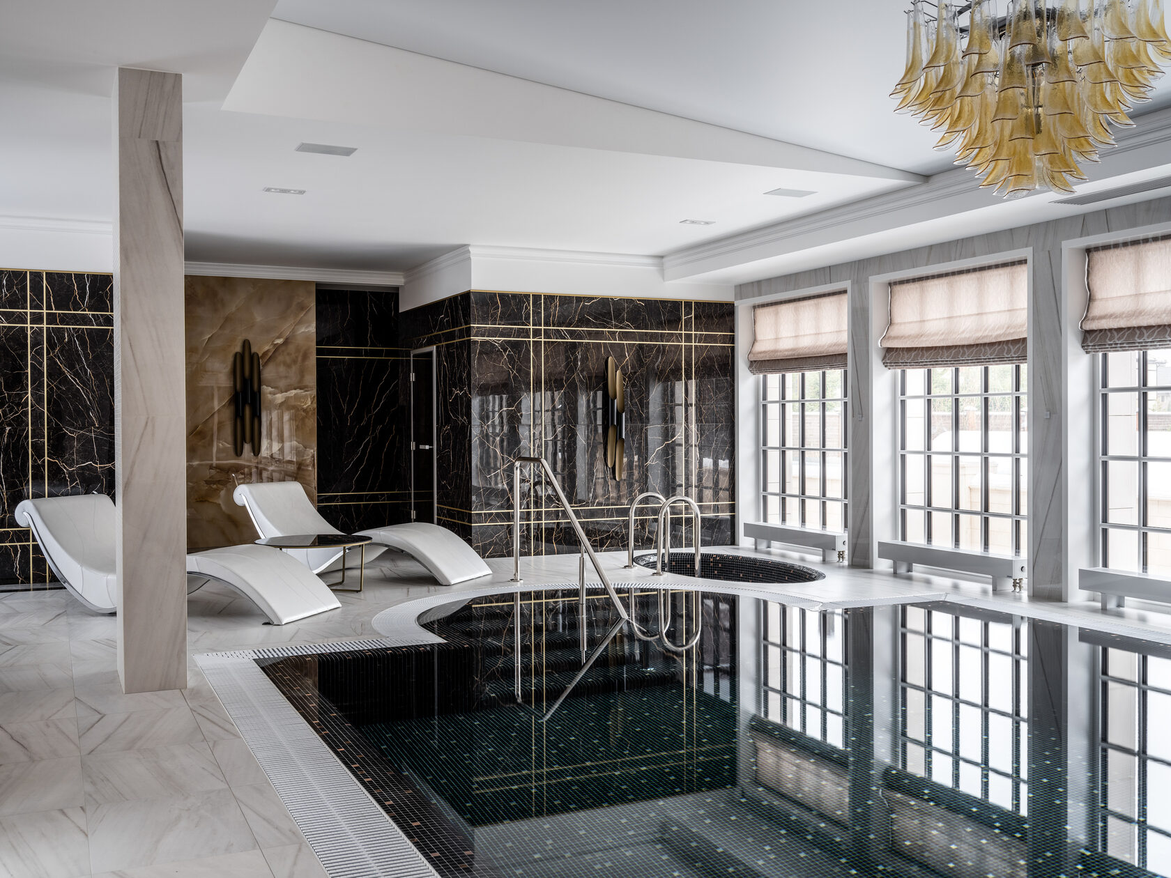Концепция: Главной идеей стало глубокое погружение в стилистику и атмосферу загородных усадеб XIX века, с полным отказом от эклектики. Основой дизайна послужили роскошные полы из мрамора и оникса, а также тщательно подобранный текстиль и эксклюзивная мебель, изготовленная на заказ в России или привезенная из Италии и Испании. Именно текстиль — от сложных штор с ламбрекенами до шелковых обоев и множества подушек — формирует уникальный облик дома, обеспечивая при этом ощущение простора и легкости за счет безупречных пропорций.