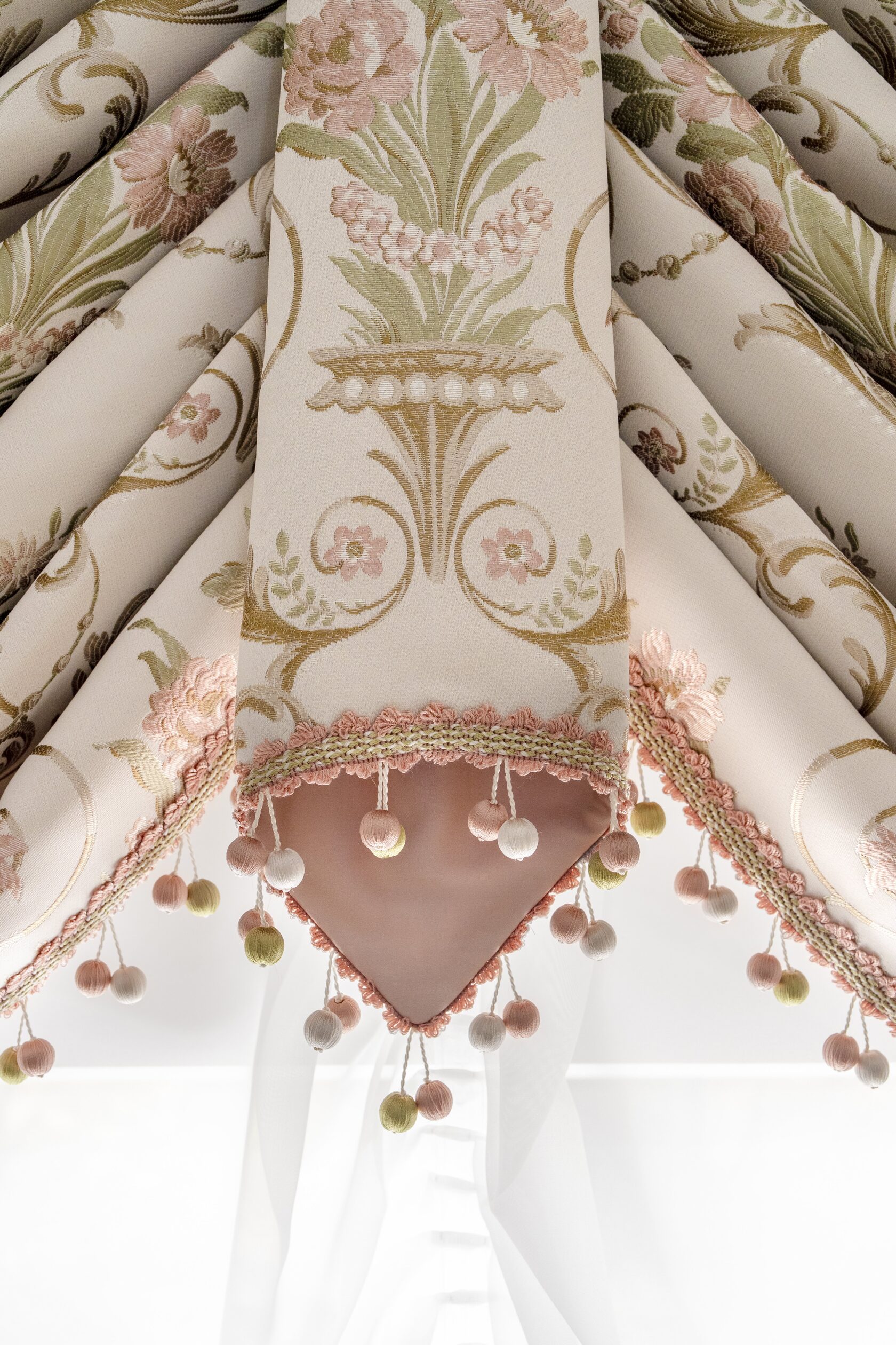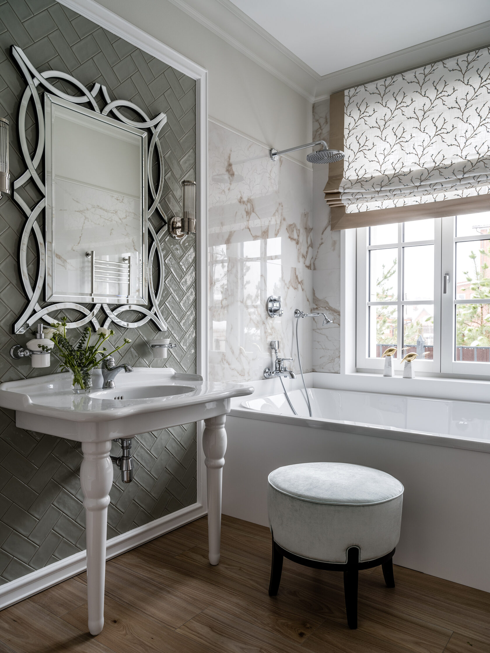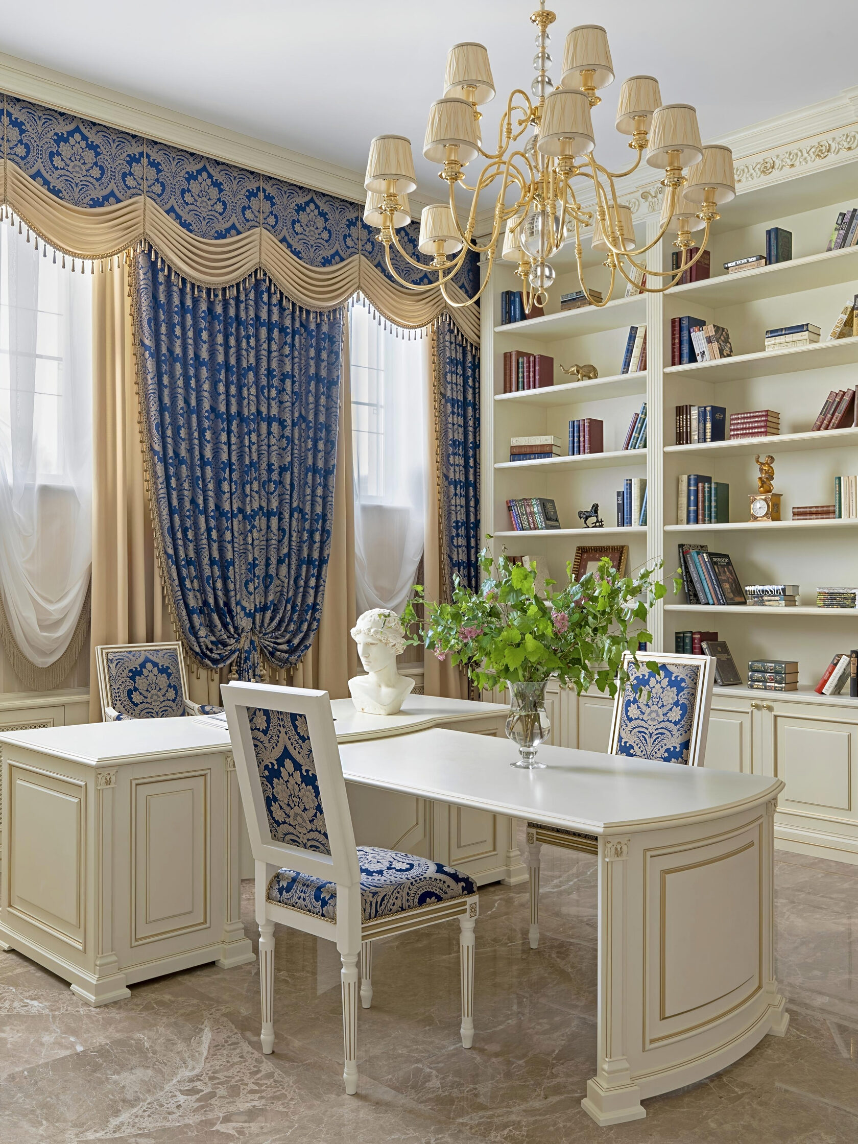 Концепция: Главной идеей стало глубокое погружение в стилистику и атмосферу загородных усадеб XIX века, с полным отказом от эклектики. Основой дизайна послужили роскошные полы из мрамора и оникса, а также тщательно подобранный текстиль и эксклюзивная мебель, изготовленная на заказ в России или привезенная из Италии и Испании. Именно текстиль — от сложных штор с ламбрекенами до шелковых обоев и множества подушек — формирует уникальный облик дома, обеспечивая при этом ощущение простора и легкости за счет безупречных пропорций.