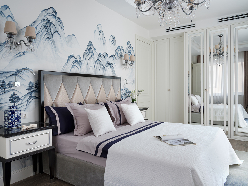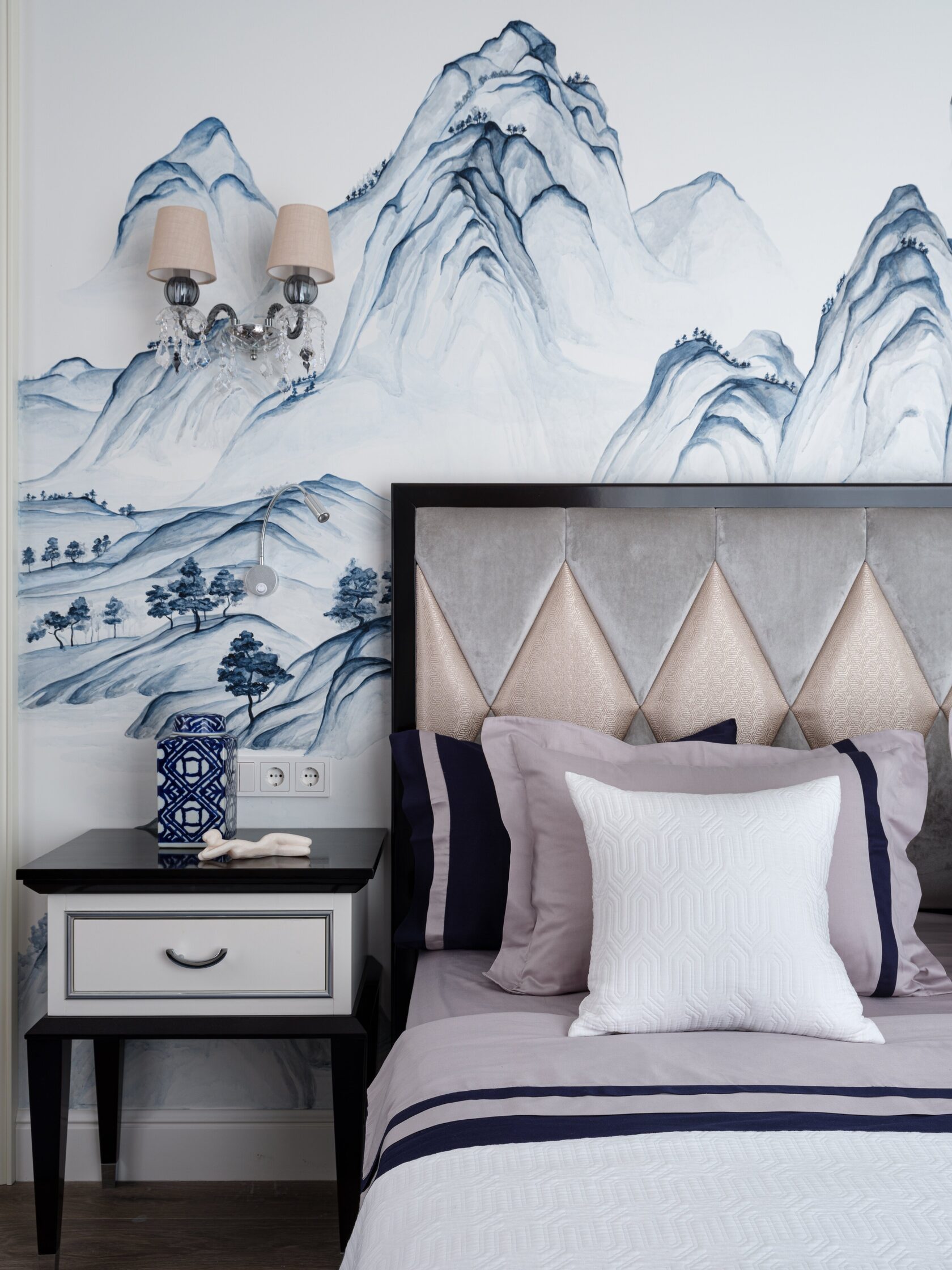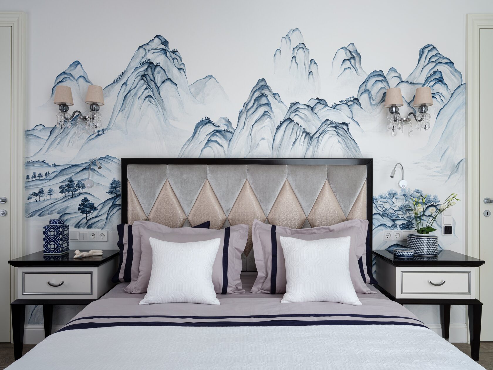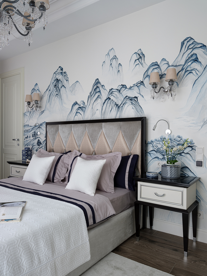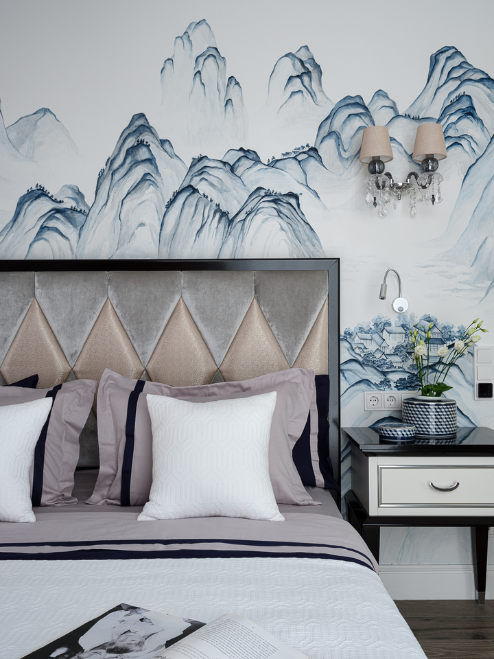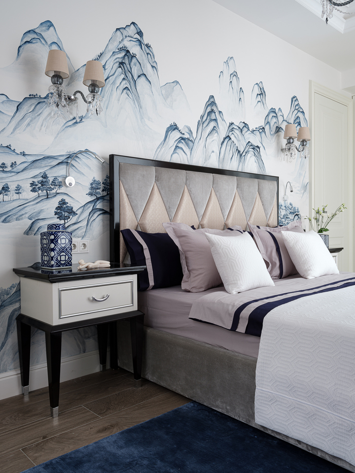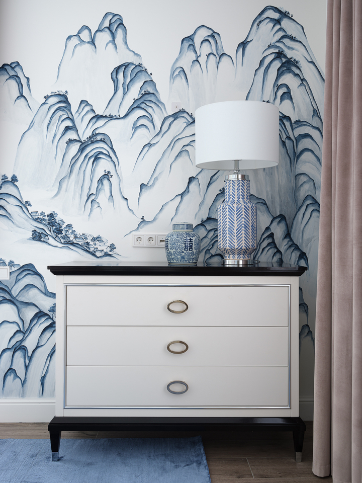 Спальня и санузел: стиль "Гжель" Спальня и санузел стали ключевыми зонами, где стиль "Гжель" раскрывается в полной мере. Бело-голубые орнаменты, характерные для этого направления, украшают стены, текстиль и декоративные элементы. Эти детали создают ощущение легкости и чистоты, одновременно отсылая к традиционному русскому искусству.
