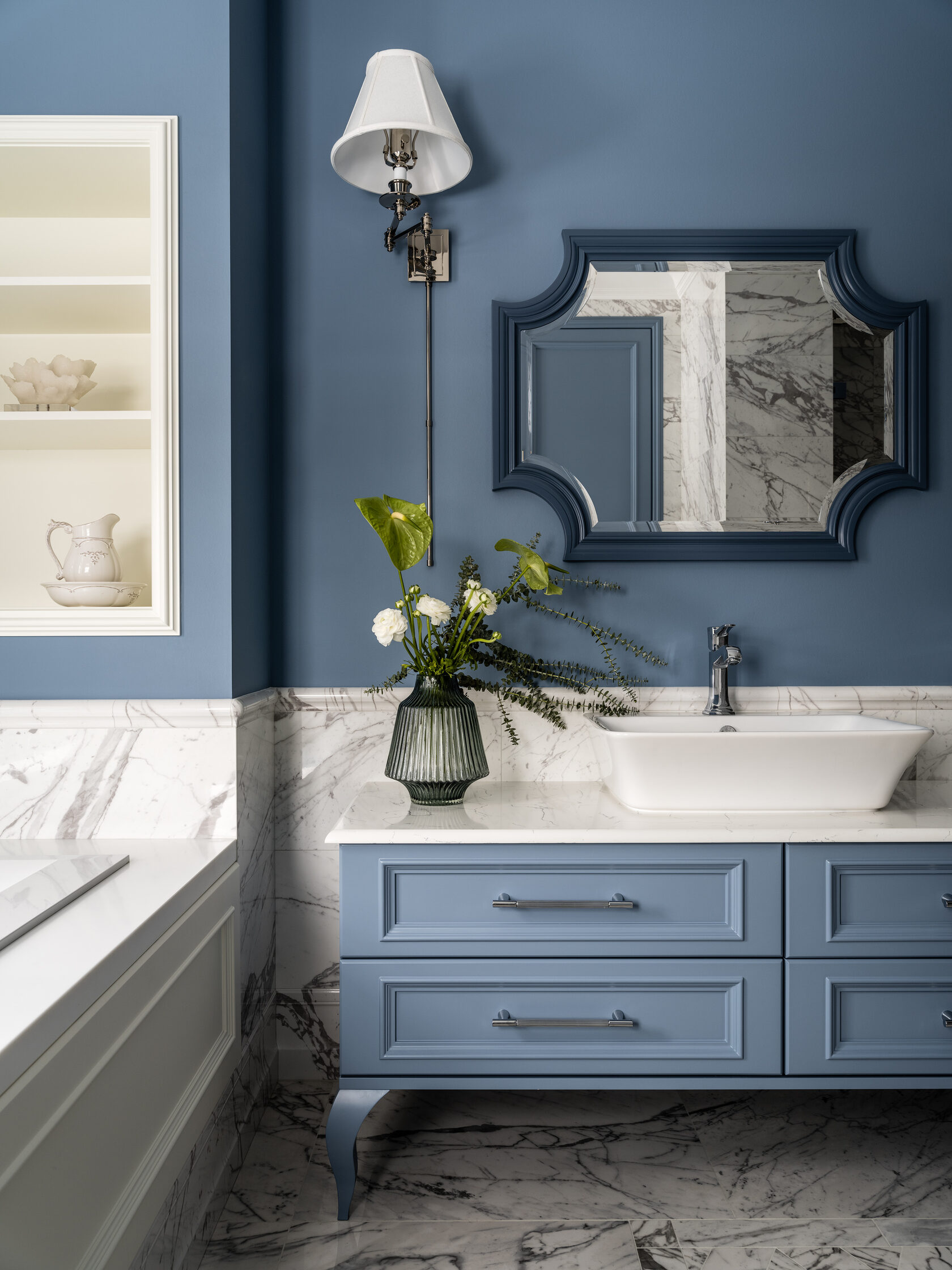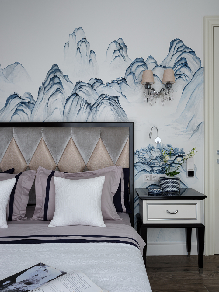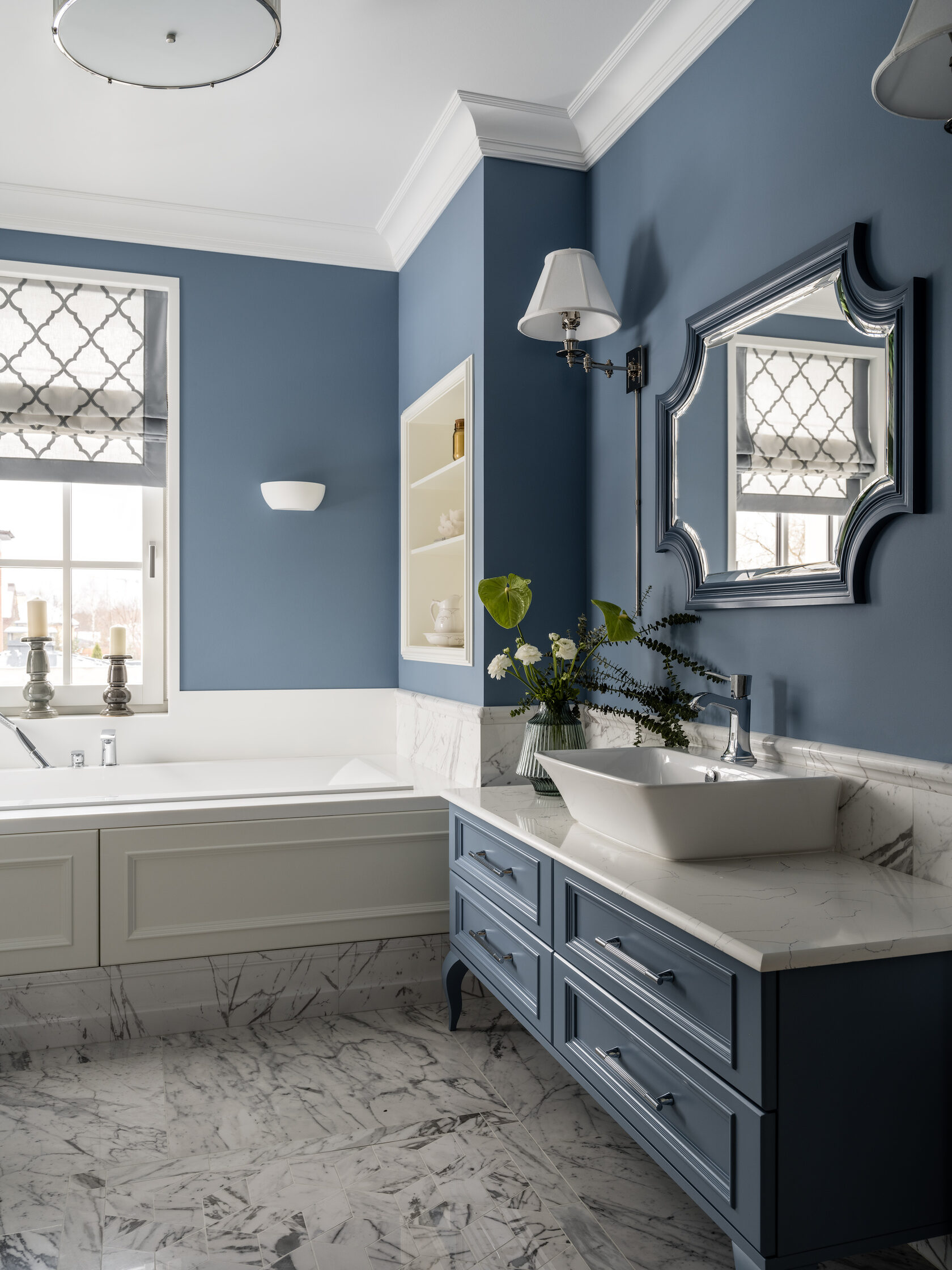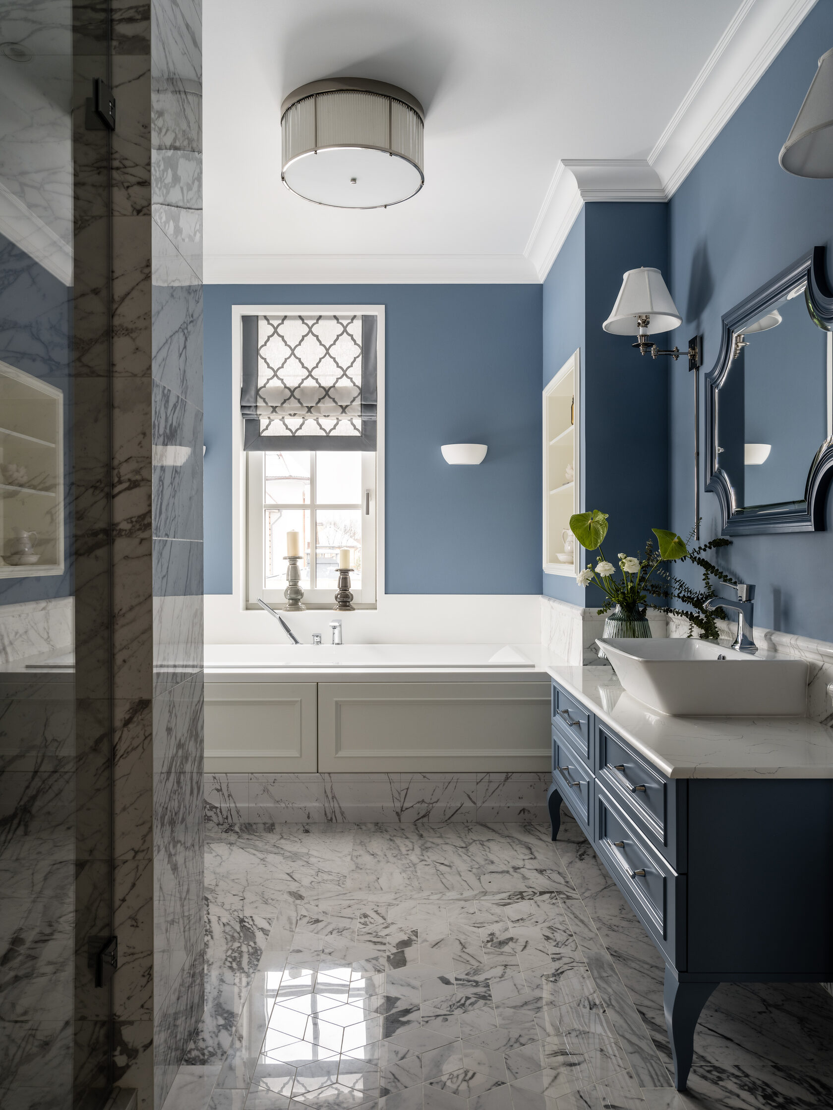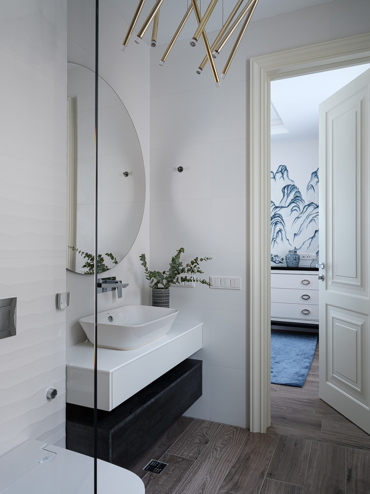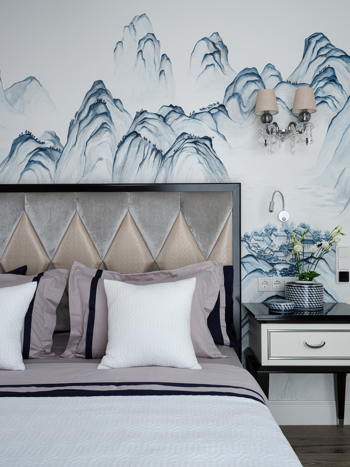 Спальня и санузел: стиль "Гжель" Спальня и санузел стали ключевыми зонами, где стиль "Гжель" раскрывается в полной мере. Бело-голубые орнаменты, характерные для этого направления, украшают стены, текстиль и декоративные элементы. Эти детали создают ощущение легкости и чистоты, одновременно отсылая к традиционному русскому искусству.