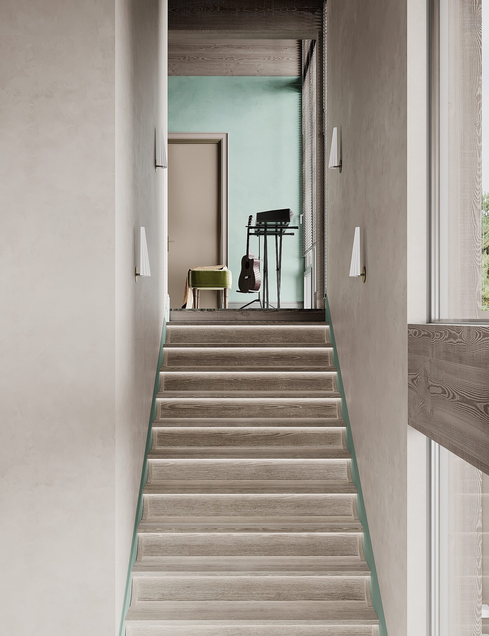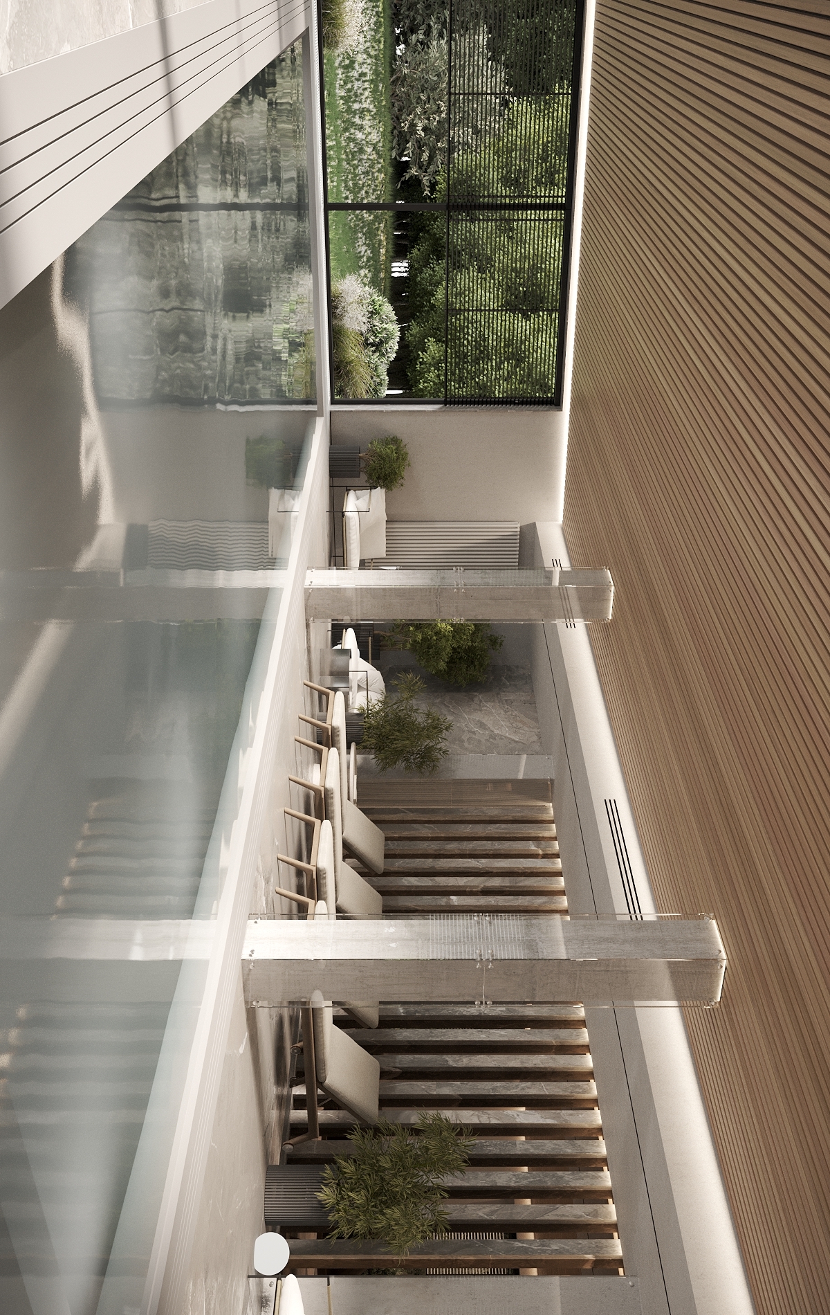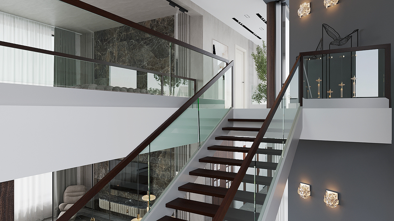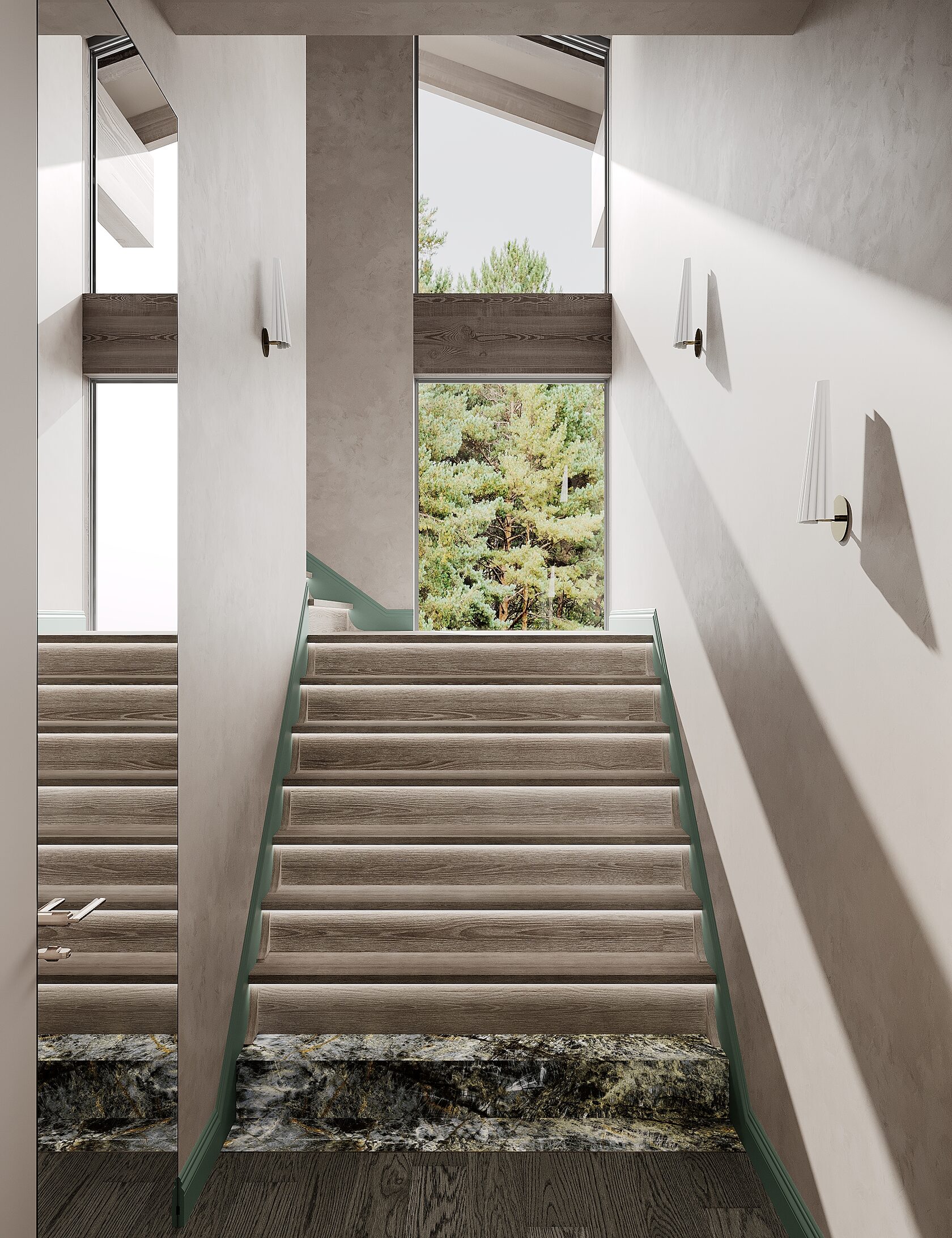 Концепция: Проект строится на идее движения и открытости. Лестница без ограждений становится символом смелости и современного взгляда на архитектуру. Панорамное остекление, динамичные формы и натуральные материалы создают ощущение текучести и лёгкости, наполняя дом светом. Пространство организовано так, чтобы каждая зона соответствовала ритму жизни семьи — от гостеприимства до приватности.