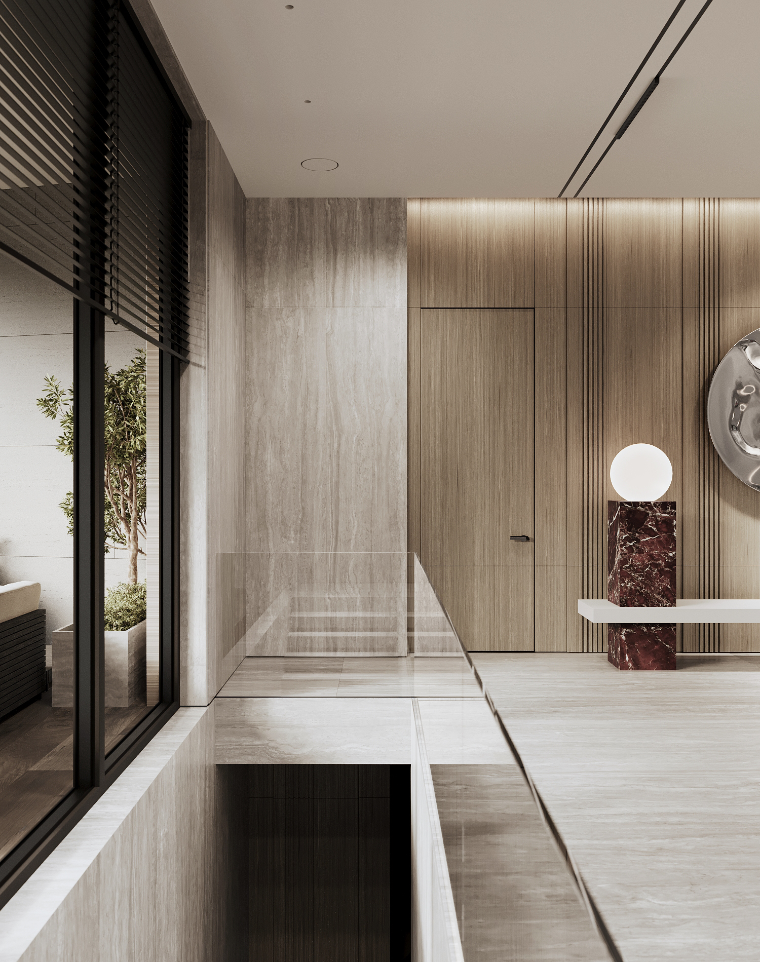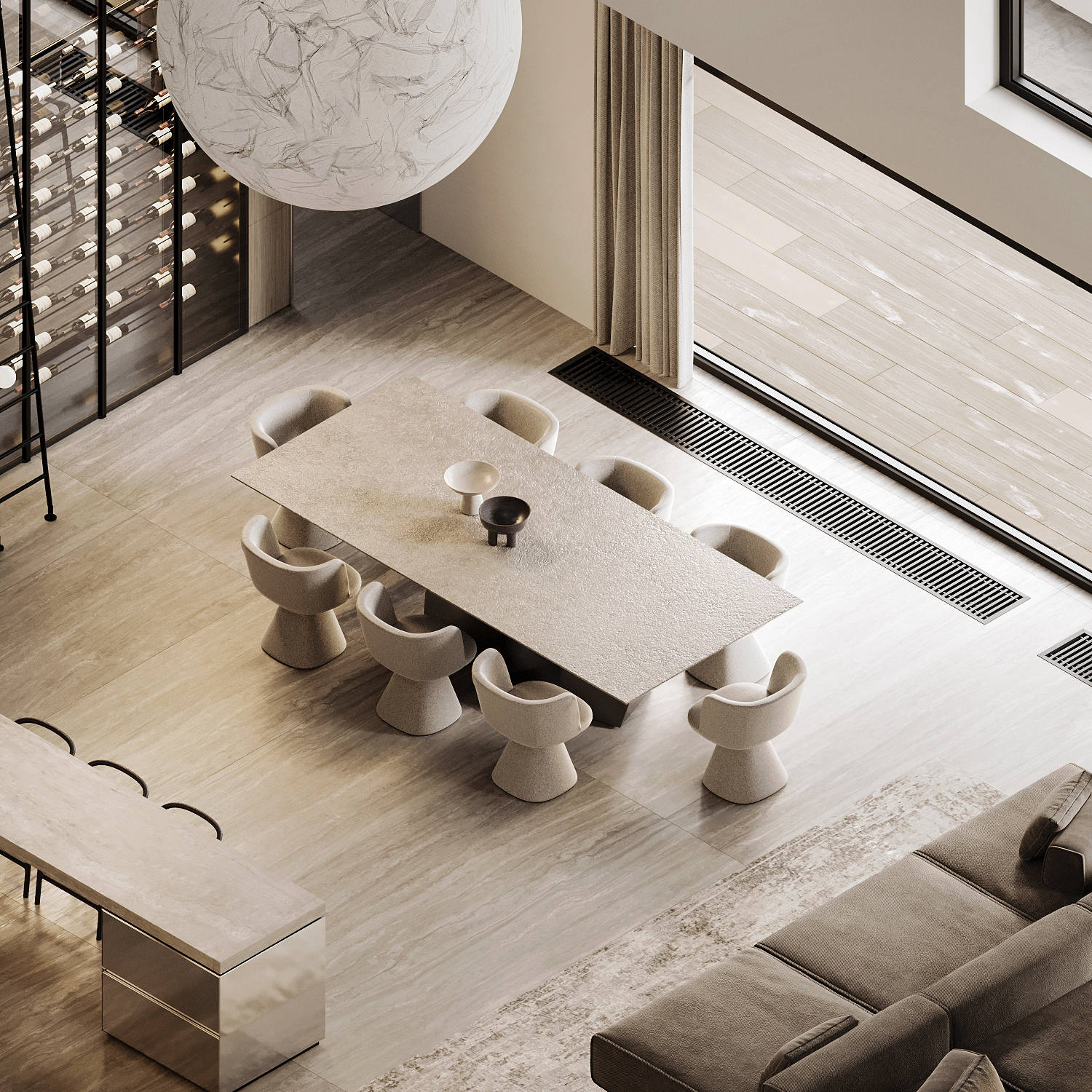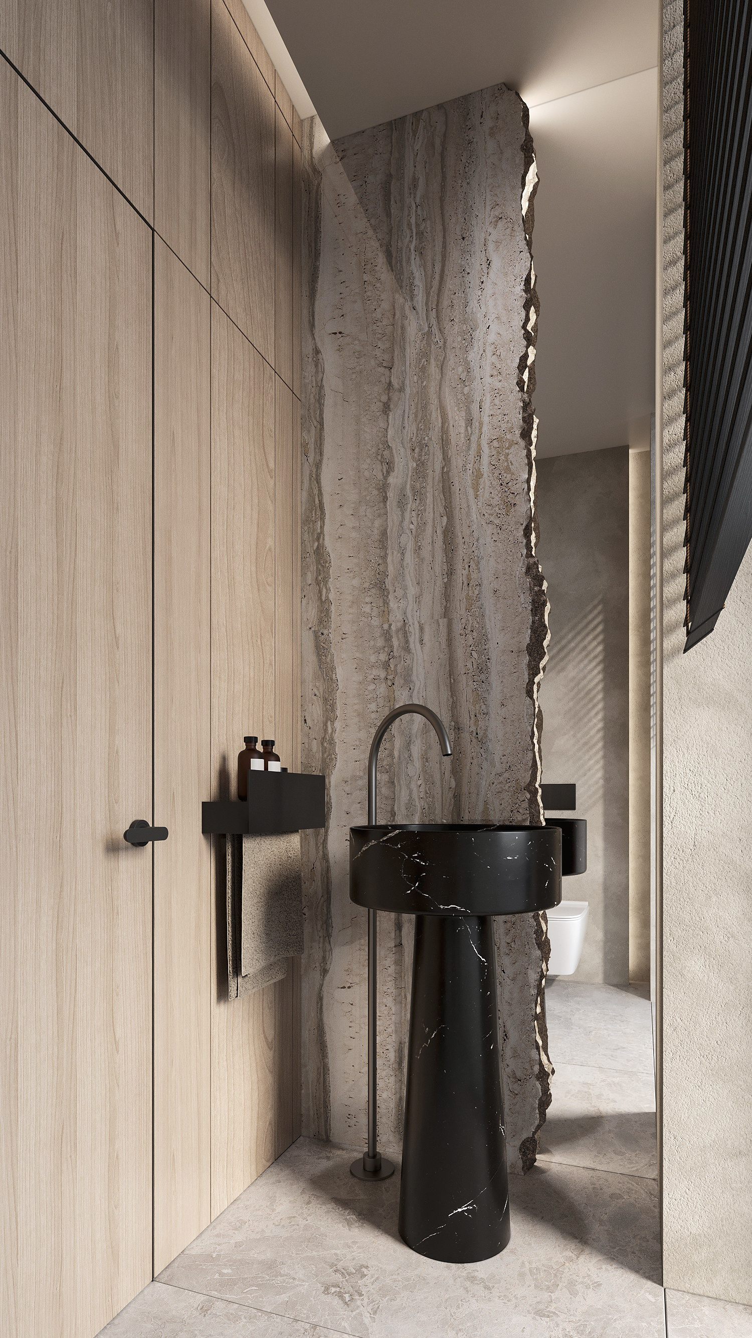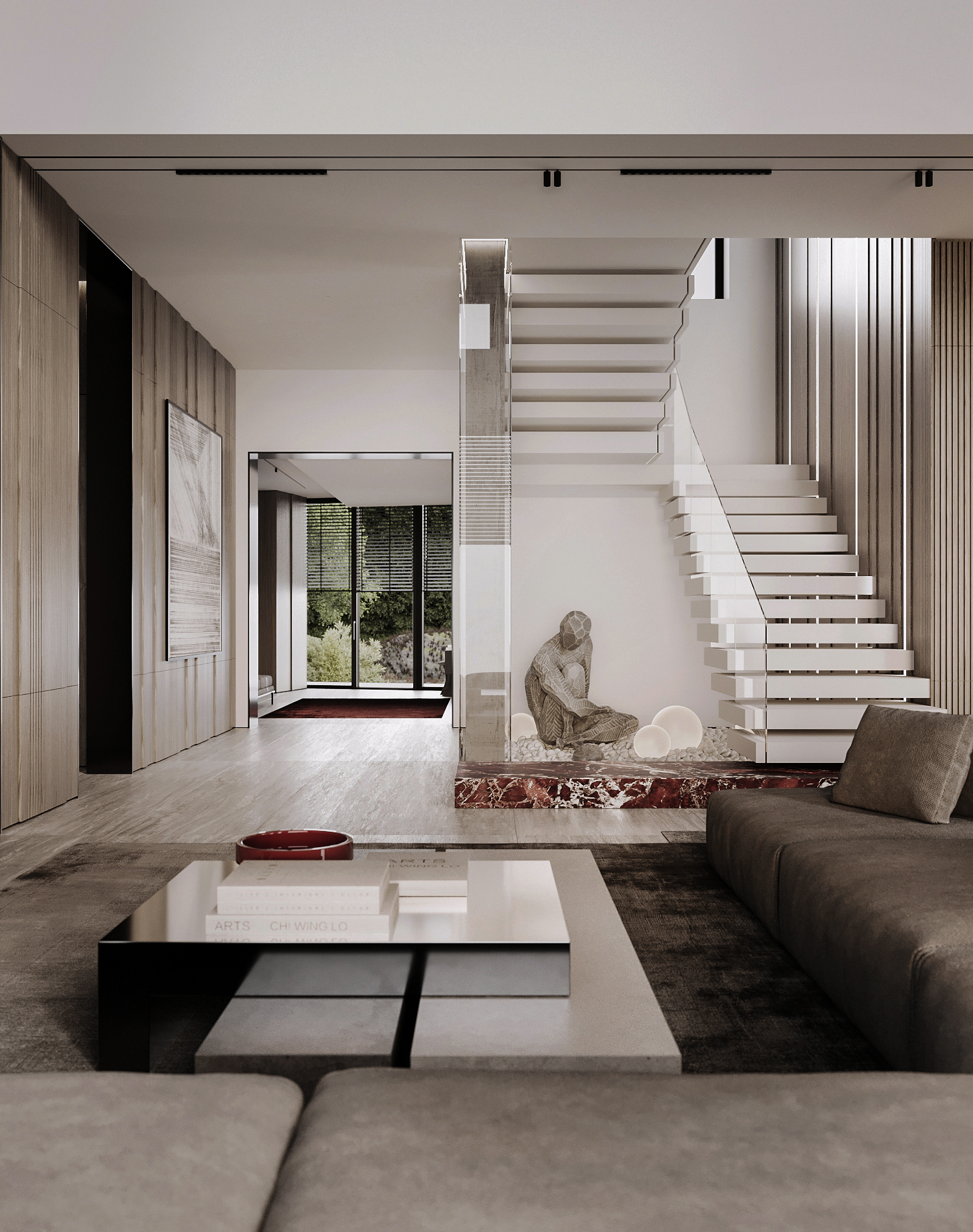 Концепция: Основная идея проекта — создание пространства, где архитектурная брутальность форм сочетается с минималистичной элегантностью. Ключевой материал, натуральный травертин, плавно переходит из экстерьера в интерьер, создавая единство. В сочетании с натуральным дубом и белой штукатуркой, он формирует чистую, неперегруженную палитру. Отказ от избыточных текстур подчеркивает графичность и силу объемов, обеспечивая ощущение простора и современности.