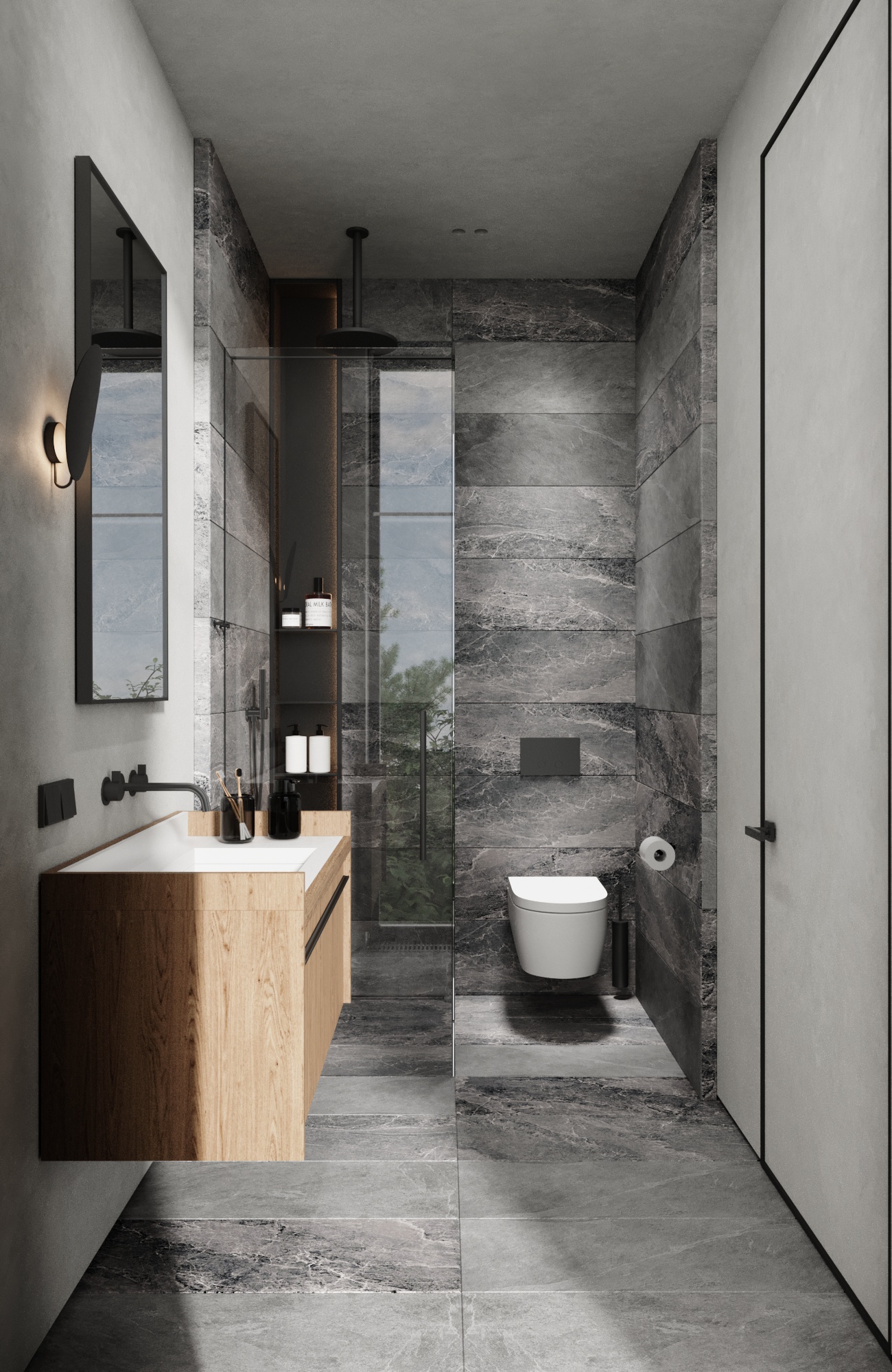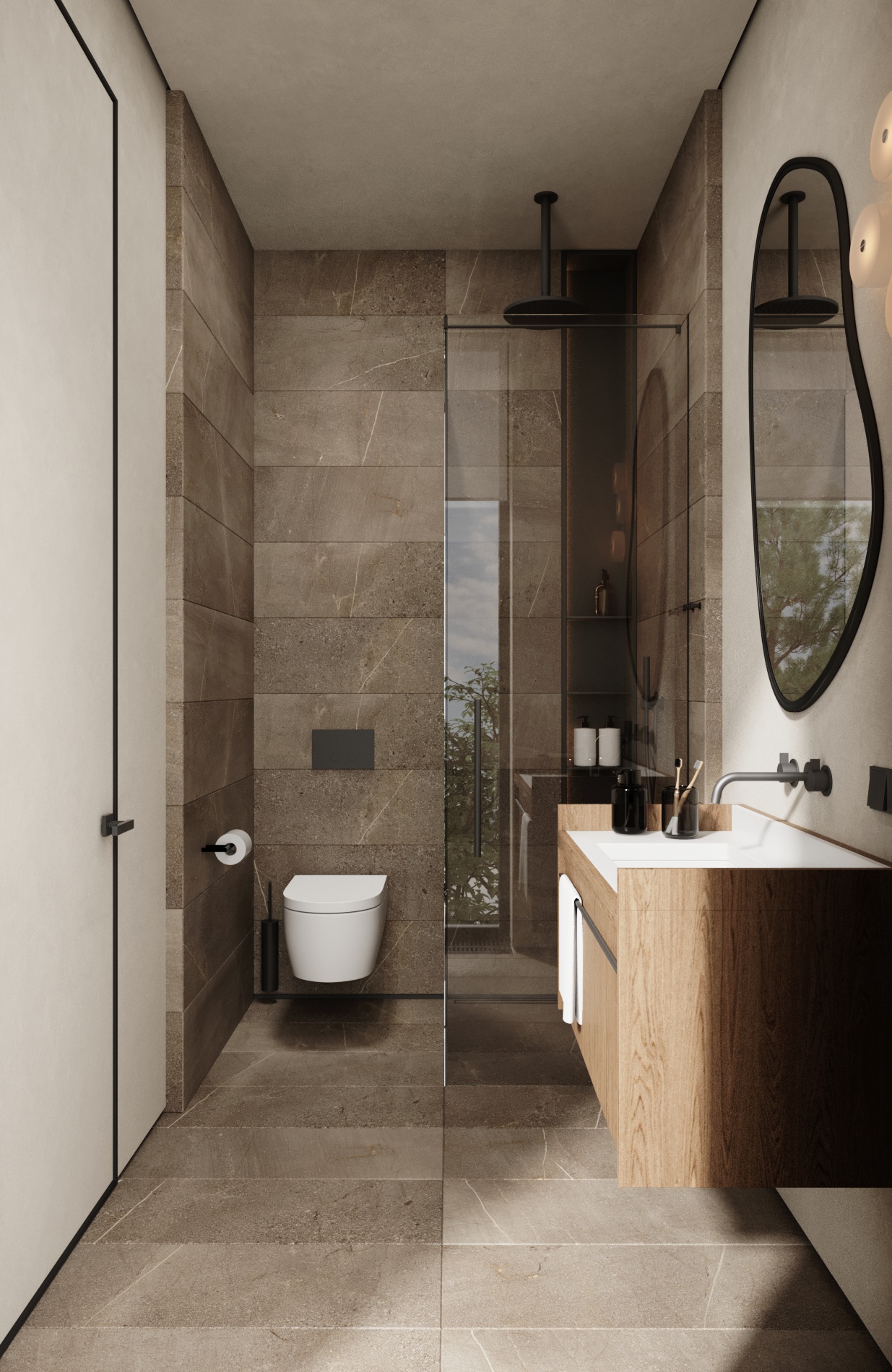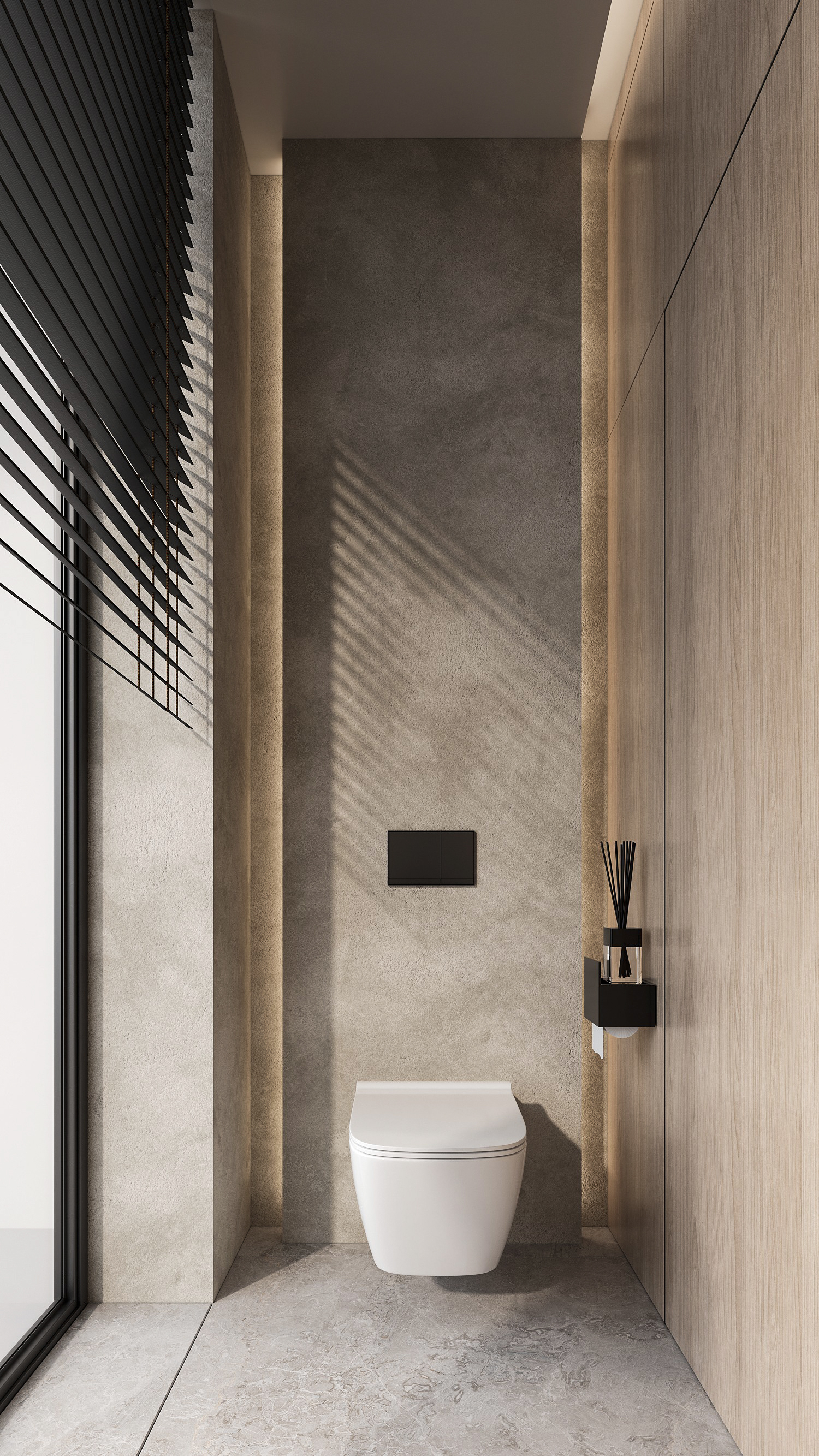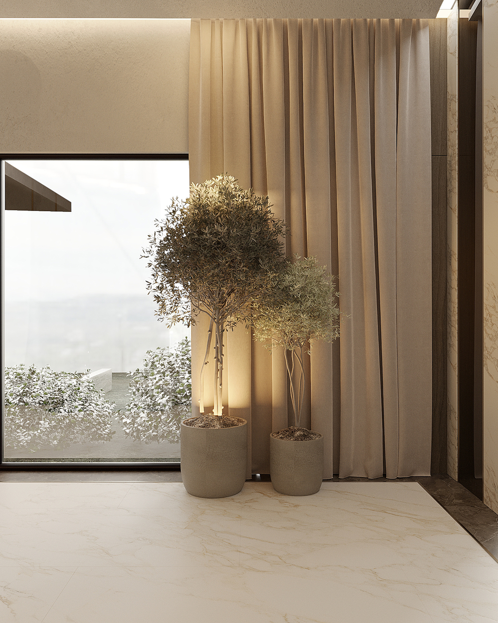 Концепция: Основная идея проекта — создание пространства, где архитектурная брутальность форм сочетается с минималистичной элегантностью. Ключевой материал, натуральный травертин, плавно переходит из экстерьера в интерьер, создавая единство. В сочетании с натуральным дубом и белой штукатуркой, он формирует чистую, неперегруженную палитру. Отказ от избыточных текстур подчеркивает графичность и силу объемов, обеспечивая ощущение простора и современности.