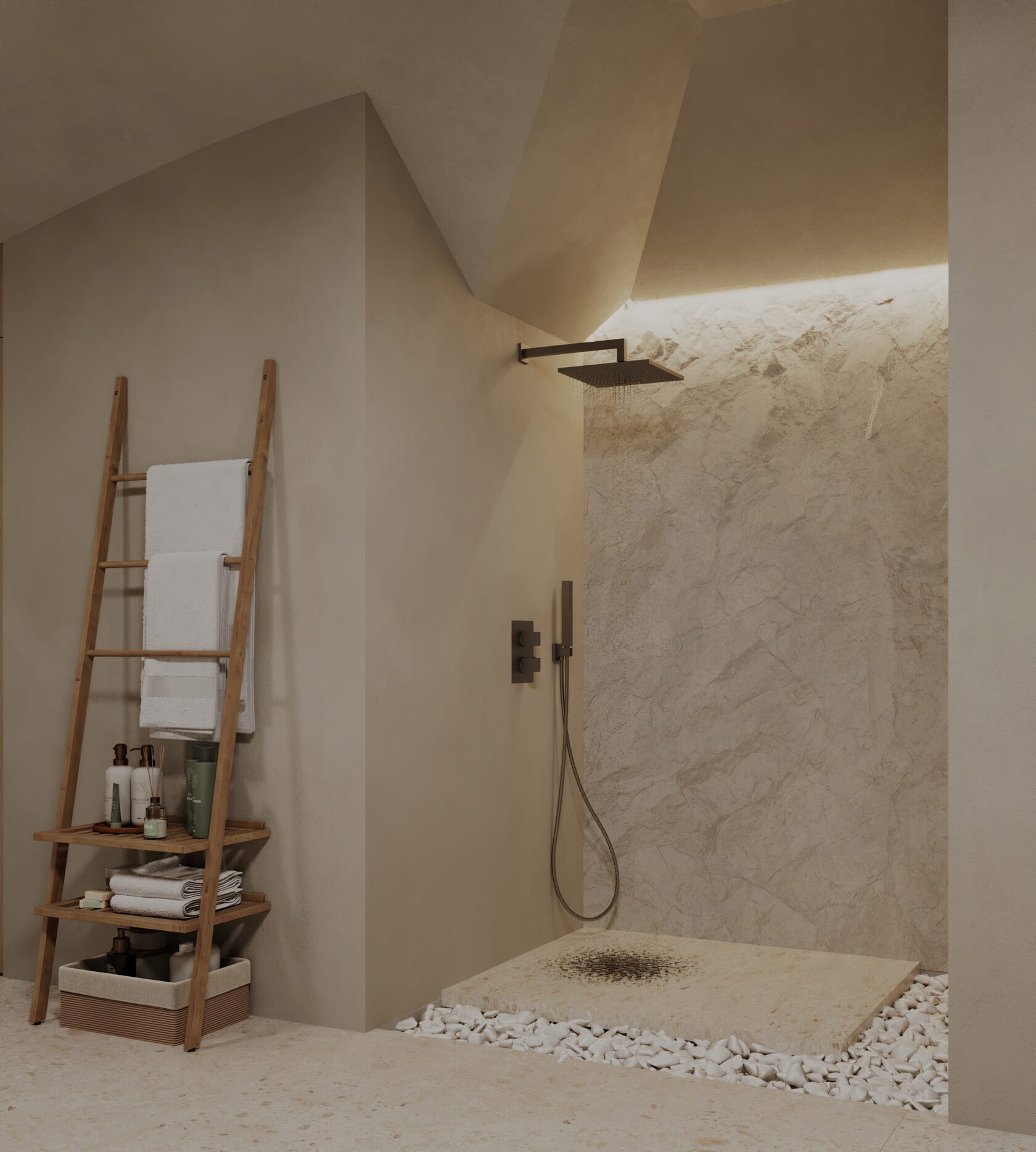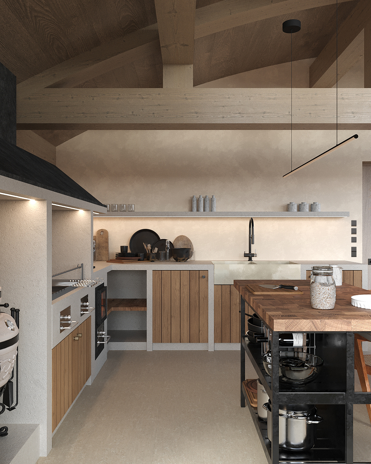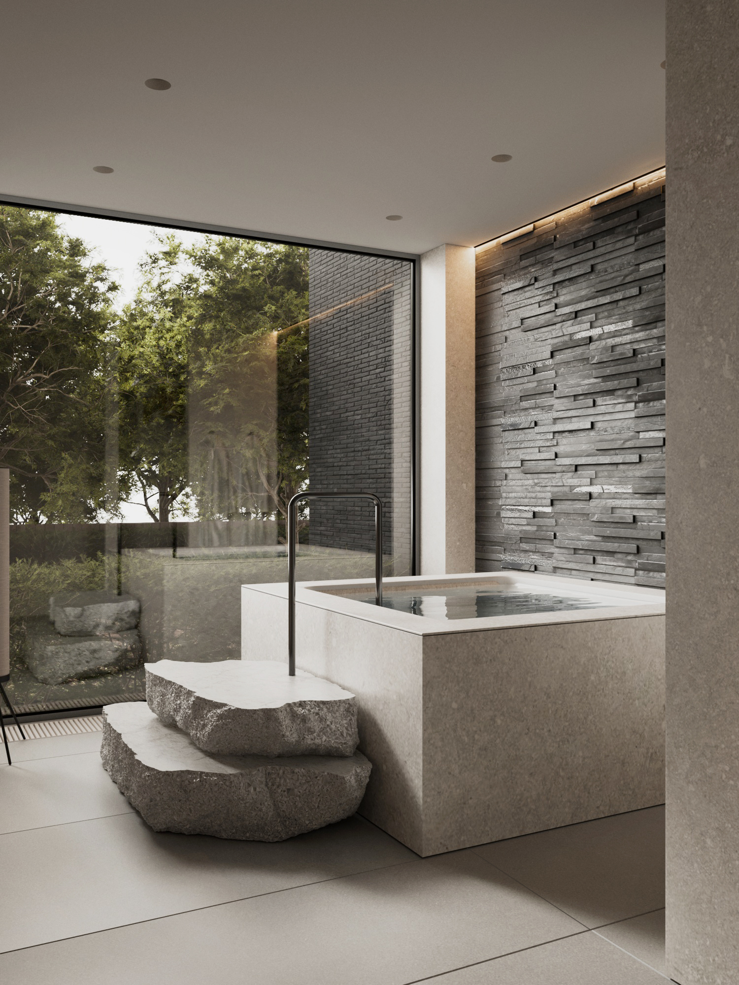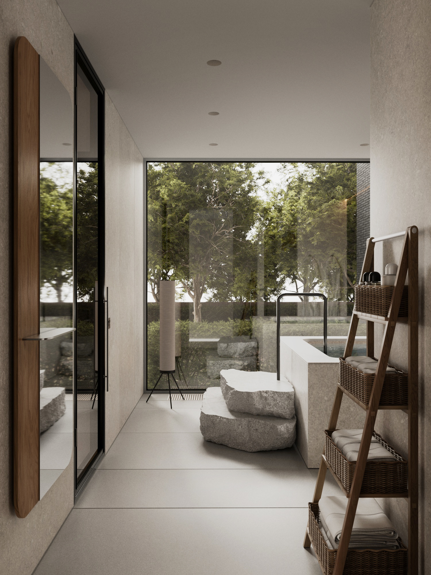 Концепция: Основная идея проекта — создание пространства, где архитектурная брутальность форм сочетается с минималистичной элегантностью. Ключевой материал, натуральный травертин, плавно переходит из экстерьера в интерьер, создавая единство. В сочетании с натуральным дубом и белой штукатуркой, он формирует чистую, неперегруженную палитру. Отказ от избыточных текстур подчеркивает графичность и силу объемов, обеспечивая ощущение простора и современности.