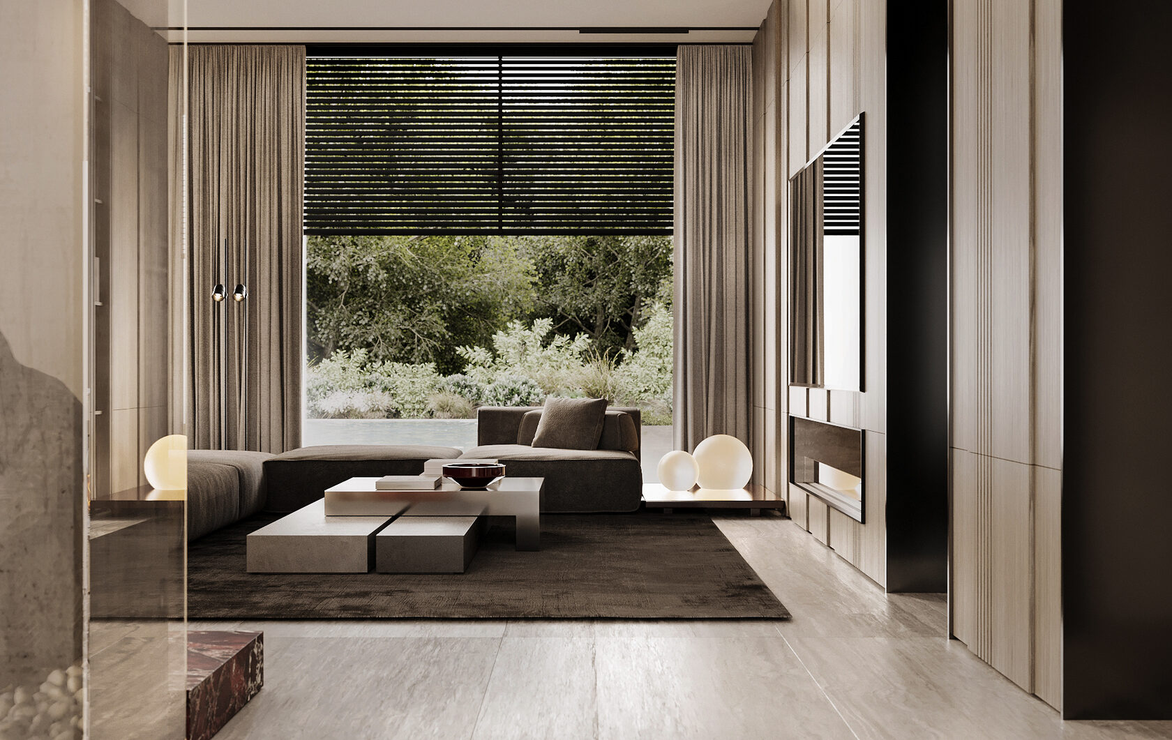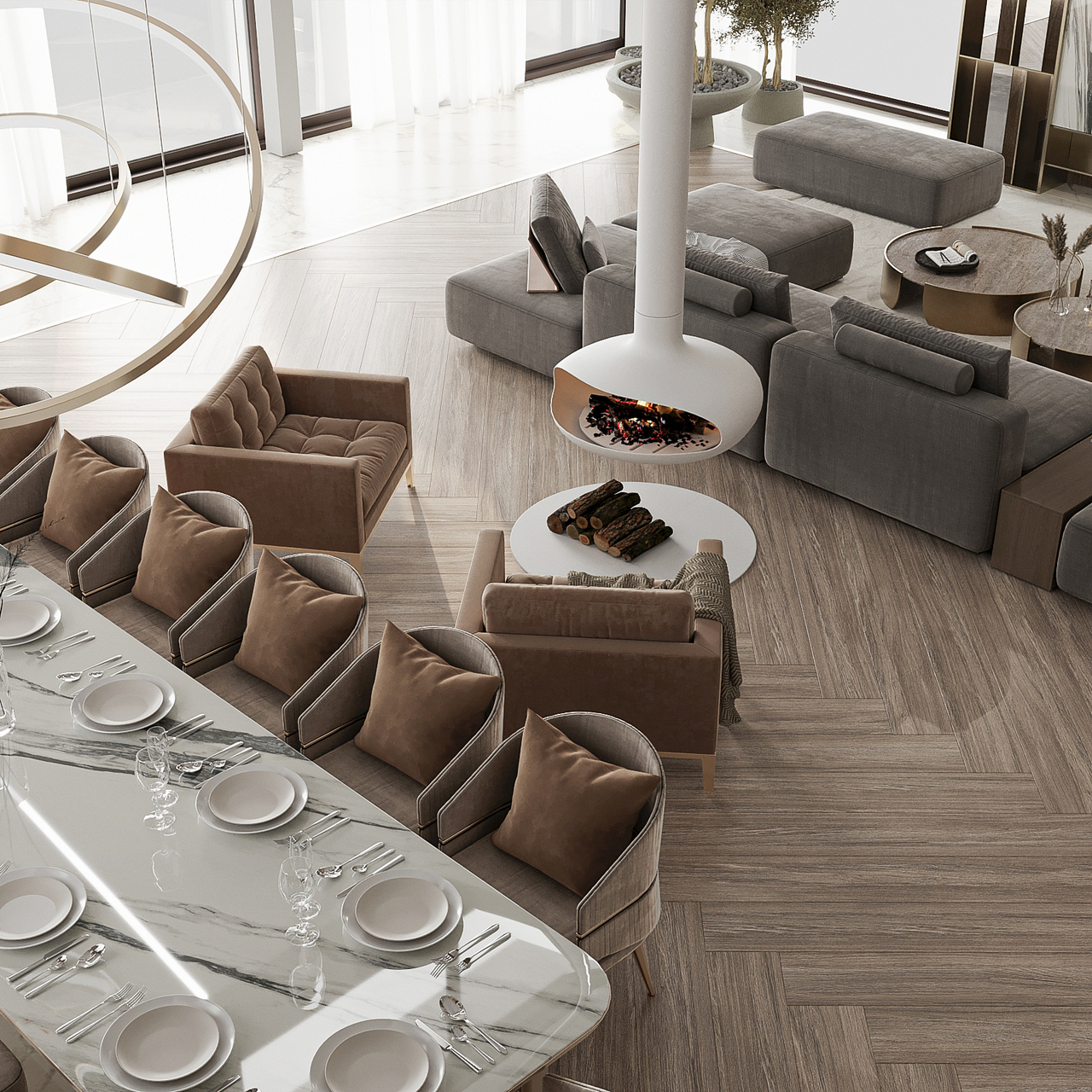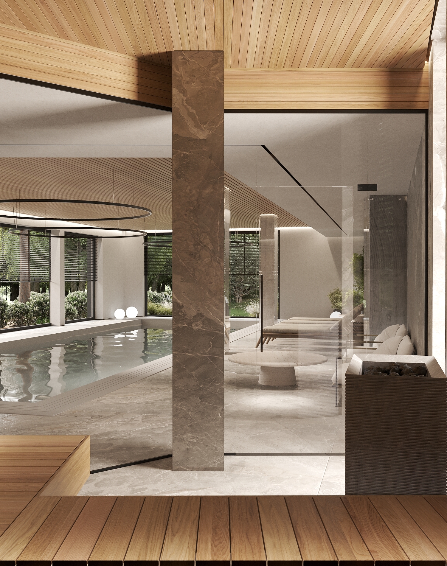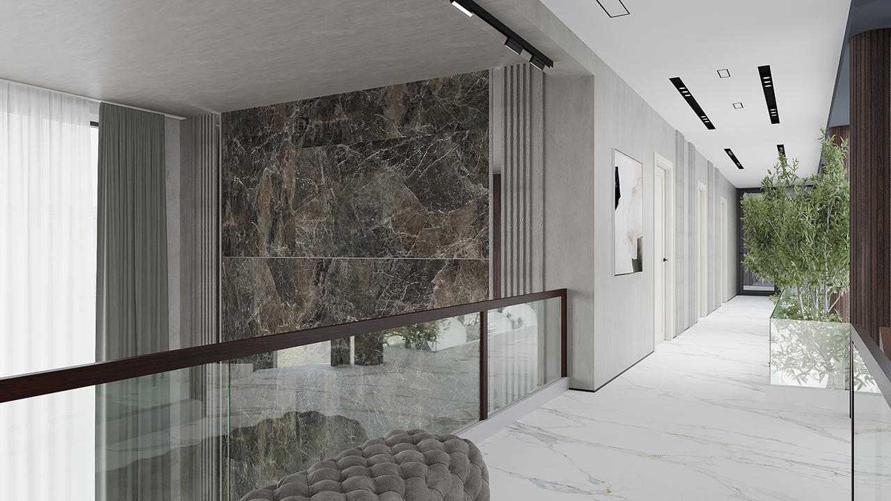 Дизайн и концепция Главной задачей проекта было сохранить деревянную отделку, уже присутствующую в интерьере, и при этом добавить актуальности и строгости, характерных для современных вилл. Наряду с деревом в отделке использованы каменные фактуры: керамогранит в санузлах, натуральный травертин в галереях и спальнях, а также металлические акценты под бронзу в корпусной мебели. Эти материалы создают баланс между природной теплотой и урбанистической строгостью. Интерьер наполнен лаконичной мебелью и освещением от ведущих европейских брендов, что делает каждое помещение цельным и функциональным.
