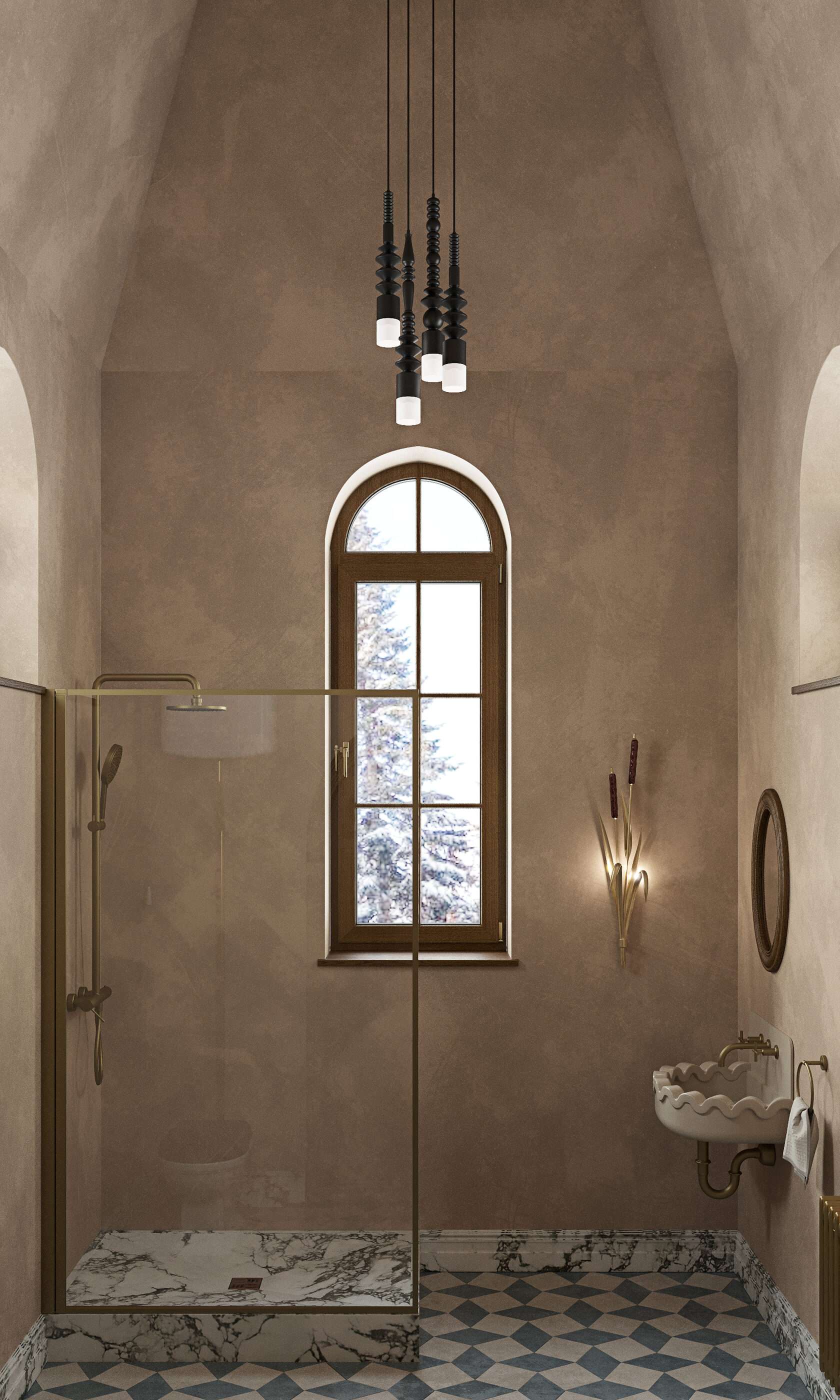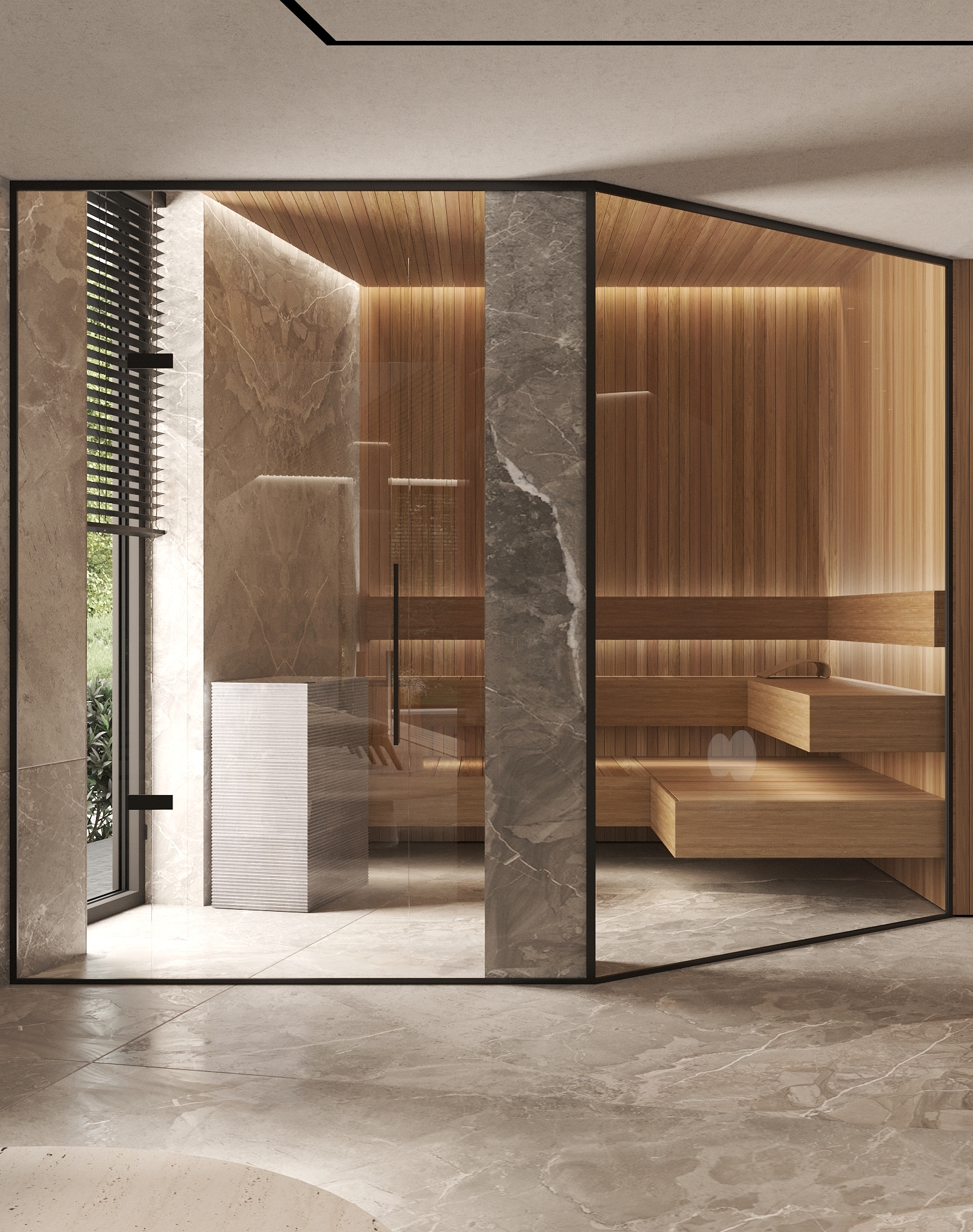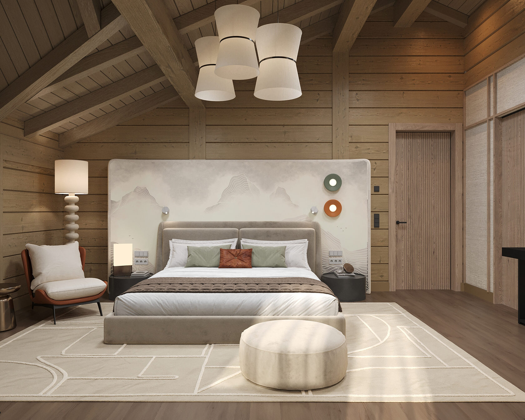 Дизайн и концепция Главной задачей проекта было сохранить деревянную отделку, уже присутствующую в интерьере, и при этом добавить актуальности и строгости, характерных для современных вилл. Наряду с деревом в отделке использованы каменные фактуры: керамогранит в санузлах, натуральный травертин в галереях и спальнях, а также металлические акценты под бронзу в корпусной мебели. Эти материалы создают баланс между природной теплотой и урбанистической строгостью. Интерьер наполнен лаконичной мебелью и освещением от ведущих европейских брендов, что делает каждое помещение цельным и функциональным.