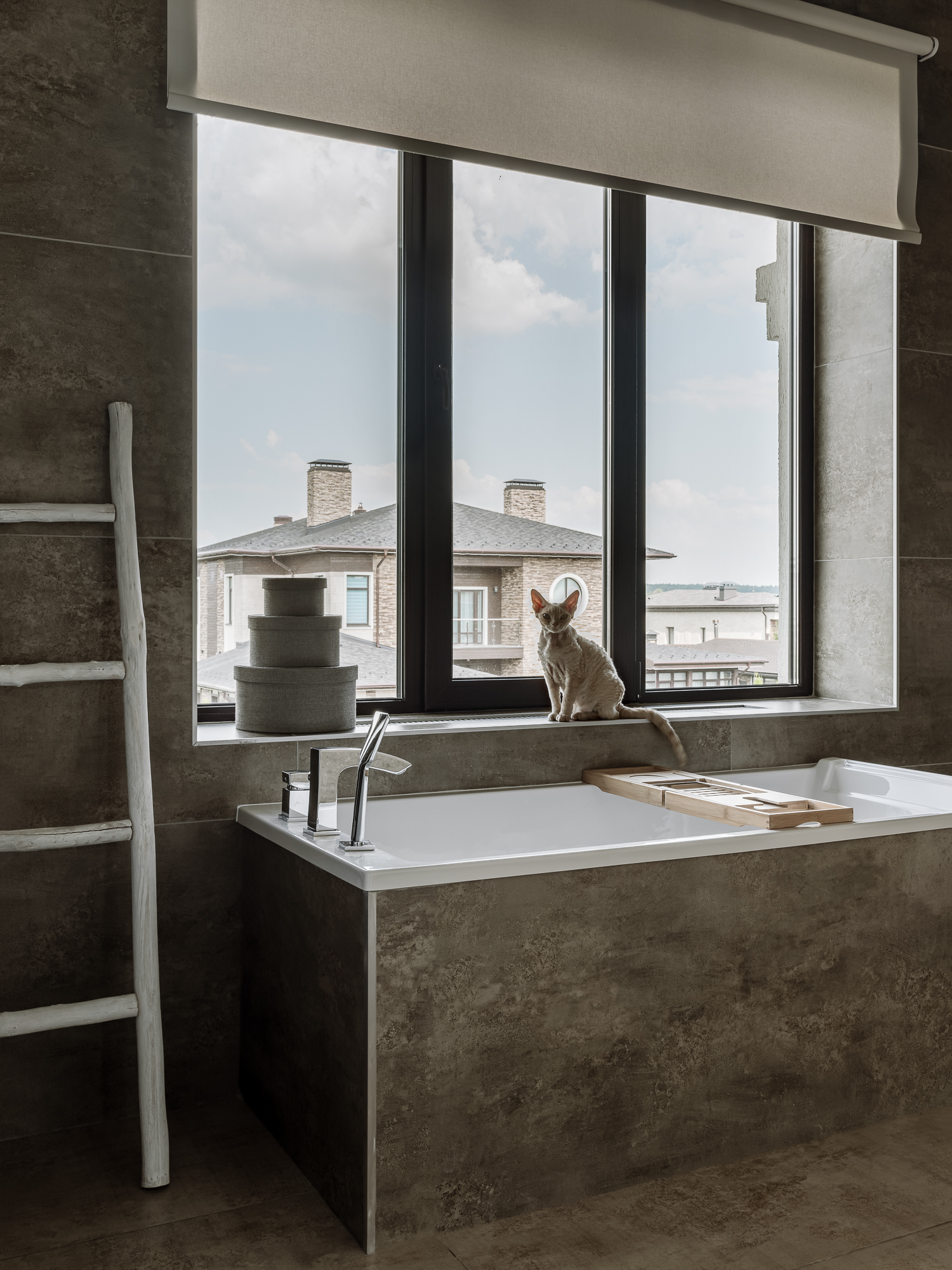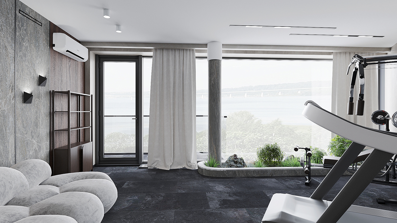 Проект разработан для молодой семьи, где глава — заслуженный мастер спорта по боксу. Основной запрос — минималистичный интерьер с ощущением простора, обилием света и воздуха. Архитектура дома с панорамными окнами в пол и выходами на террасы стала основой для внутреннего пространства.