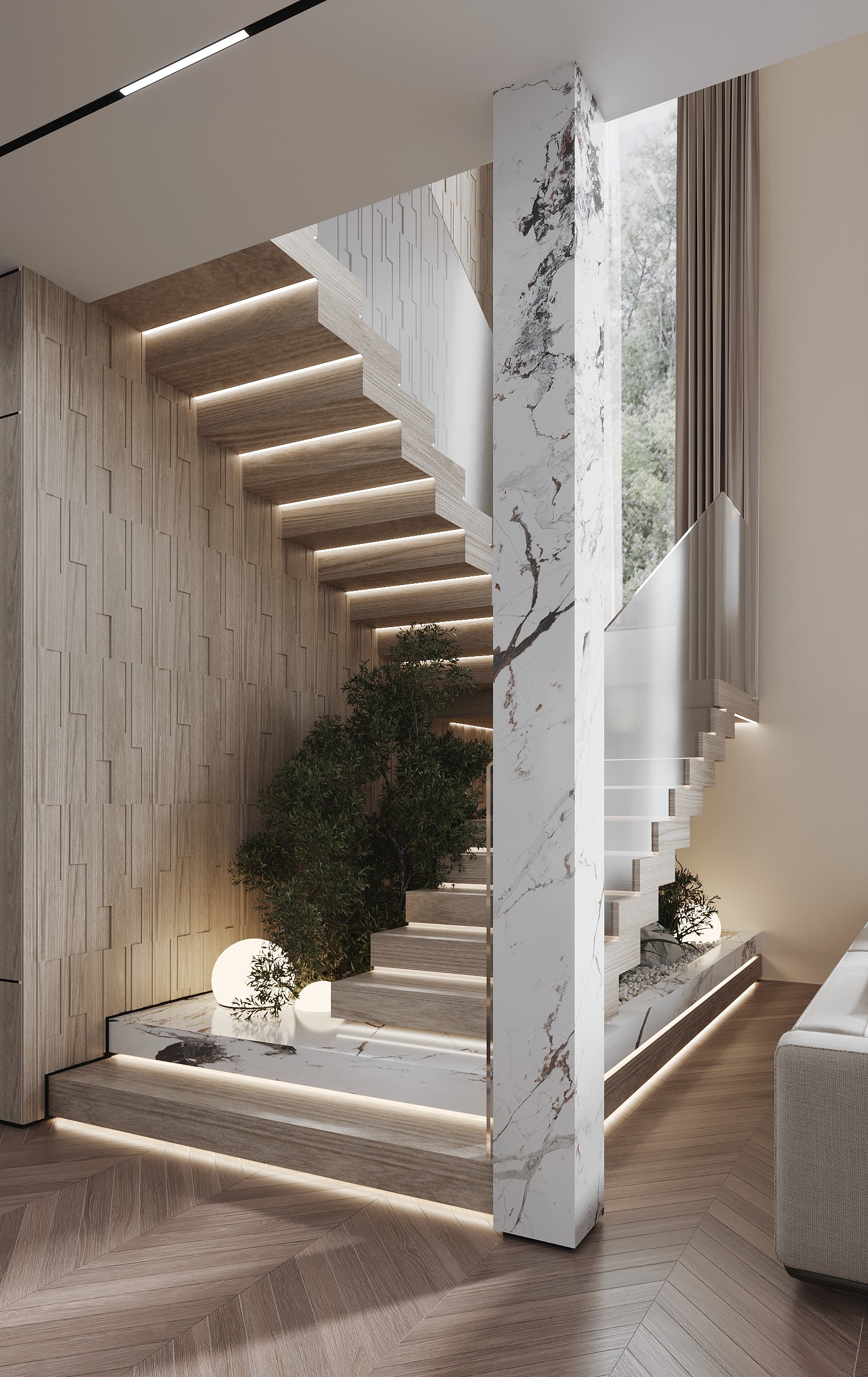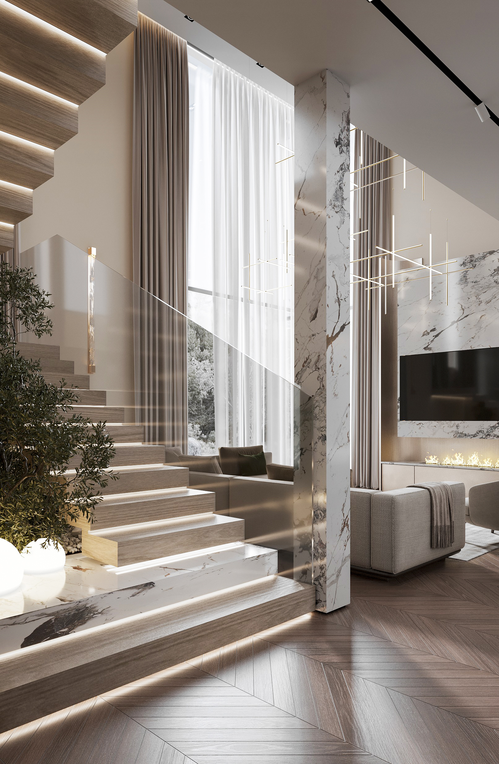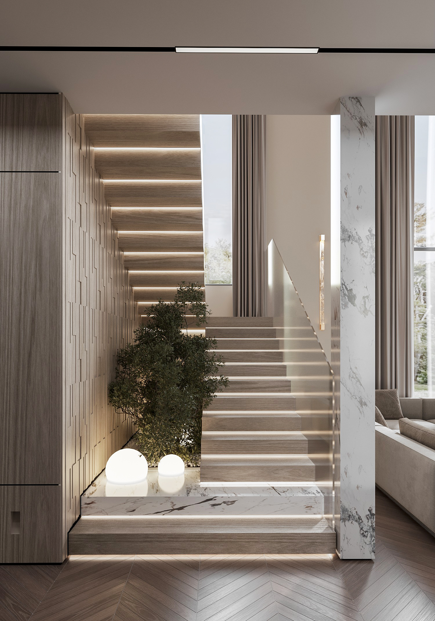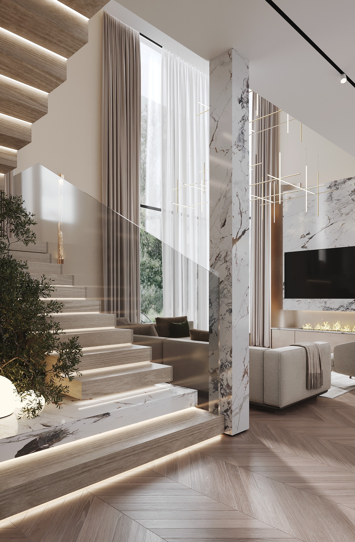Концепция: Центральной идеей проекта является создание многослойного пространства, где каждый элемент взаимодействует со светом, превращая его в динамичного художника интерьера. Осью композиции выступает грандиозная лестница, виртуозно зонирующая дом на приватные и общественные зоны. Концепция подчеркивает тонкую проработку световых сценариев, глубокую интеграцию функциональных решений (как, например, трансформация вытяжки в арт-объект) и использование встроенной мебели для поддержания чистоты линий. Каждый уголок, от интимных детских комнат до роскошной мастер-спальни и уединенного кабинета, спроектирован с учетом индивидуальных потребностей и вневременной эстетики, обеспечивая уникальный пользовательский опыт.