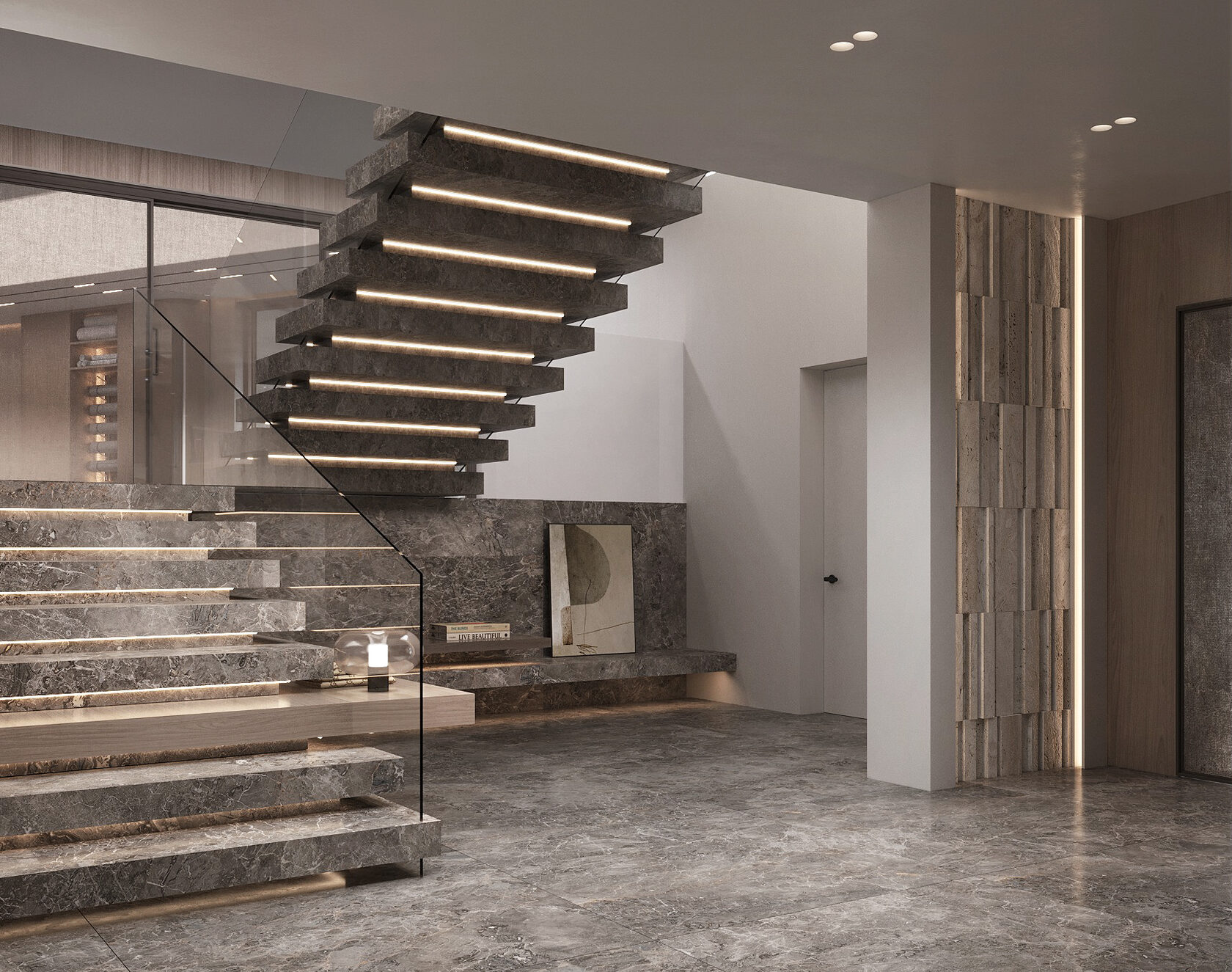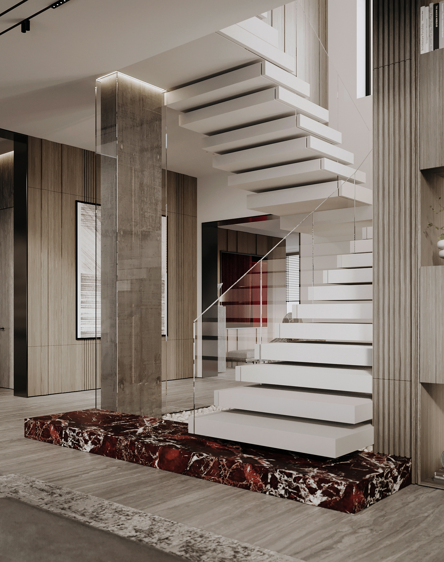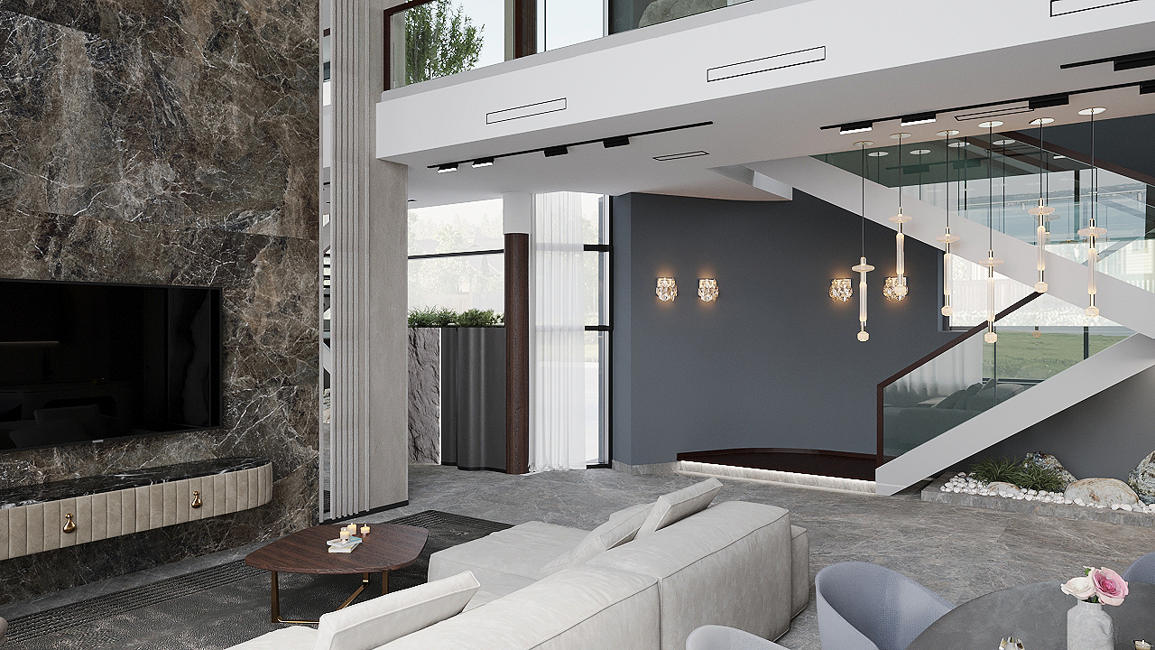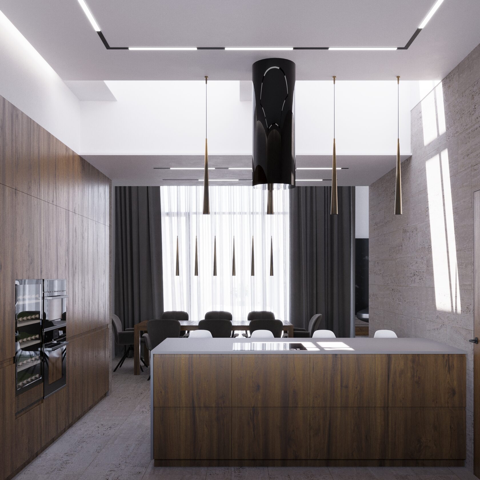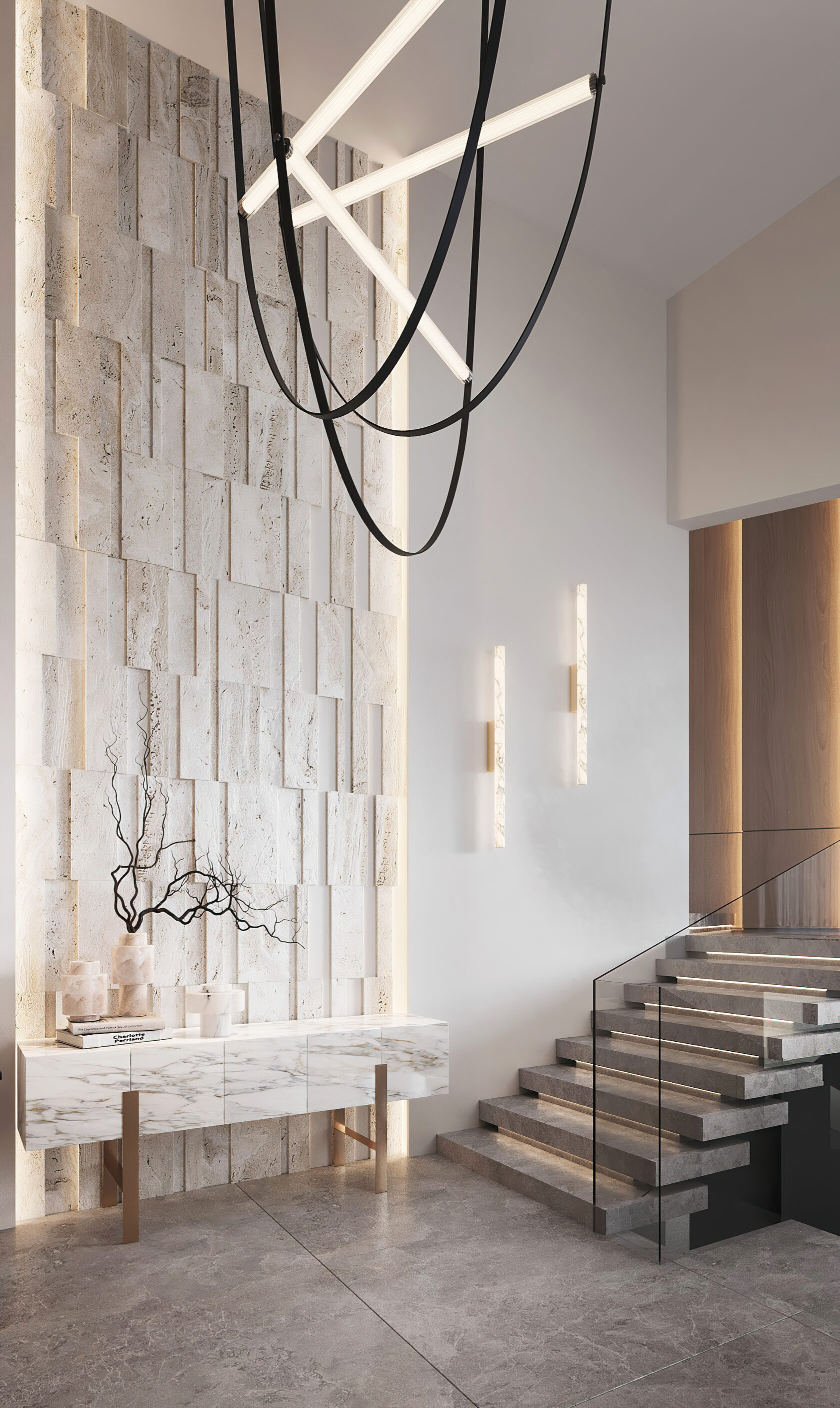 Концепция: Центральной идеей проекта является создание многослойного пространства, где каждый элемент взаимодействует со светом, превращая его в динамичного художника интерьера. Осью композиции выступает грандиозная лестница, виртуозно зонирующая дом на приватные и общественные зоны. Концепция подчеркивает тонкую проработку световых сценариев, глубокую интеграцию функциональных решений (как, например, трансформация вытяжки в арт-объект) и использование встроенной мебели для поддержания чистоты линий. Каждый уголок, от интимных детских комнат до роскошной мастер-спальни и уединенного кабинета, спроектирован с учетом индивидуальных потребностей и вневременной эстетики, обеспечивая уникальный пользовательский опыт.
