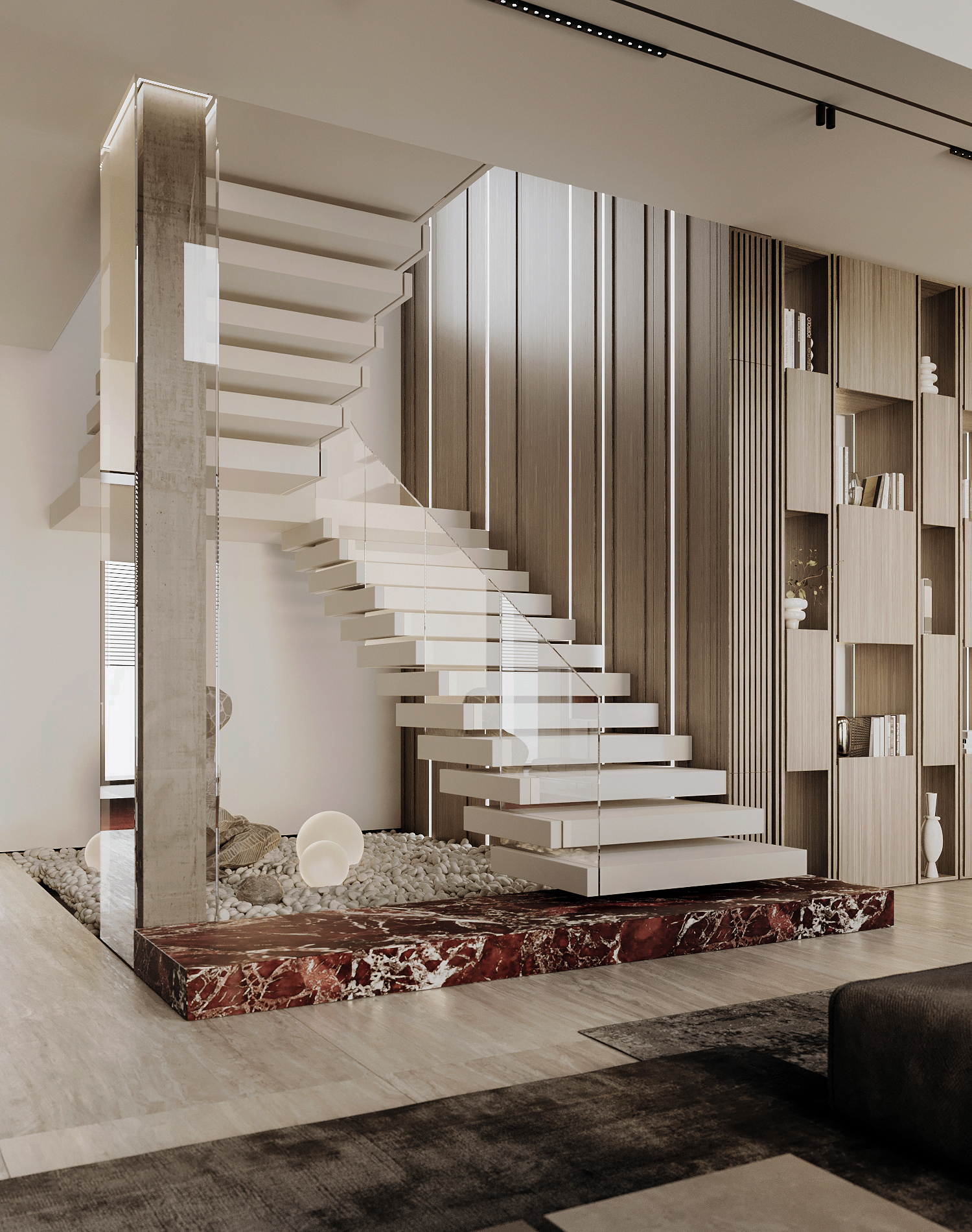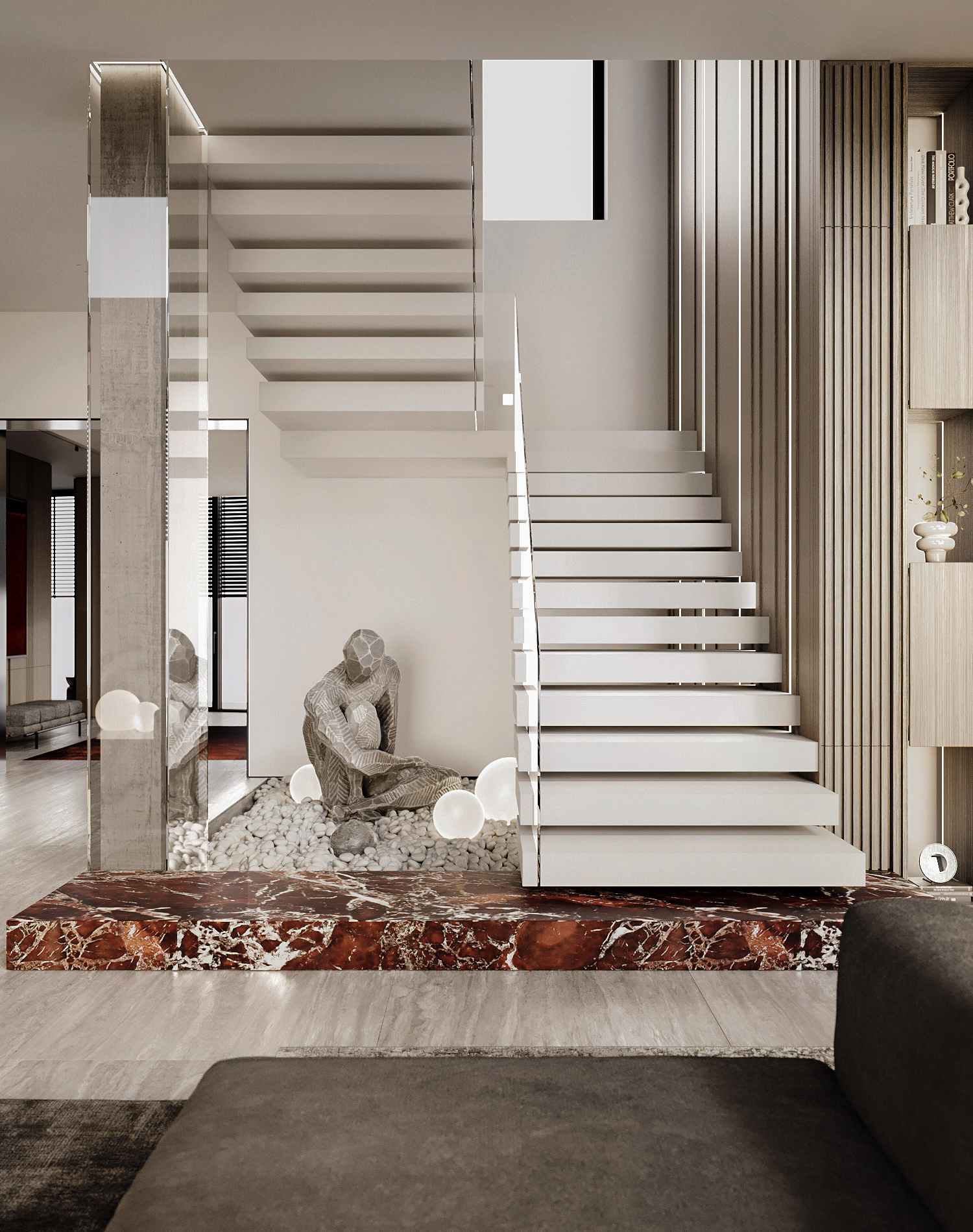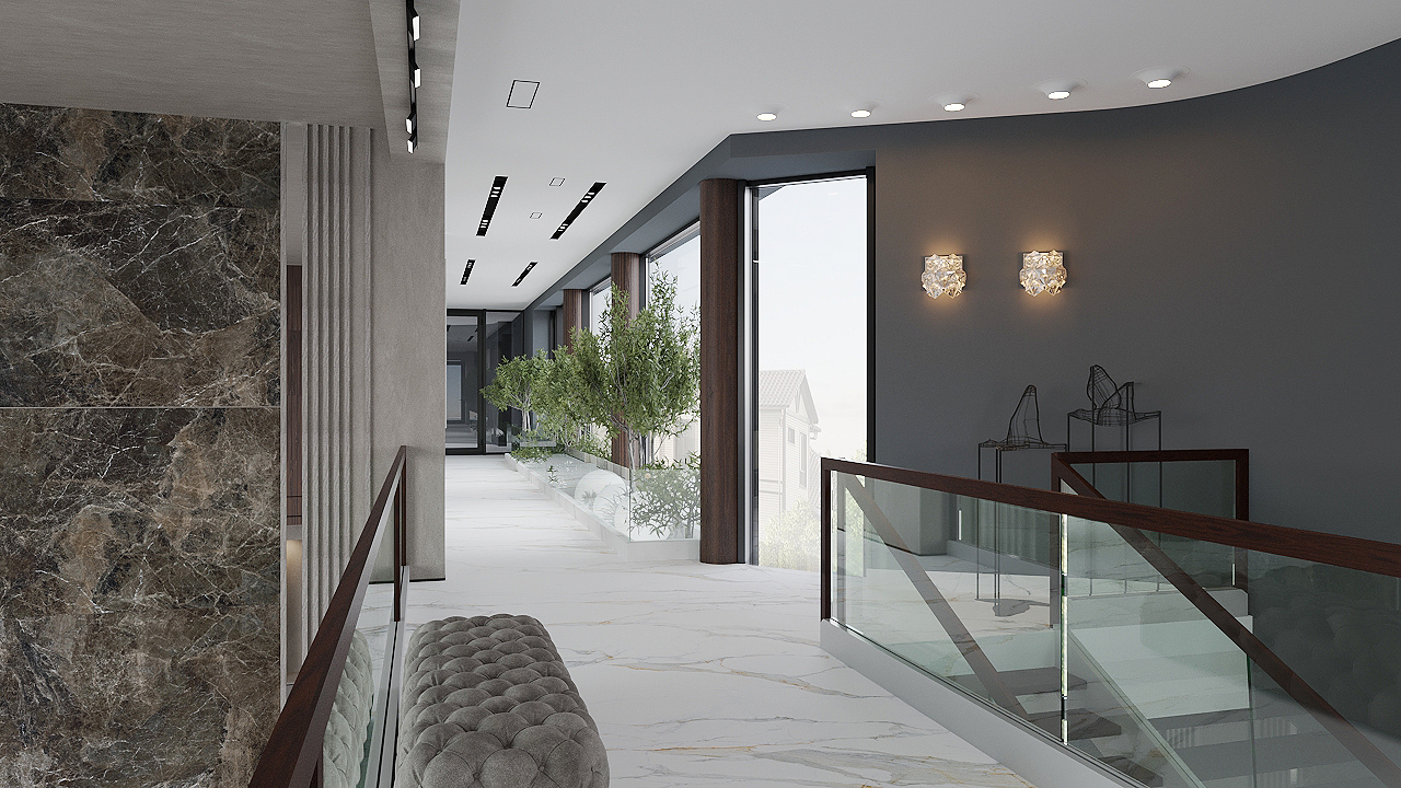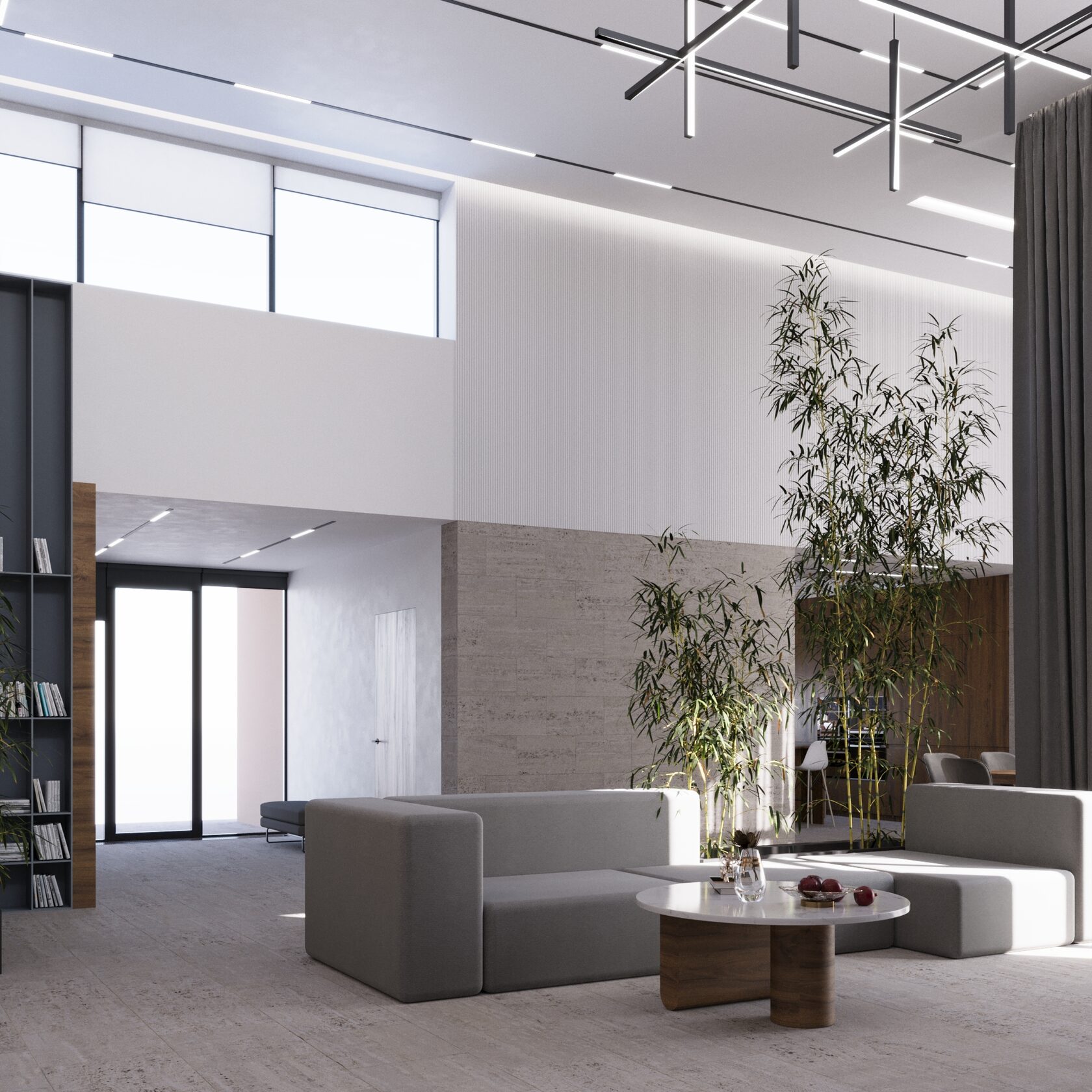 Концепция: Центральной идеей проекта является создание многослойного пространства, где каждый элемент взаимодействует со светом, превращая его в динамичного художника интерьера. Осью композиции выступает грандиозная лестница, виртуозно зонирующая дом на приватные и общественные зоны. Концепция подчеркивает тонкую проработку световых сценариев, глубокую интеграцию функциональных решений (как, например, трансформация вытяжки в арт-объект) и использование встроенной мебели для поддержания чистоты линий. Каждый уголок, от интимных детских комнат до роскошной мастер-спальни и уединенного кабинета, спроектирован с учетом индивидуальных потребностей и вневременной эстетики, обеспечивая уникальный пользовательский опыт.