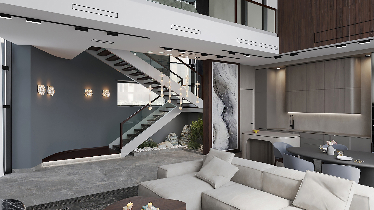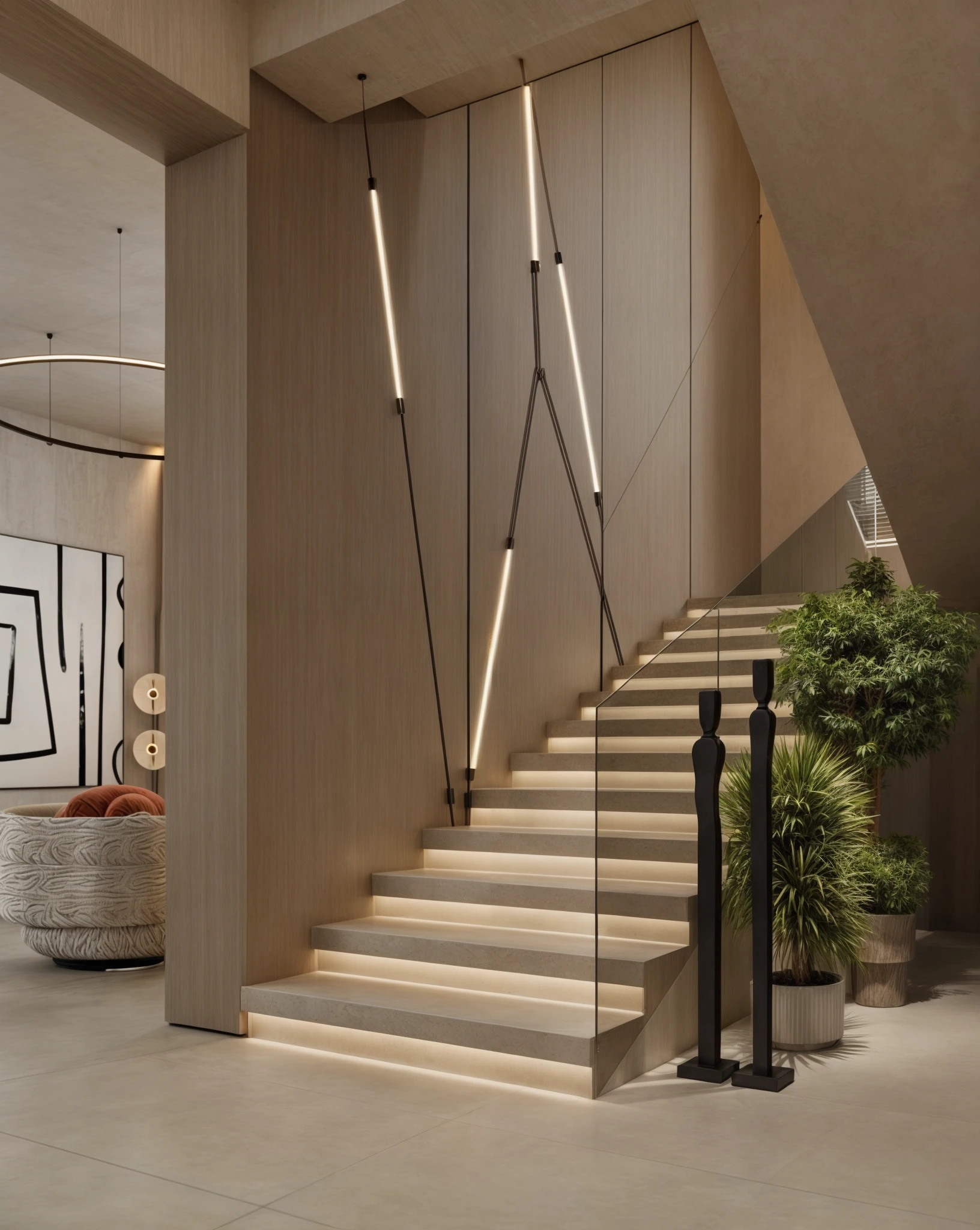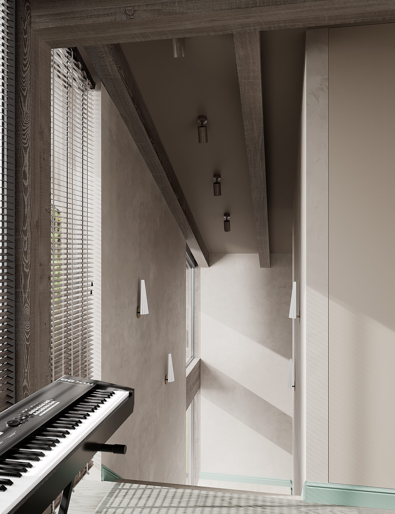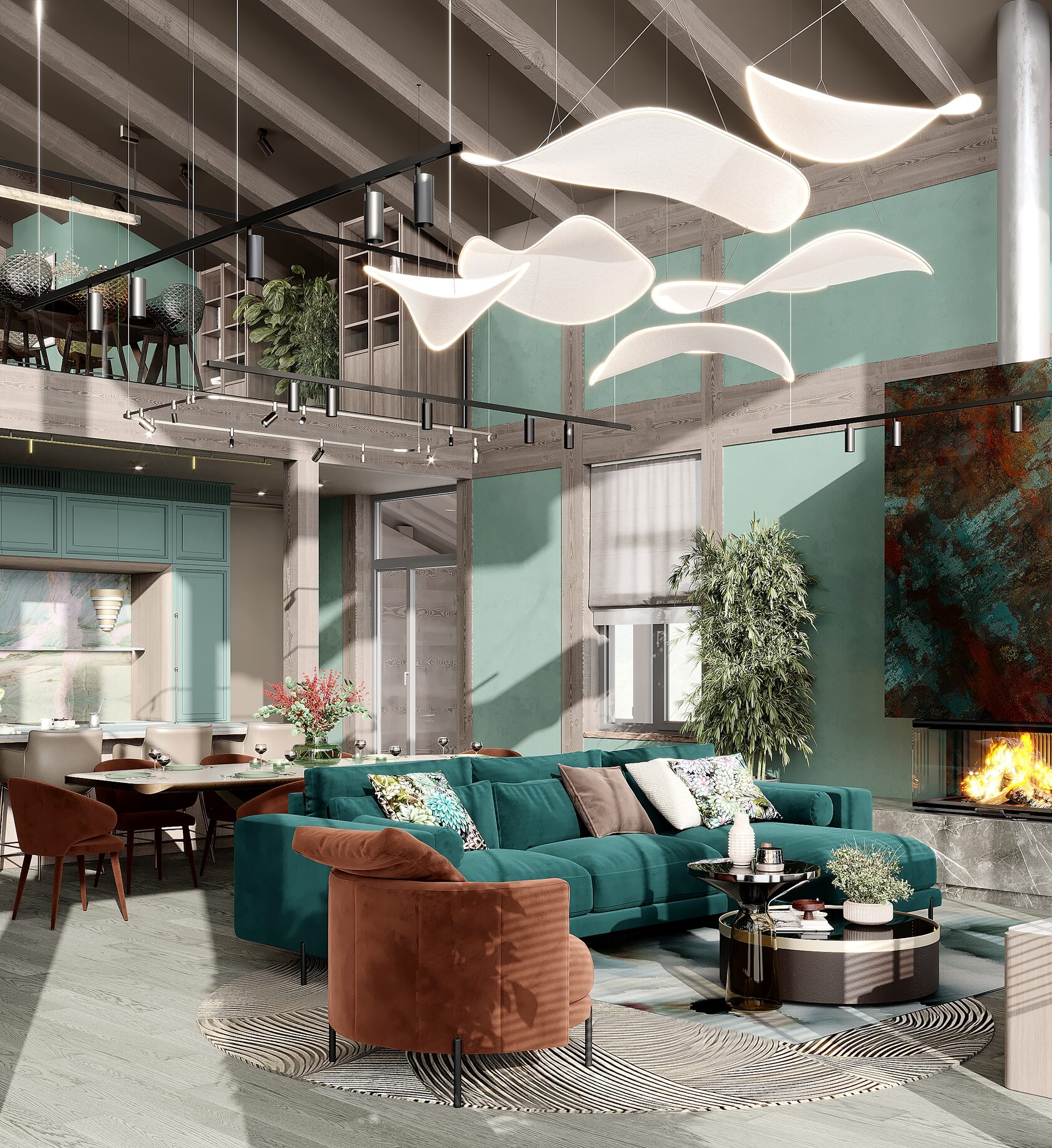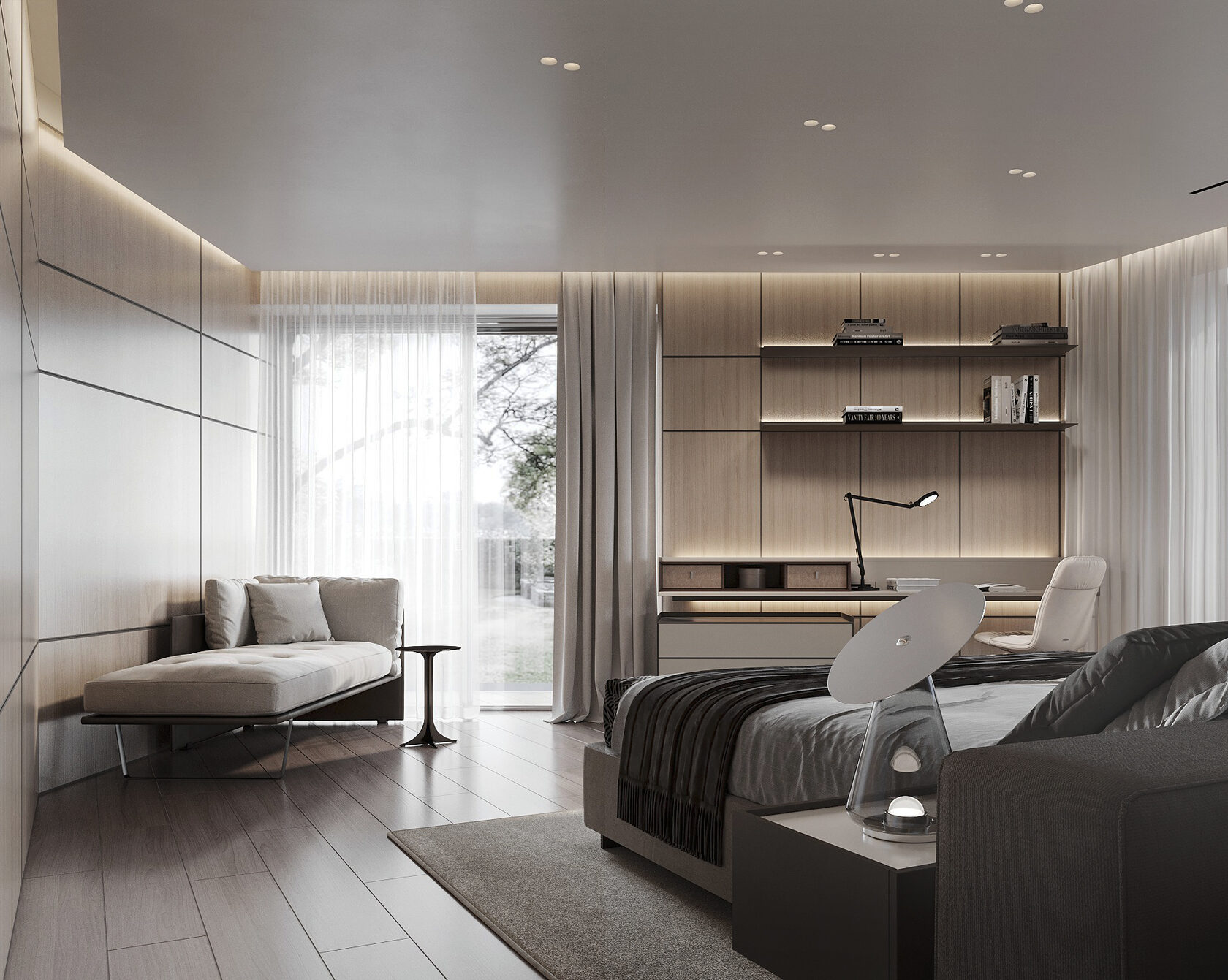 Концепция: Центральной идеей проекта является создание многослойного пространства, где каждый элемент взаимодействует со светом, превращая его в динамичного художника интерьера. Осью композиции выступает грандиозная лестница, виртуозно зонирующая дом на приватные и общественные зоны. Концепция подчеркивает тонкую проработку световых сценариев, глубокую интеграцию функциональных решений (как, например, трансформация вытяжки в арт-объект) и использование встроенной мебели для поддержания чистоты линий. Каждый уголок, от интимных детских комнат до роскошной мастер-спальни и уединенного кабинета, спроектирован с учетом индивидуальных потребностей и вневременной эстетики, обеспечивая уникальный пользовательский опыт.