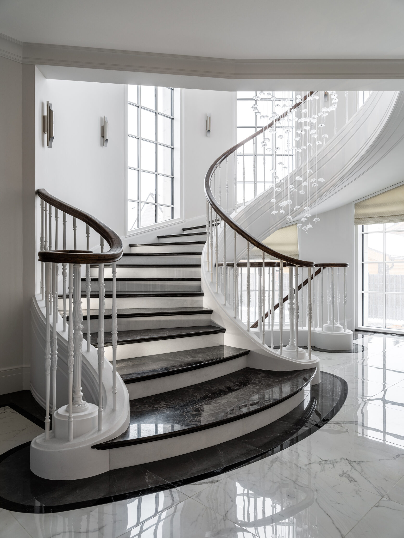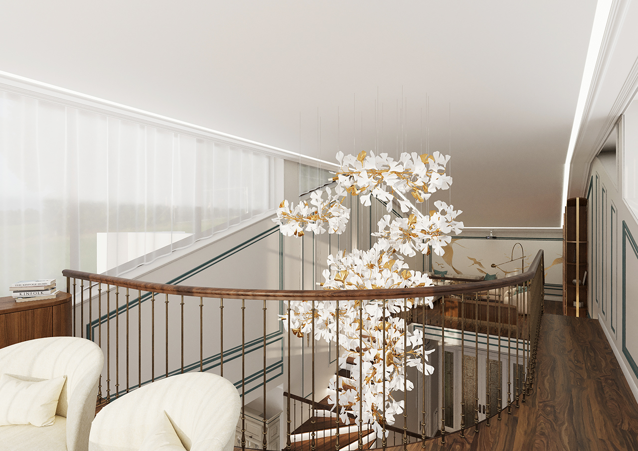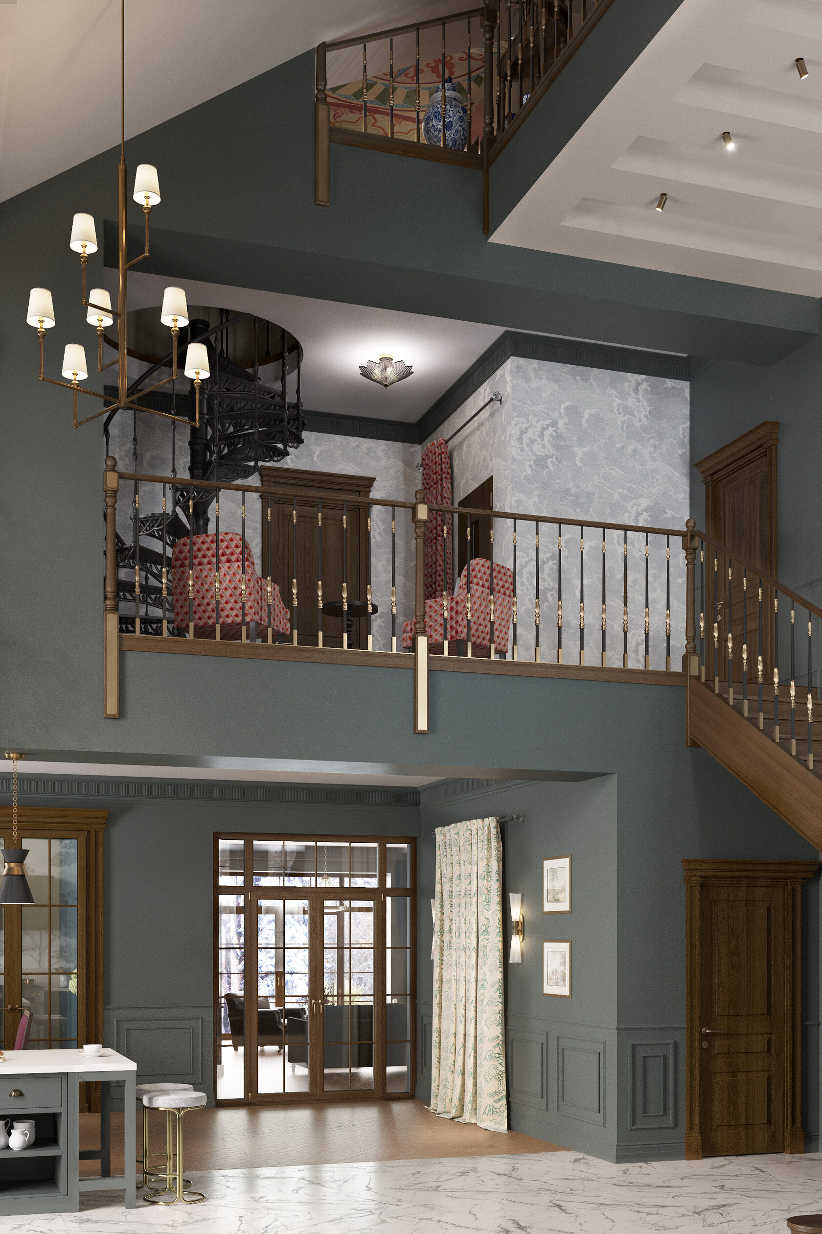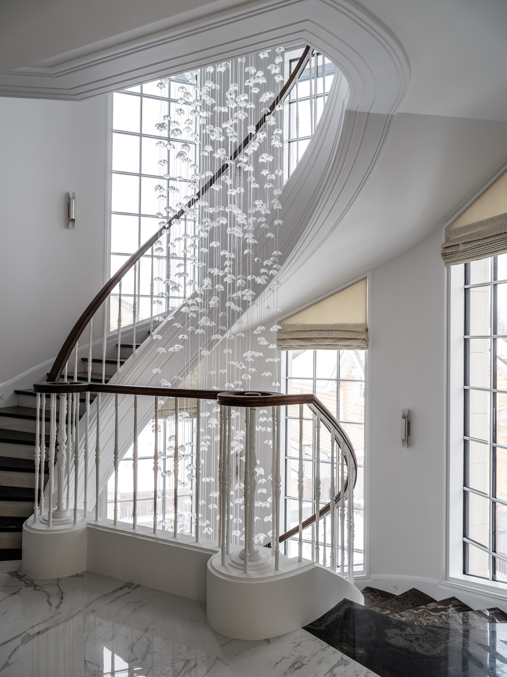 Проект интерьера, изначально вдохновленный великолепным двухсветным холлом с радиусной лестницей и сглаженными углами. Целью было создание парадного, но при этом уютного пространства, наполненного светом и воздухом. Дизайн общих зон включает светлые стены с изумрудными молдингами, барельефные узоры, лепной декор и золотые светильники, кульминацией которых является внушительная люстра над зоной отдыха с биокамином. Приватные пространства, такие как спальни и ванные, выполнены с учетом персональных пожеланий, от будуарной спальни с балдахином до современной душевой. Цокольный этаж функционально оснащен бильярдной, СПА-комплексом и хозяйственными помещениями.