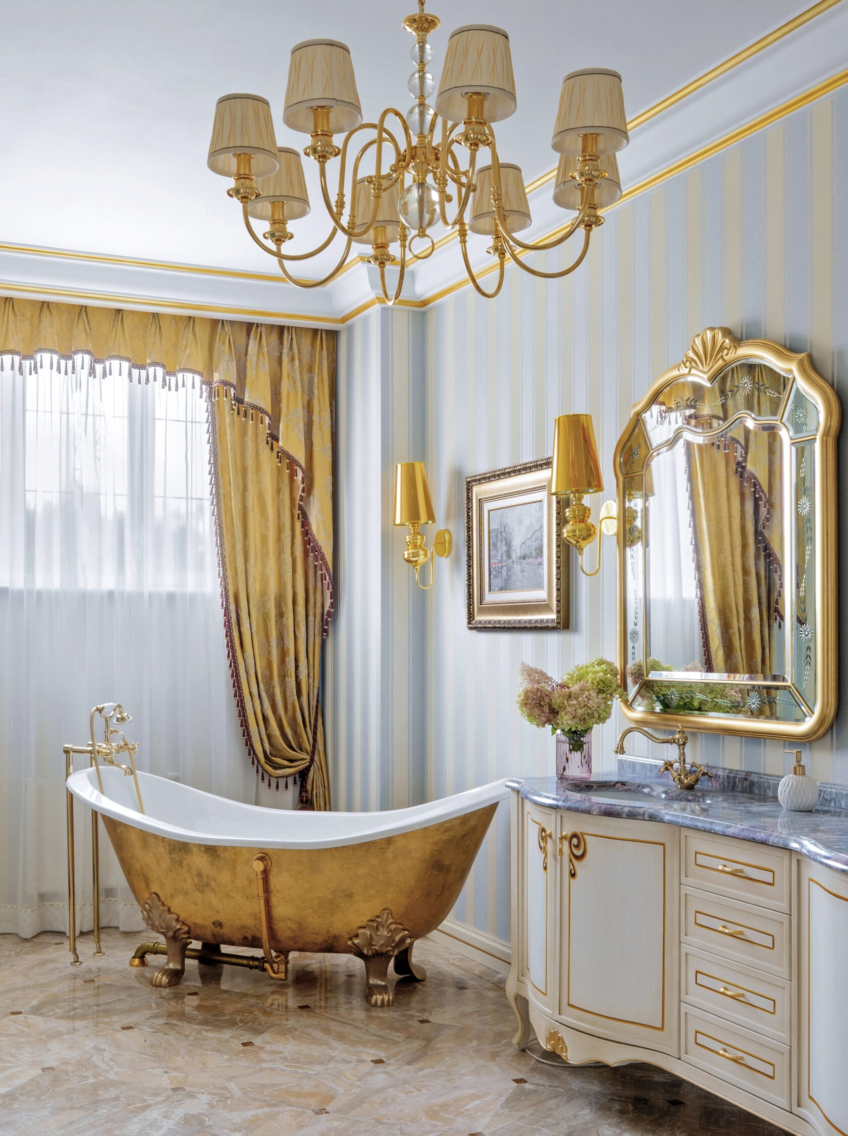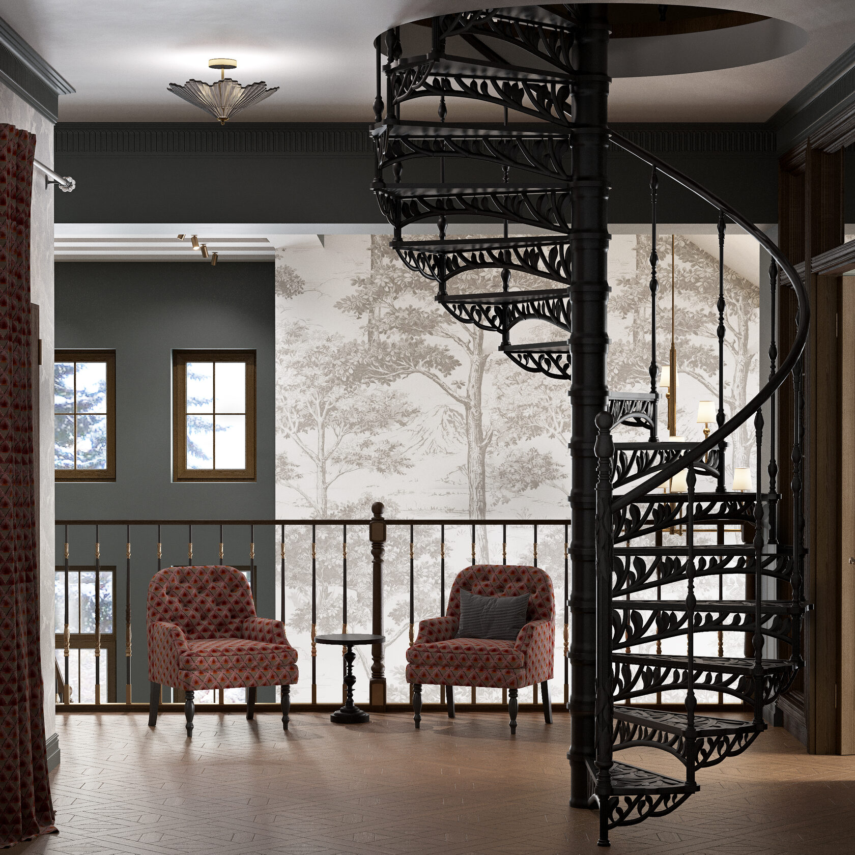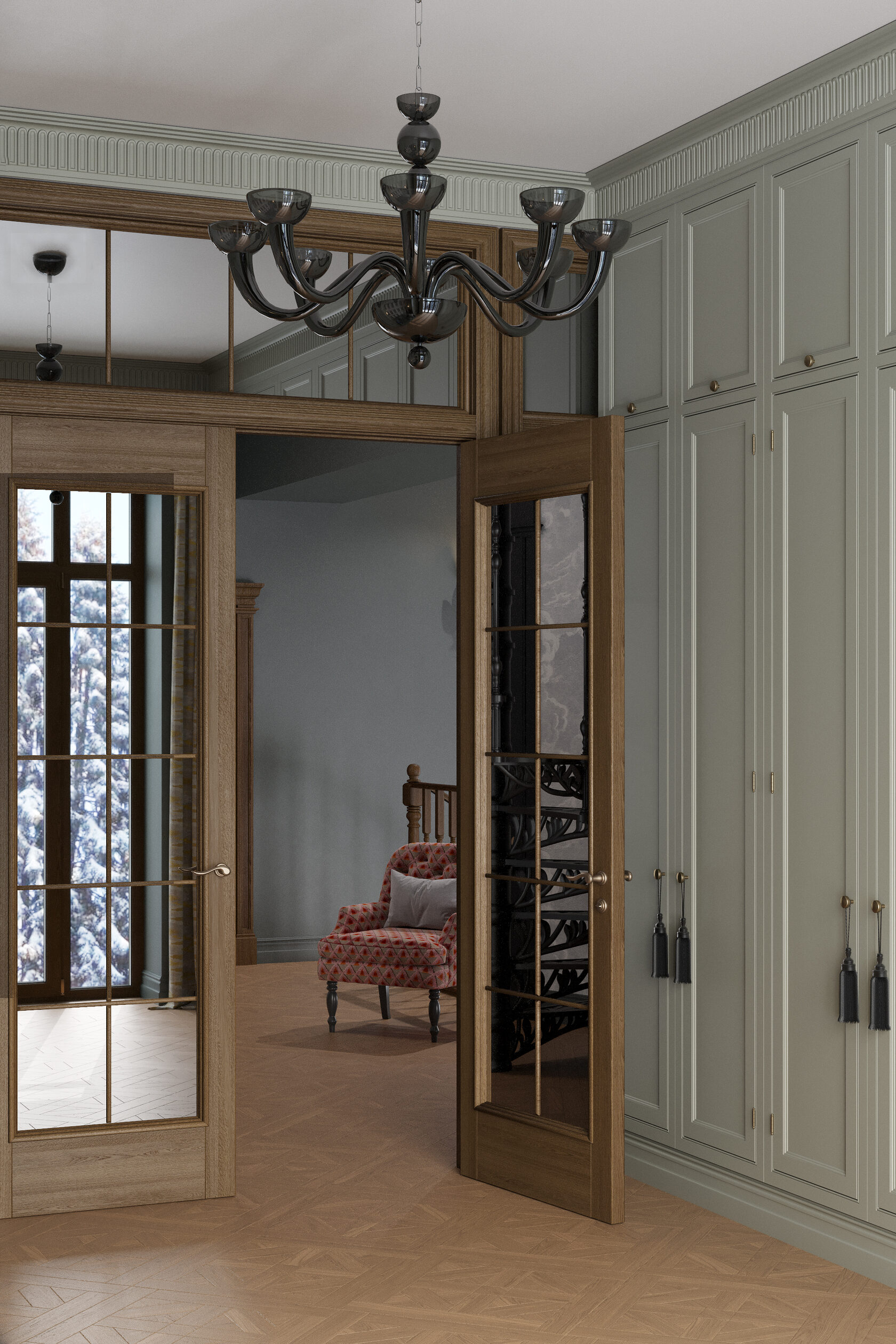 Проект интерьера, изначально вдохновленный великолепным двухсветным холлом с радиусной лестницей и сглаженными углами. Целью было создание парадного, но при этом уютного пространства, наполненного светом и воздухом. Дизайн общих зон включает светлые стены с изумрудными молдингами, барельефные узоры, лепной декор и золотые светильники, кульминацией которых является внушительная люстра над зоной отдыха с биокамином. Приватные пространства, такие как спальни и ванные, выполнены с учетом персональных пожеланий, от будуарной спальни с балдахином до современной душевой. Цокольный этаж функционально оснащен бильярдной, СПА-комплексом и хозяйственными помещениями.