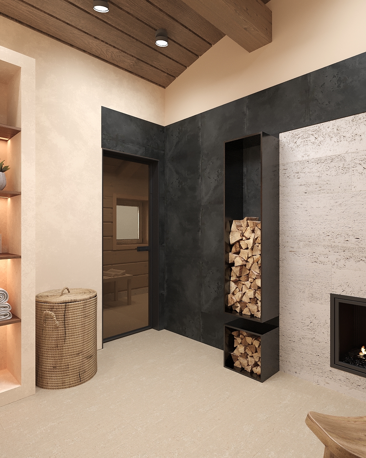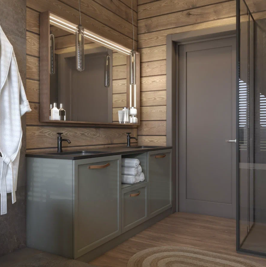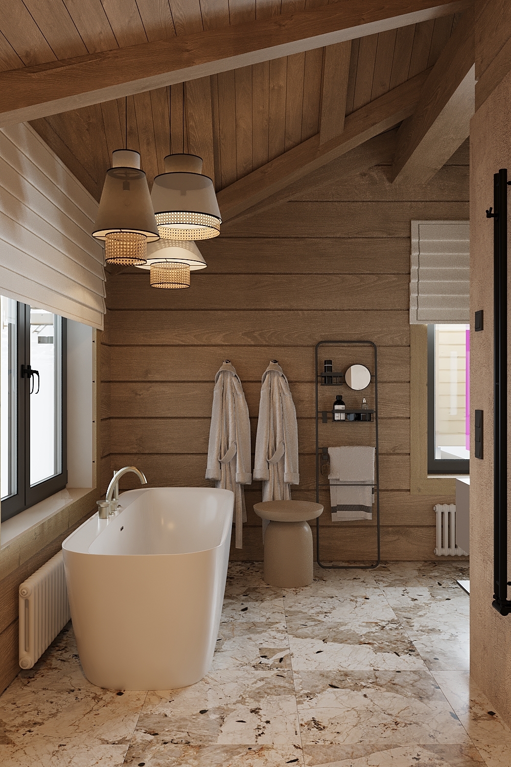 Каждое помещение сохранило природный рельеф и цвет бруса, что стало и преимуществом, и вызовом. В таких условиях особенно важны детали: они не просто украшают, а формируют функциональность и атмосферу. Рациональный подход к выбору материалов, ориентация на импортозамещение, технологическая простота и экономическая разумность — вот принципы, на которых строился этот проект.