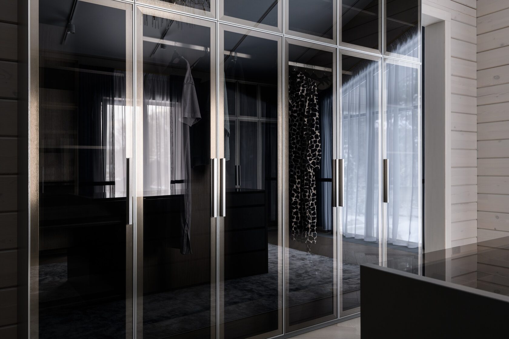 Концепция Мы сознательно отказались от ярких акцентов и сложных форм, сосредоточив внимание на материале и ощущении. Дом снаружи оформлен в темных тонах: черные фасады, камень, много дерева — всё это стало отправной точкой и для внутреннего наполнения. Дизайн построен на контрасте текстур: гладкая кожа, фактурный камень, тёплое дерево. Все материалы натуральные, живые, способные стареть красиво. Мебель — минималистичная, лаконичная, будто растворяющаяся в пространстве. Она не спорит с архитектурой и не отвлекает от главного — вида из окон. А панорамные остекления в пол становятся естественными картинами: вместо декора — лес, вместо телевидения — бегущая вода и ветер в кронах деревьев.