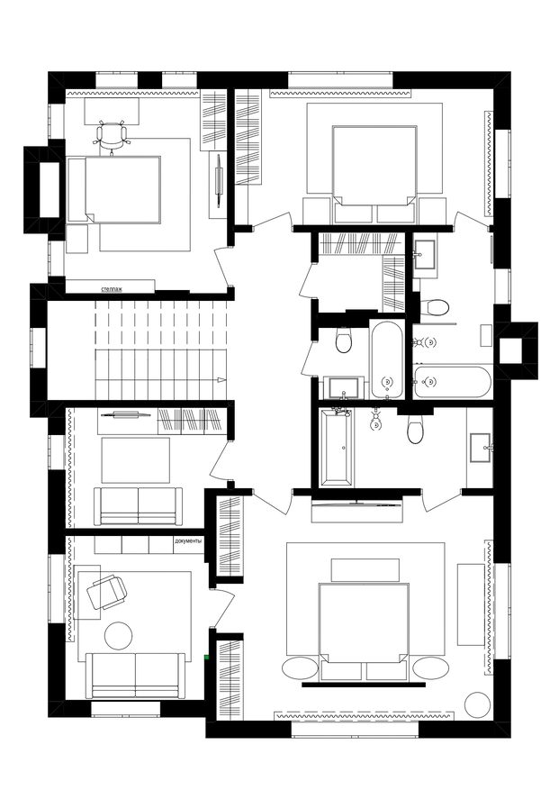 Загородный дом спроектирован для семьи из четырех человек с учетом удобства и функциональности. Пространство организовано так, чтобы каждый член семьи имел свою приватную зону, а также были места для общения и отдыха.