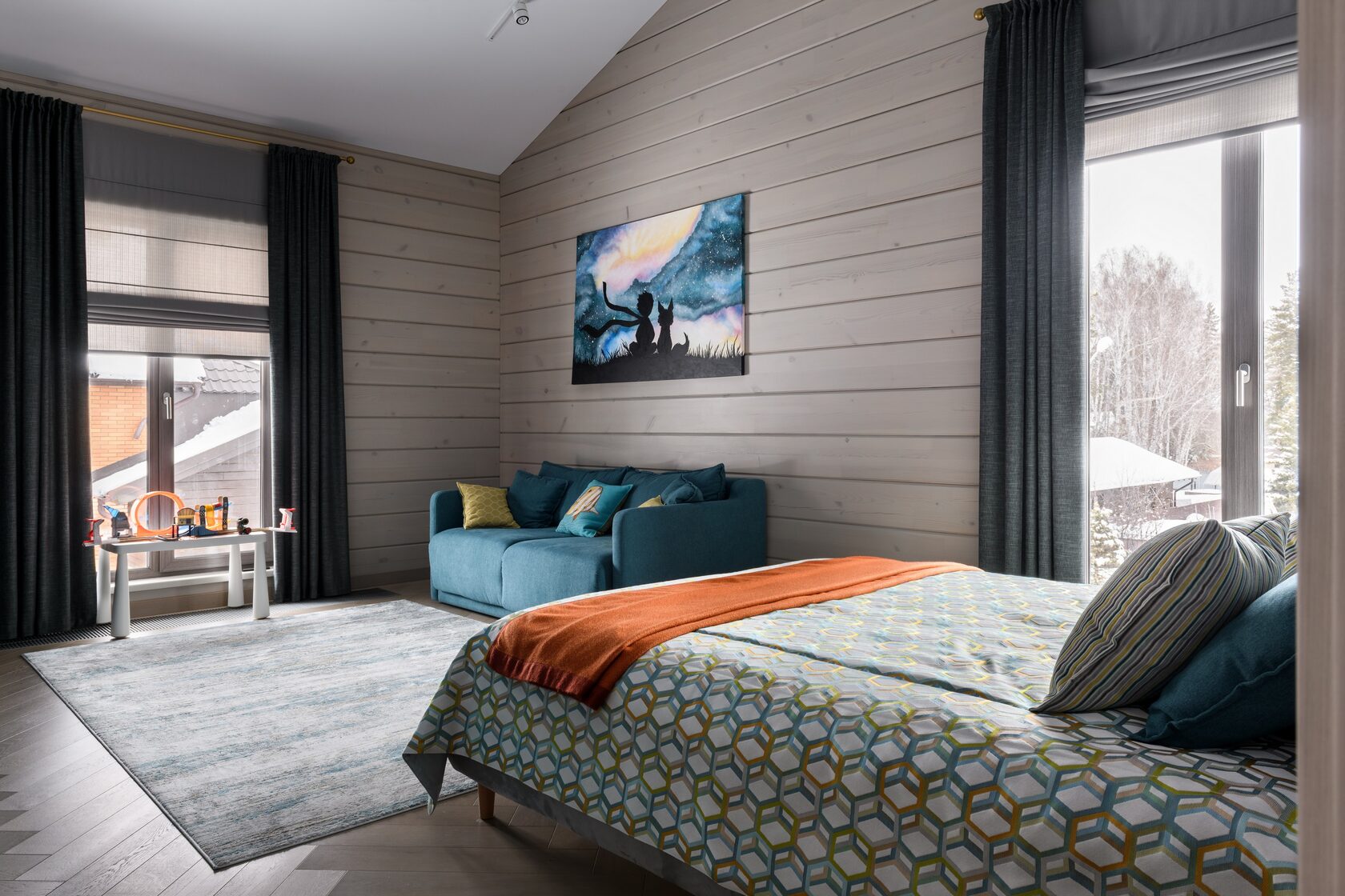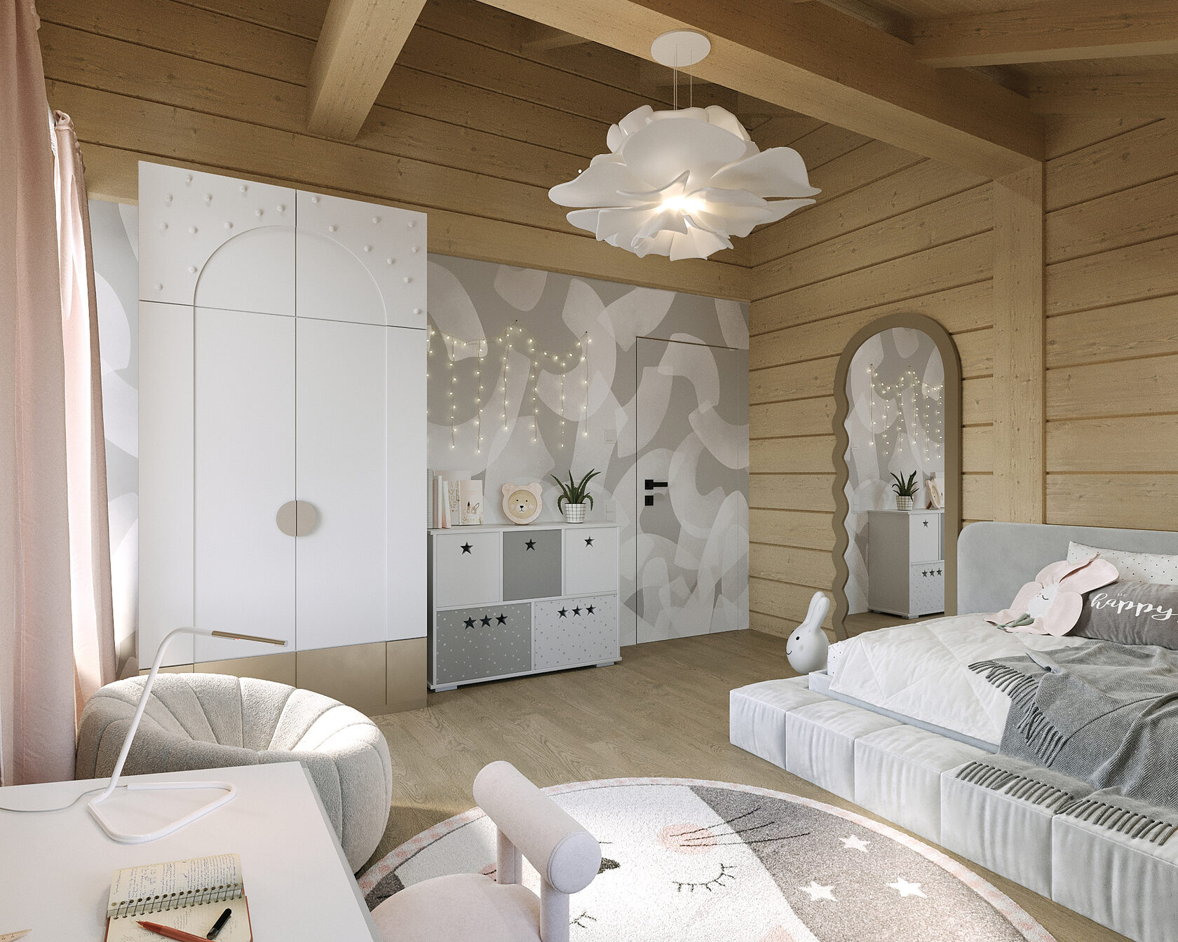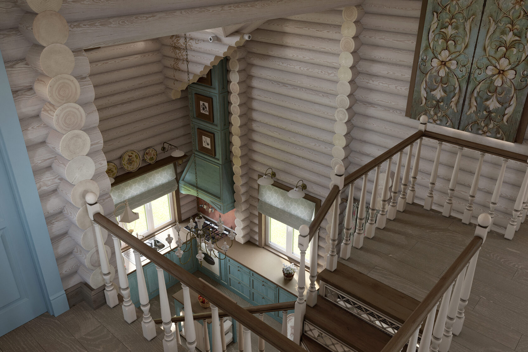 Концепция: Проект реализован совместно с компанией Honka. Все элементы — от росписей и потолков до камина — выполнены по индивидуальным эскизам дизайнера Натальи. Такой подход позволил создать гармоничное пространство, где каждая деталь отражает характер и уникальность дома.