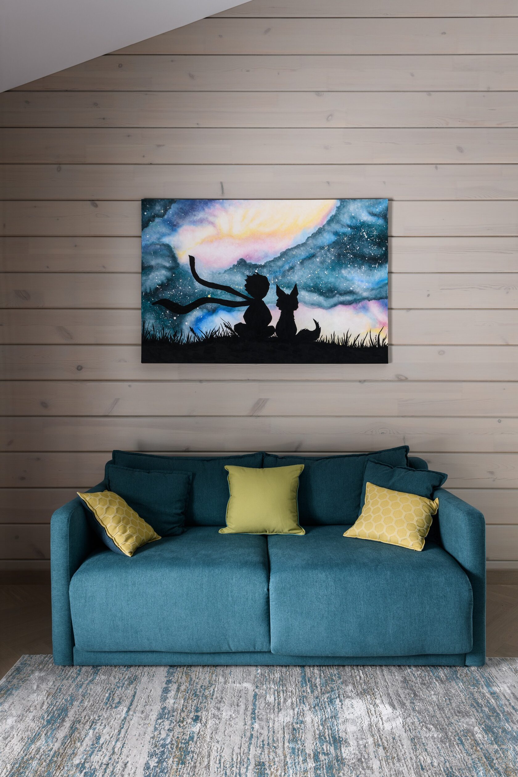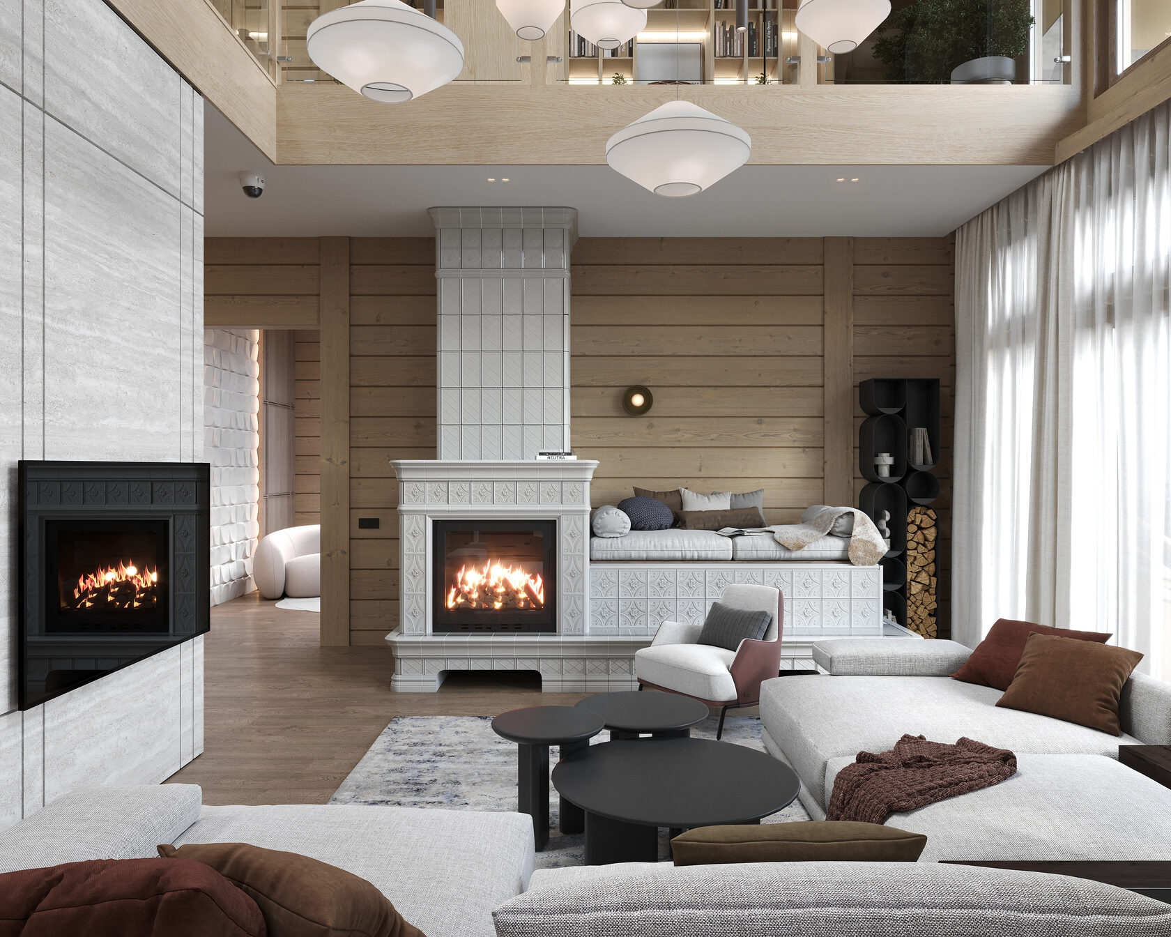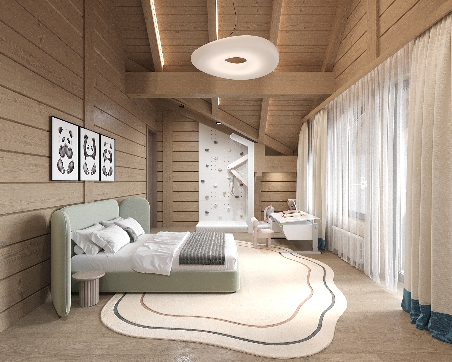 Концепция: Проект реализован совместно с компанией Honka. Все элементы — от росписей и потолков до камина — выполнены по индивидуальным эскизам дизайнера Натальи. Такой подход позволил создать гармоничное пространство, где каждая деталь отражает характер и уникальность дома.