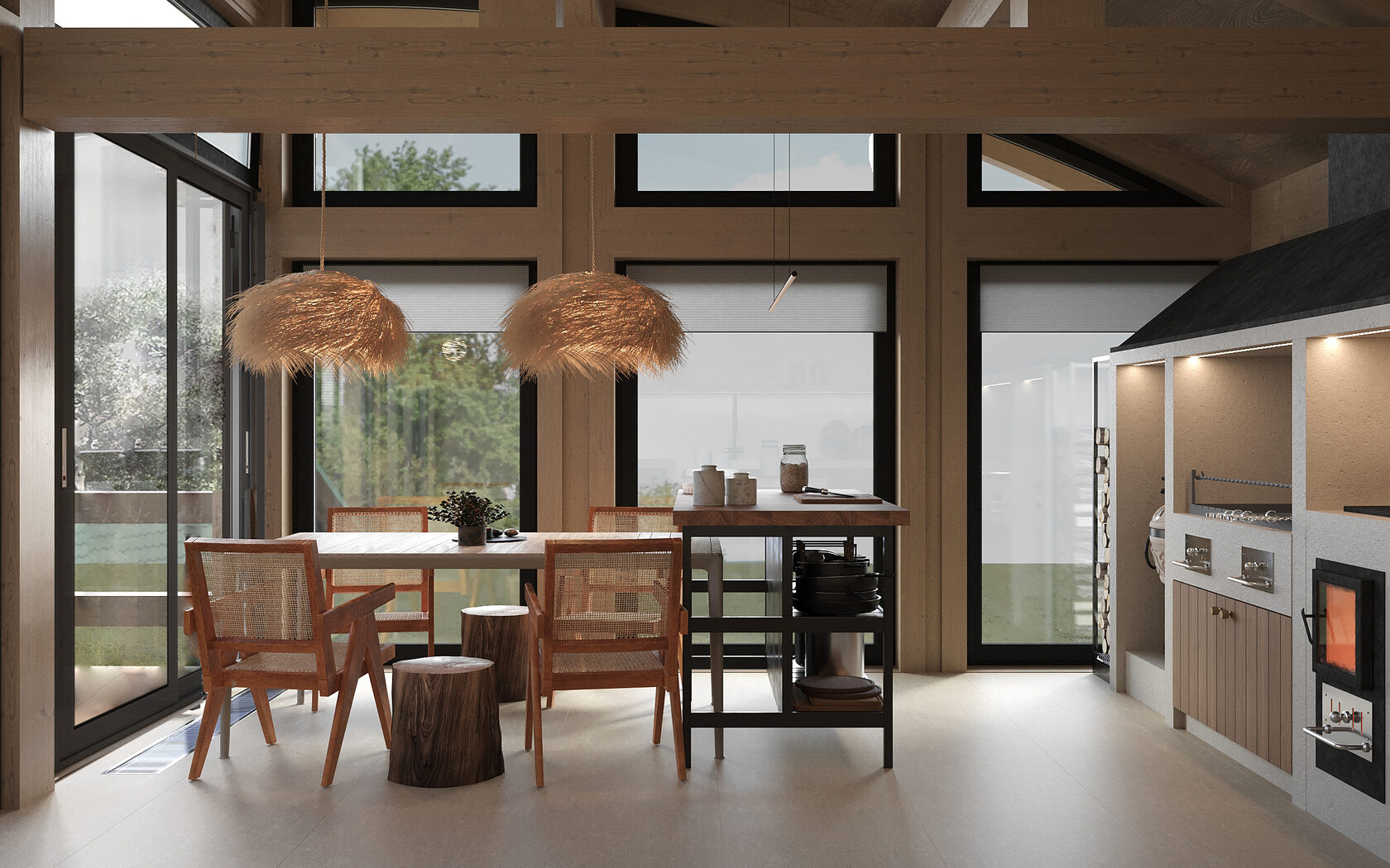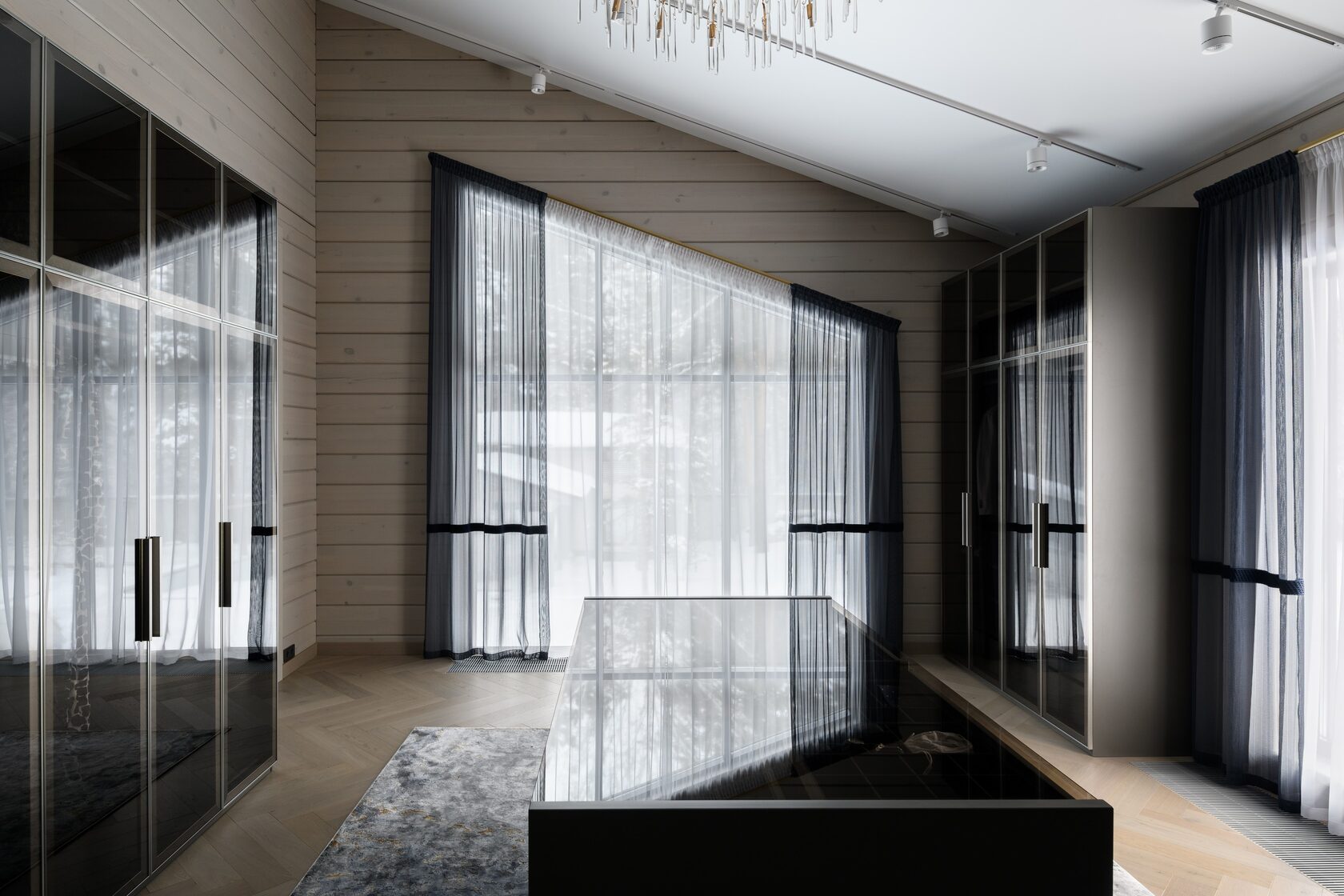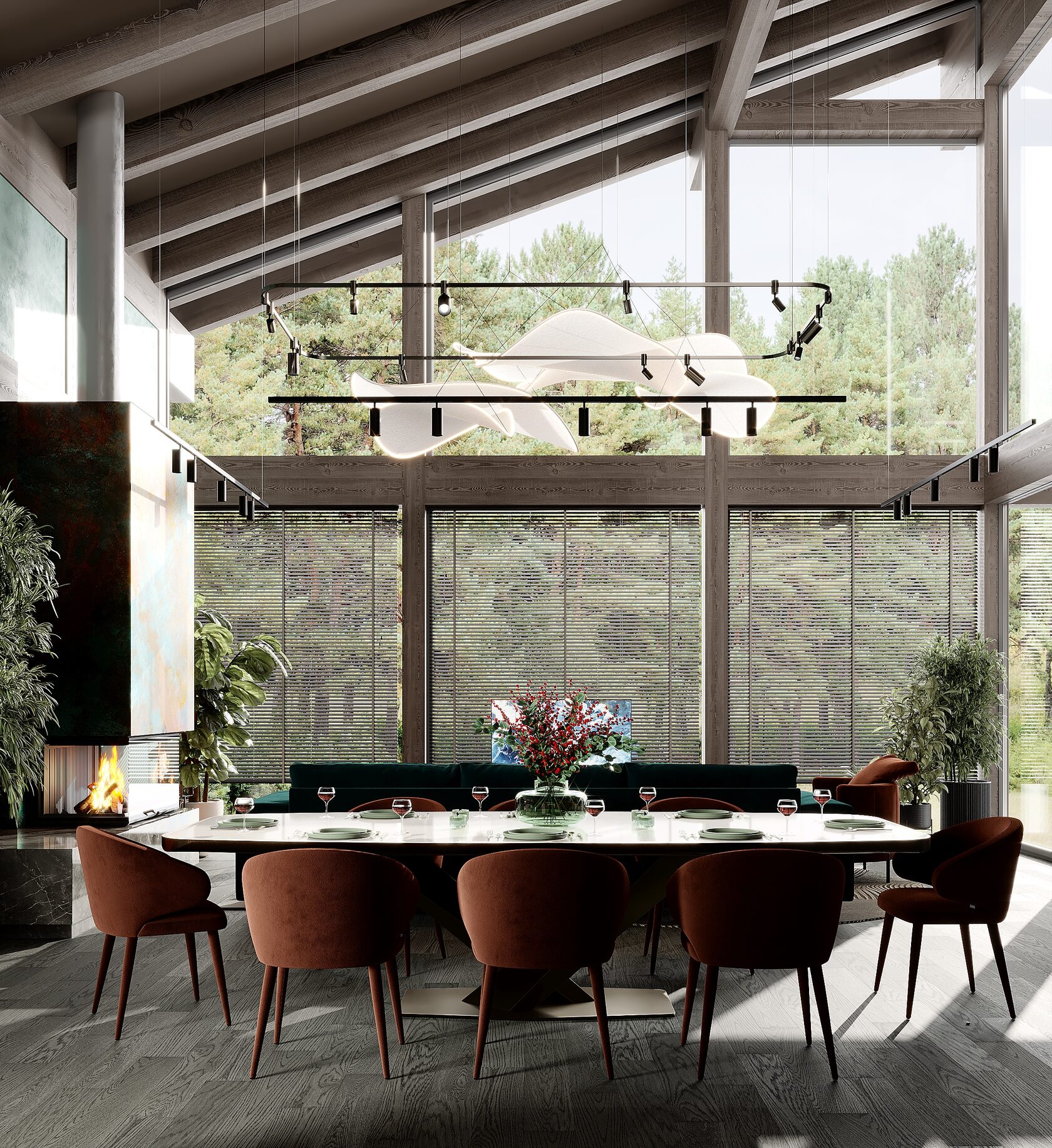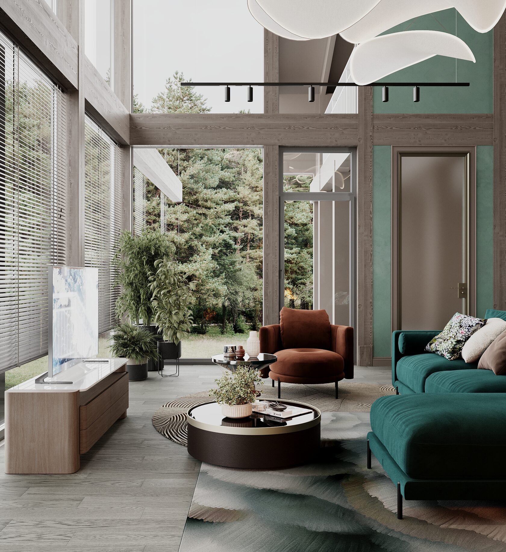 Материалы и отделка подчеркивают концепцию: натуральное дерево, матовые поверхности, скрытое освещение. Панорамное остекление обеспечивает постоянную связь с природой.