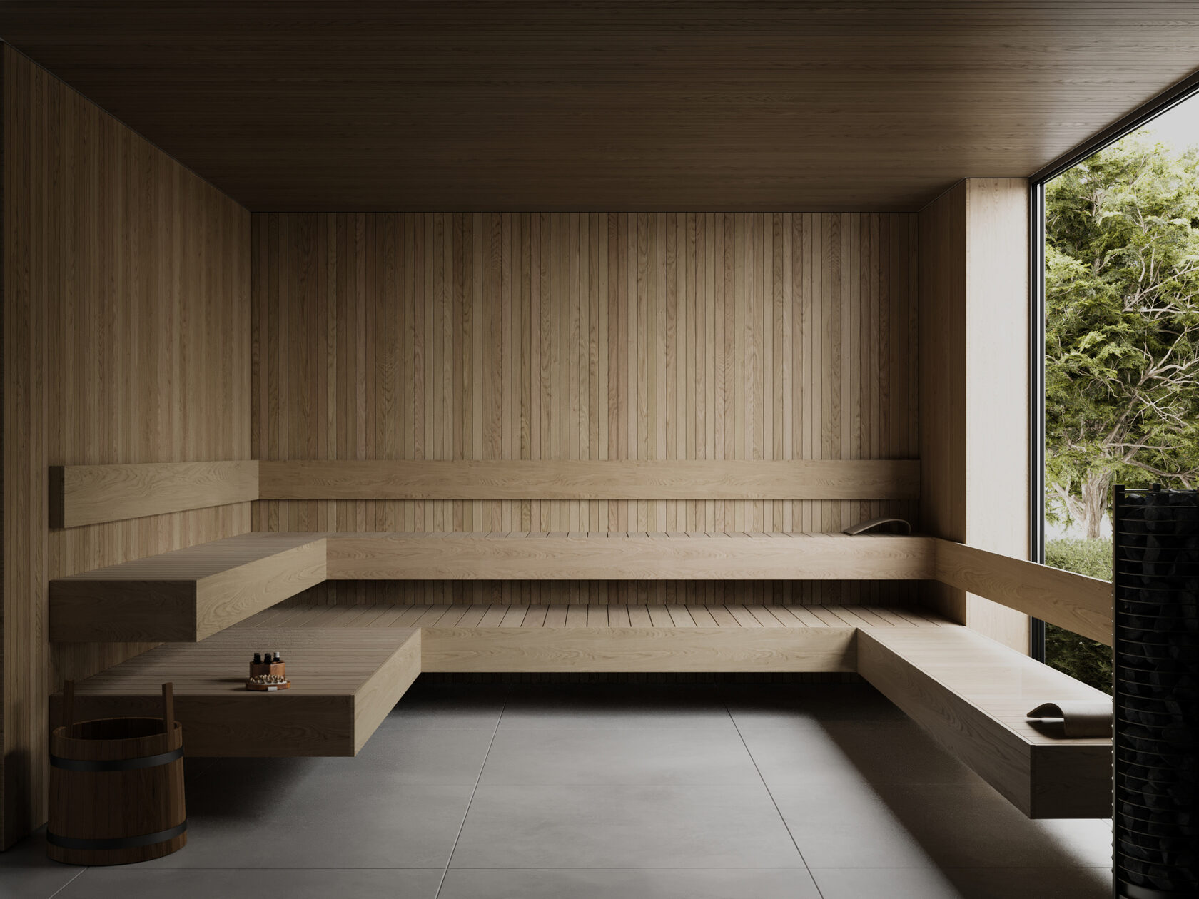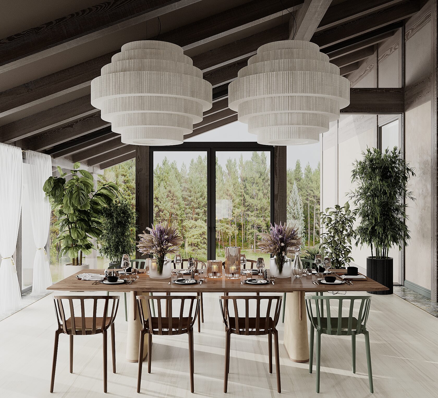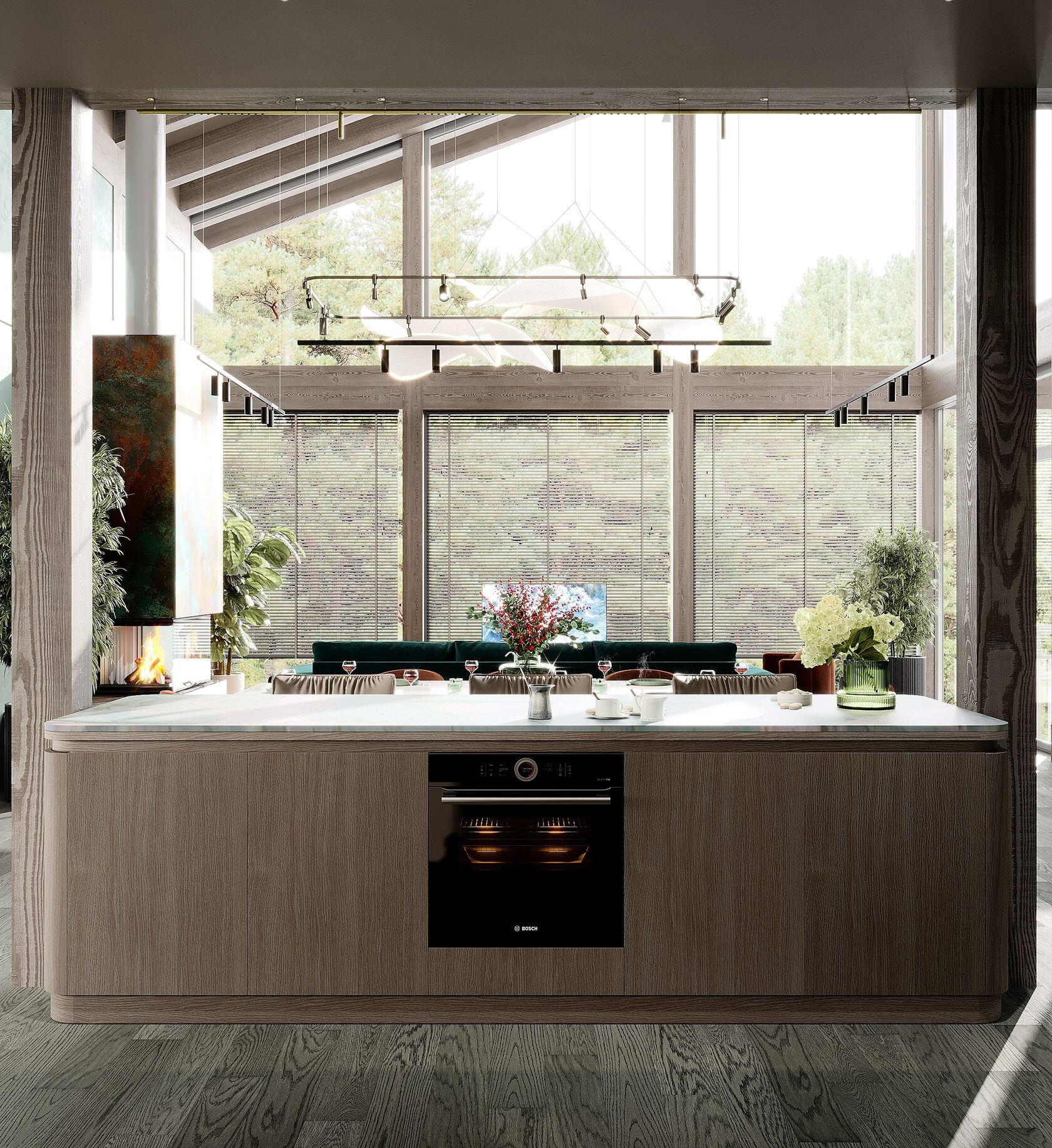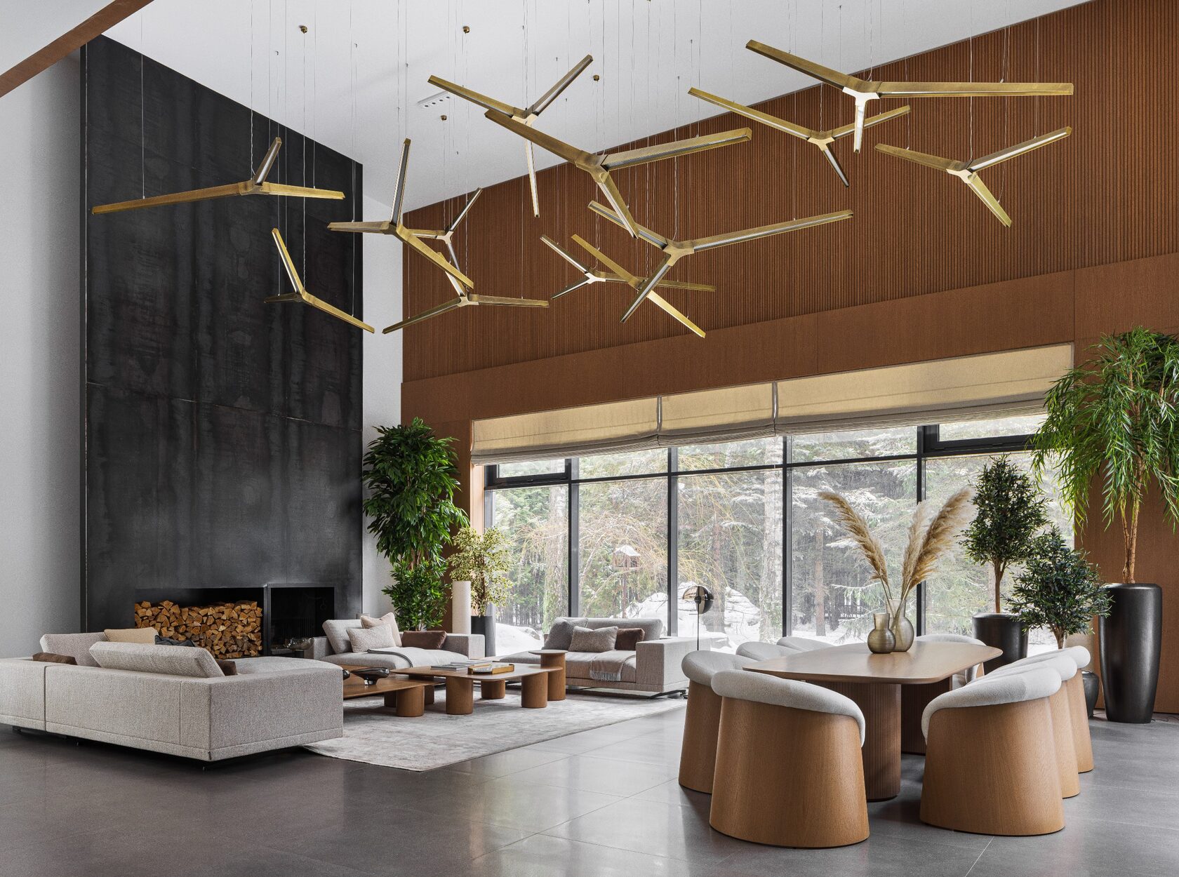 Материалы и отделка подчеркивают концепцию: натуральное дерево, матовые поверхности, скрытое освещение. Панорамное остекление обеспечивает постоянную связь с природой.