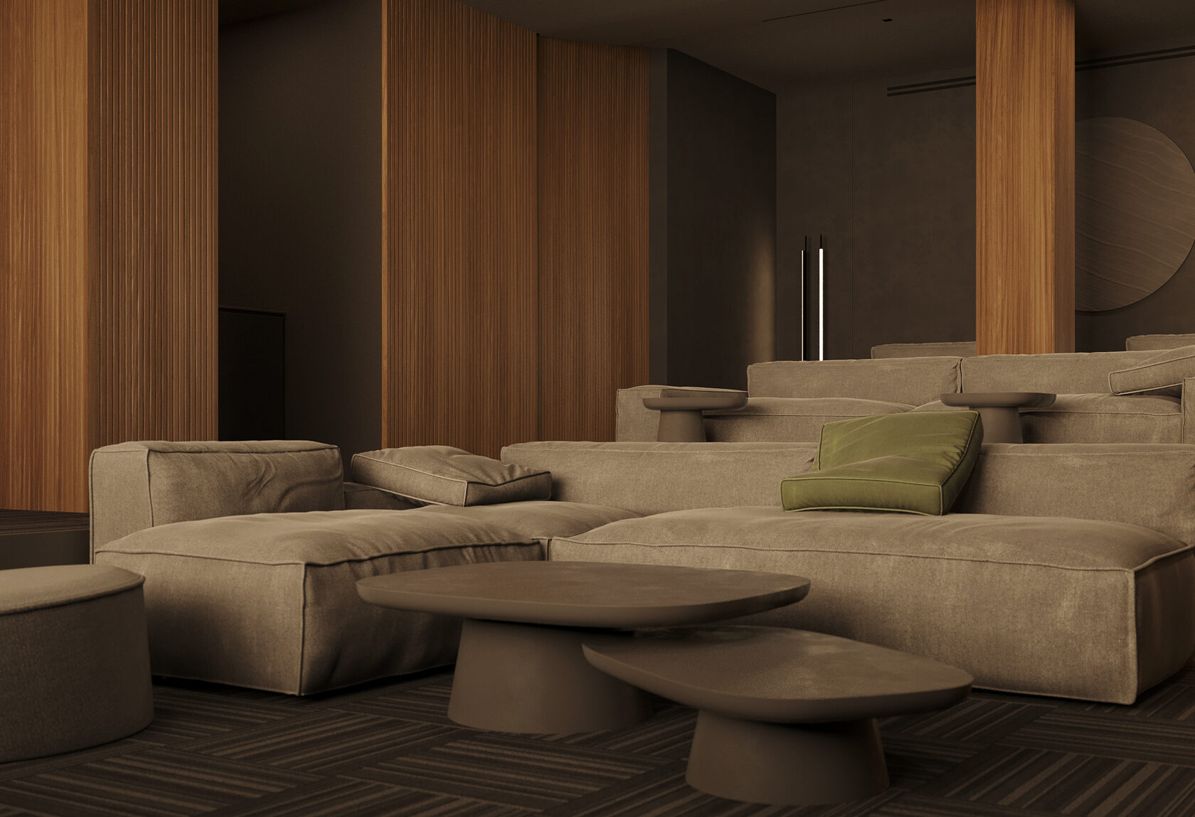 Каждый элемент работает на общую концепцию: от скрытых акустических панелей до специально спроектированной мебели, повторяющей изгибы архитектуры.