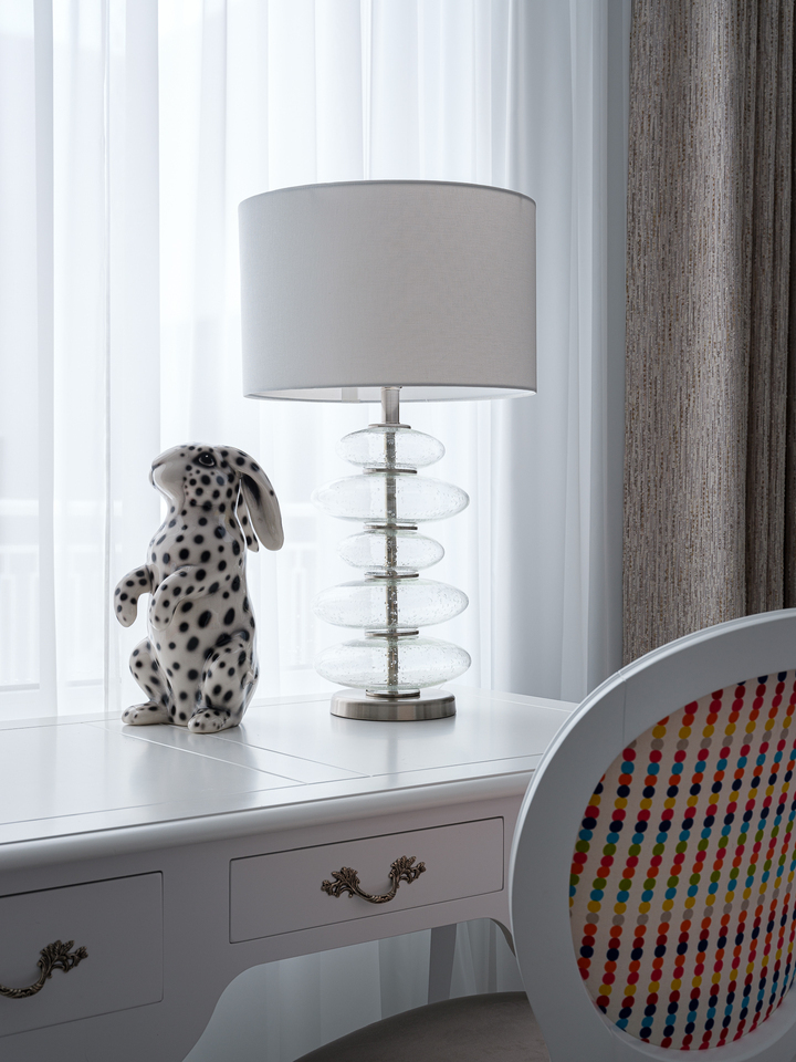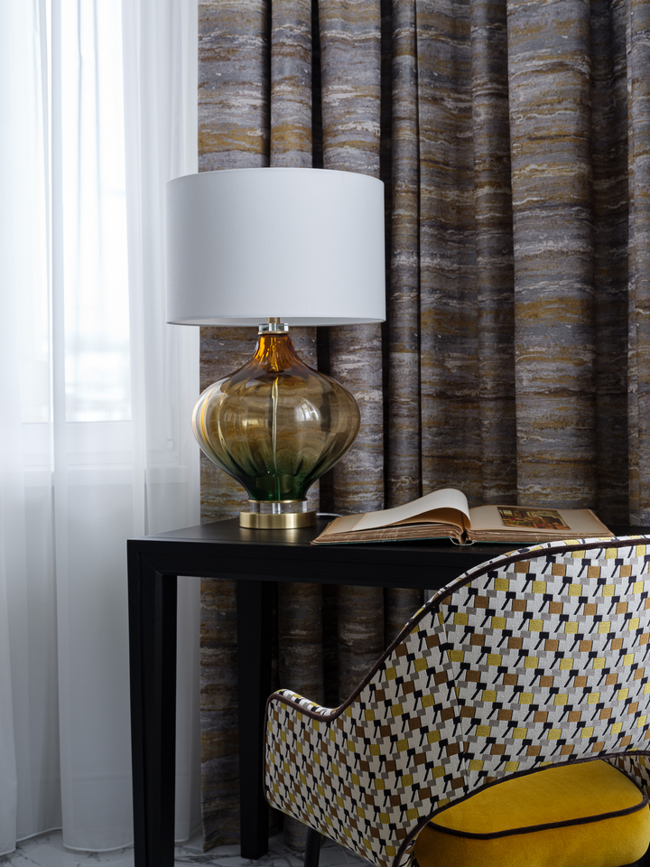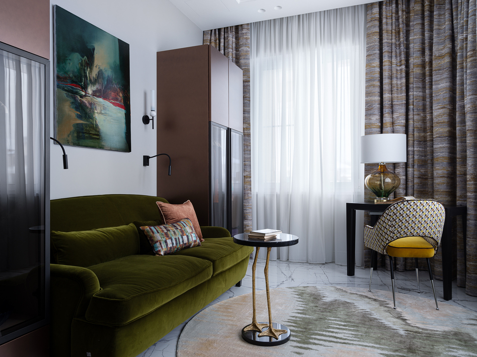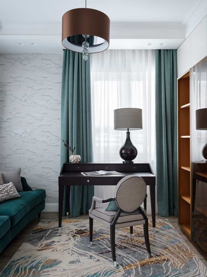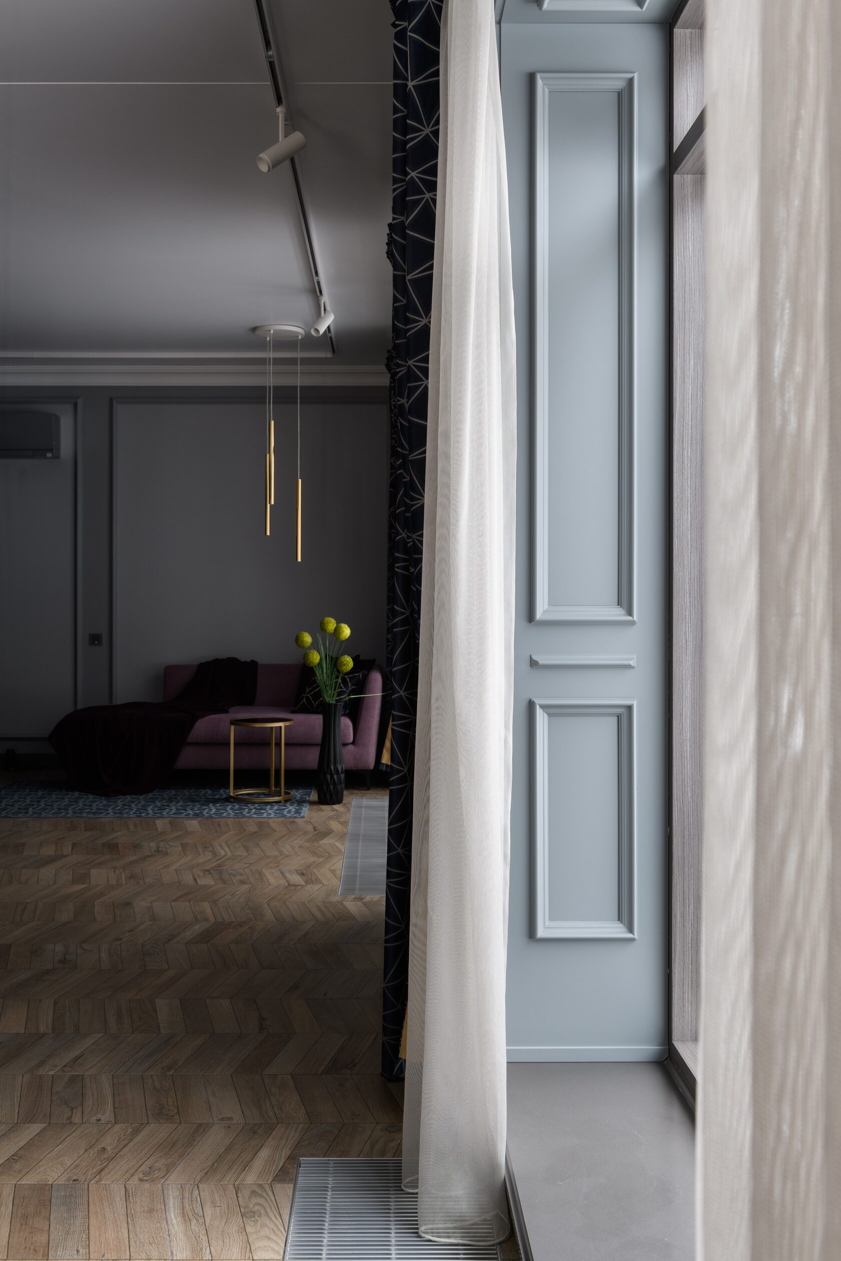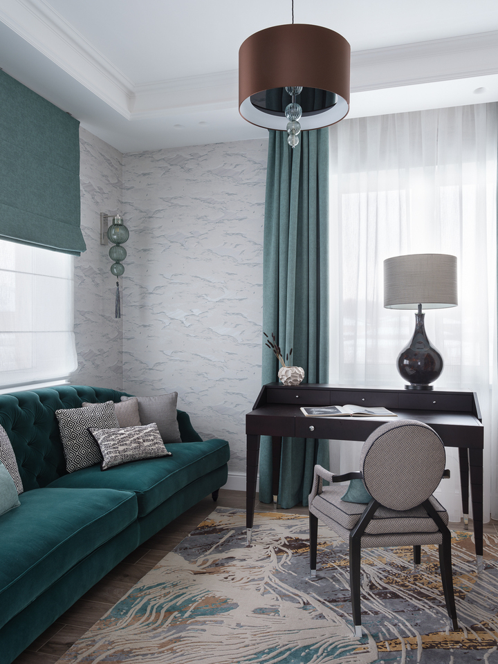 Проект был вдохновлён атмосферой романа Скотта Фицджеральда «Великий Гэтсби». Небольшие акценты в принтах, декоре и отделочных материалах повторяются из комнаты в комнату, создавая цельную и гармоничную атмосферу. Интерьер сочетает богатую цветовую палитру, сложные текстуры и тщательно продуманную встроенную мебель, подчинённую общему стилю.