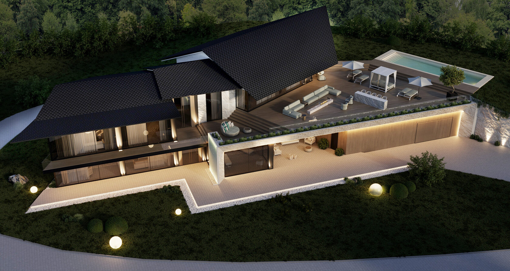 Концепция: Центральная идея проекта — создание динамичного «Пространства Жизни», идеально адаптирующегося под ритм и потребности семьи. Он мастерски объединяет приватные зоны для каждого члена с обширными общественными пространствами, включая гостиную с двойным светом, террасу с камином, зону барбекю и бассейн, создавая круглогодичную атмосферу курортного отдыха. Интеграция передовых инженерии и технологий, таких как система «умный дом», энергоэффективное остекление и климат-контроль, обеспечивает непревзойденный комфорт, статус и качество среды.