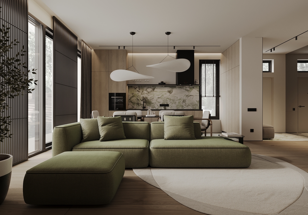 Планировка и геометрия — Единое пространство кухни, гостиной и столовой — Зонирование без перегородок — через мебель и текстиль — Простые формы, минимум предметов