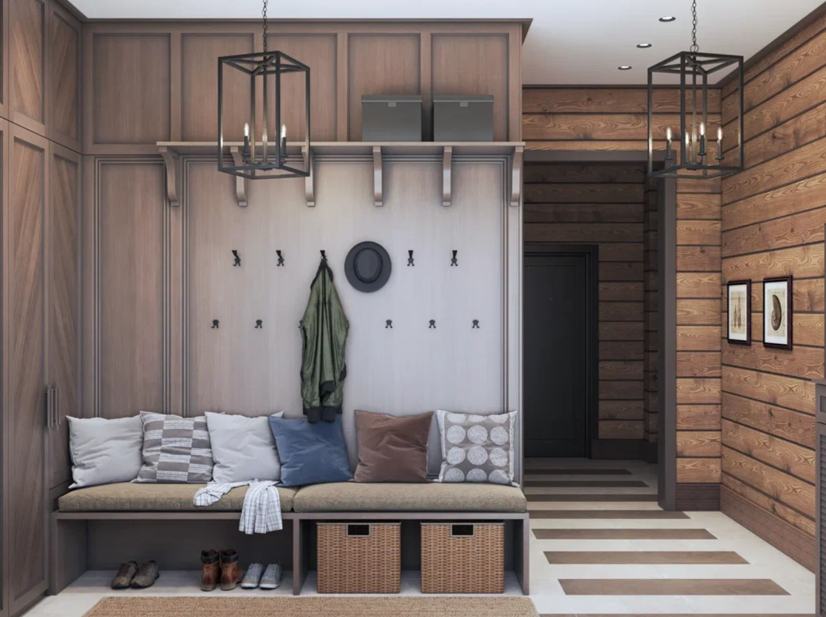 Холл с лаконичной отделкой встречает гостей теплым сценарием освещения