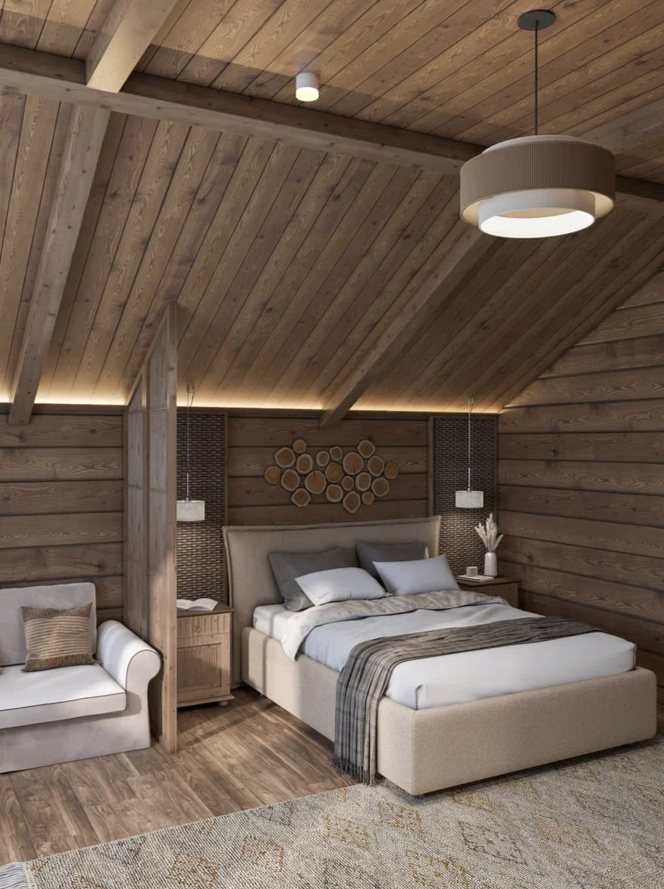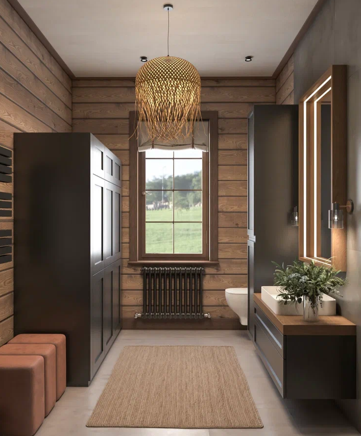 Дизайн и концепция Каждый элемент интерьера выполнен из натурального дерева, что создает теплую и экологичную атмосферу. Деревянные поверхности, тщательно обработанные и оформленные, подчеркивают красоту природного материала и вносят ощущение спокойствия и уединенности. Такой подход позволяет жильцам наслаждаться близостью к природе, даже находясь внутри дома.