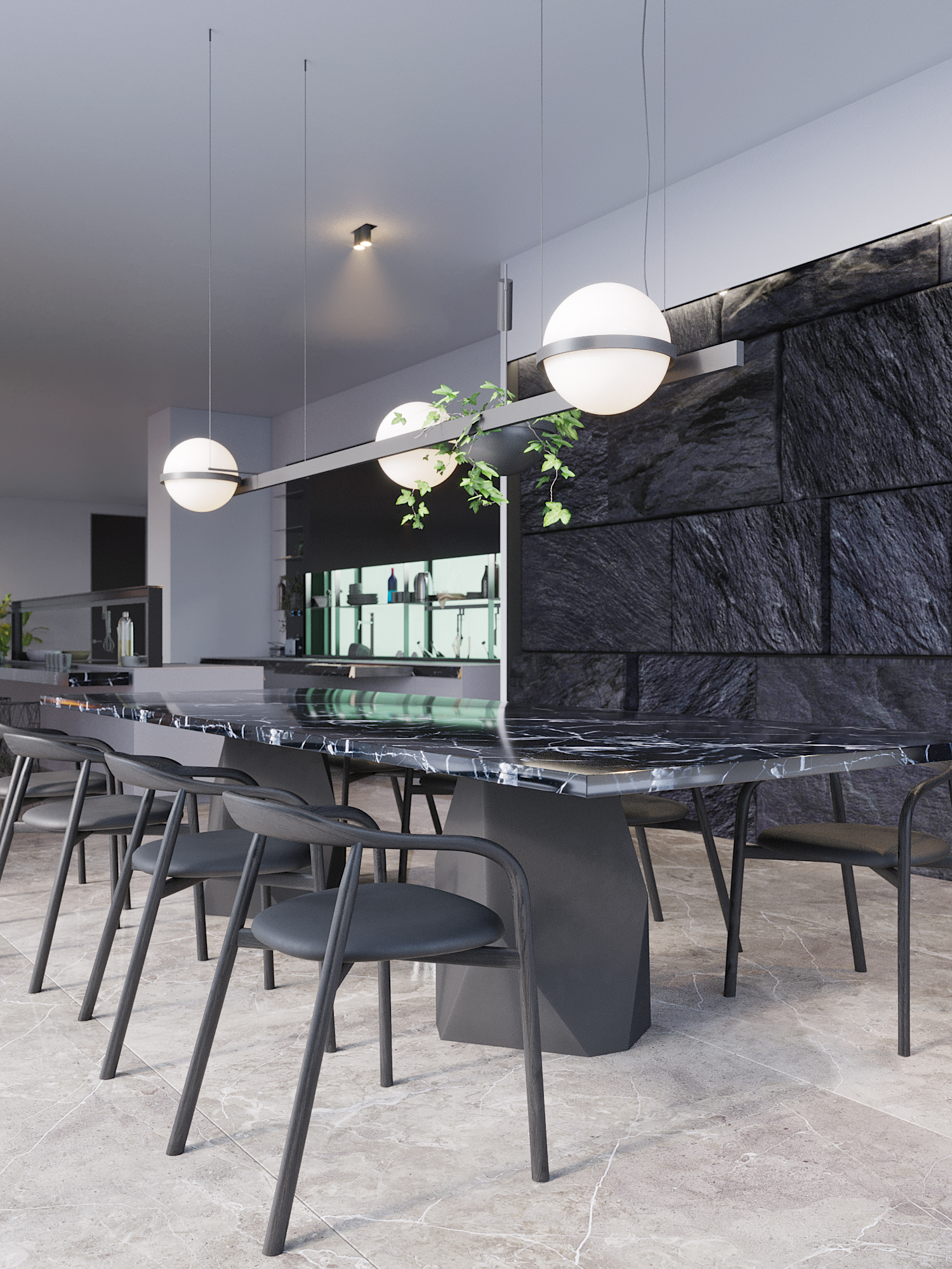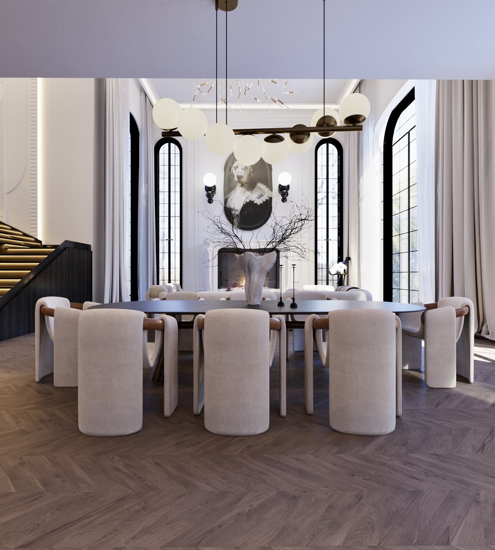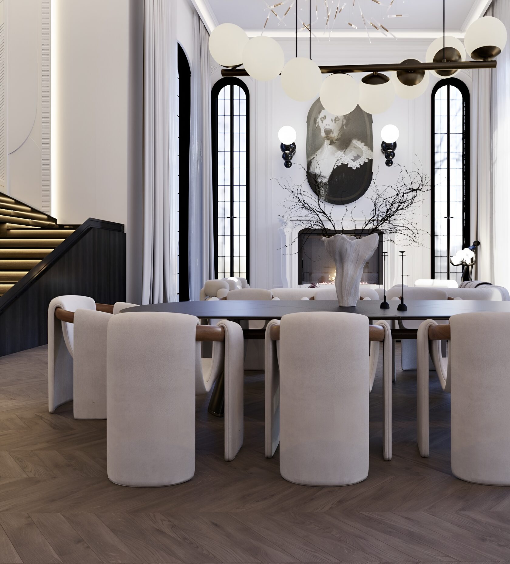 Концепция: Главной идеей проекта стала разработка жилого пространства, где любовь к питомцам находит свое отражение в каждом элементе дизайна. Концепция построена на выразительной монохромной палитре, подчеркивающей чистоту форм и элегантность линий. Интерьер обогащен уникальными деталями – от авторских светильников до художественных портретов, искусно вплетающих характер далматинцев в общий ансамбль. Помимо эстетики, приоритетом был комфорт животных: предусмотрены специальные комнаты и приватный мини-парк для игр, что демонстрирует наше видение питомцев как полноправных обитателей дома.