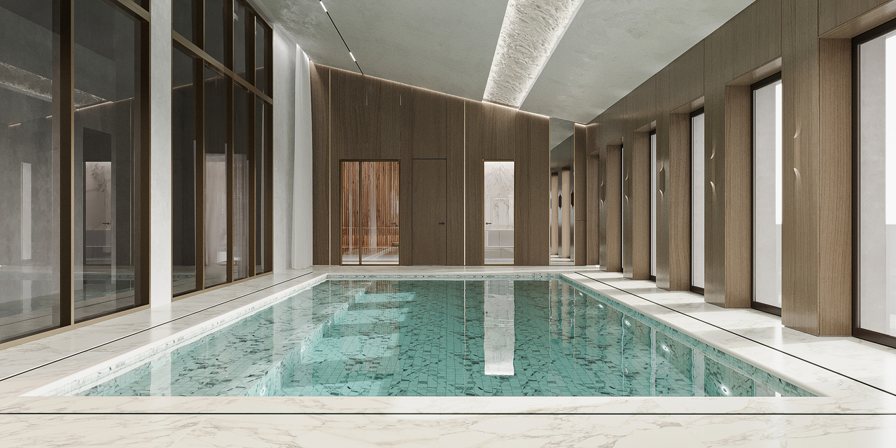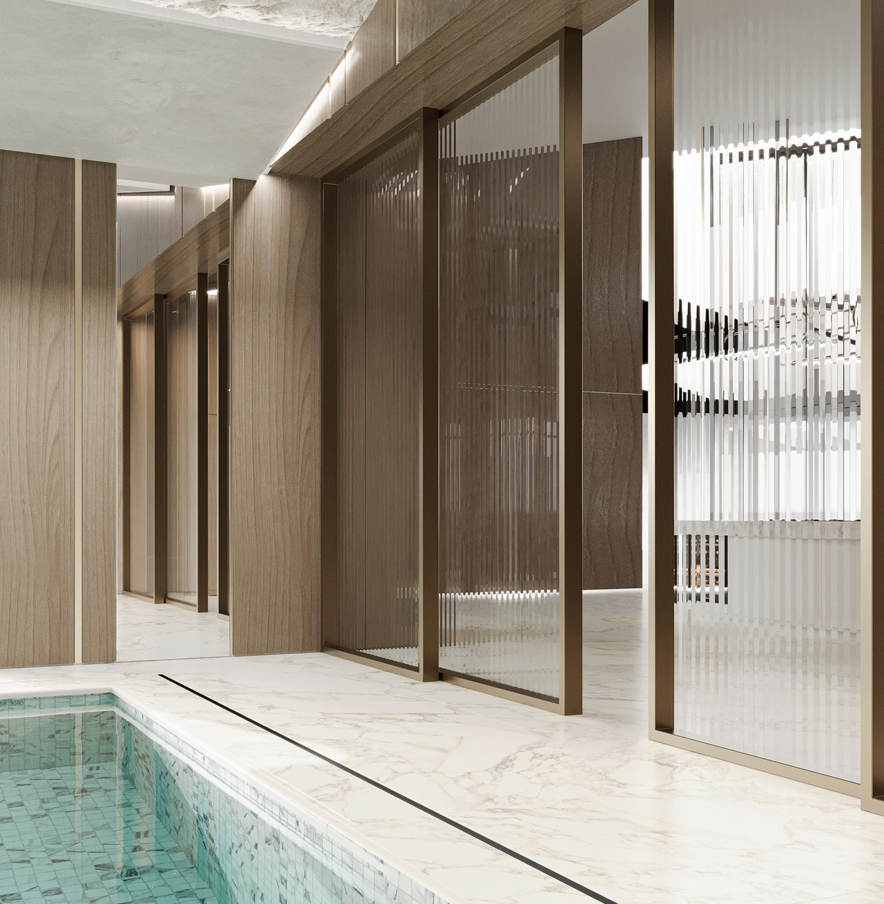 Исходные данные: Роскошная отделка от Foster + Partners: текстильные панели, мраморные плинтусы, зеркальные потолки, бронзовое стекло и контрастная мозаика.
