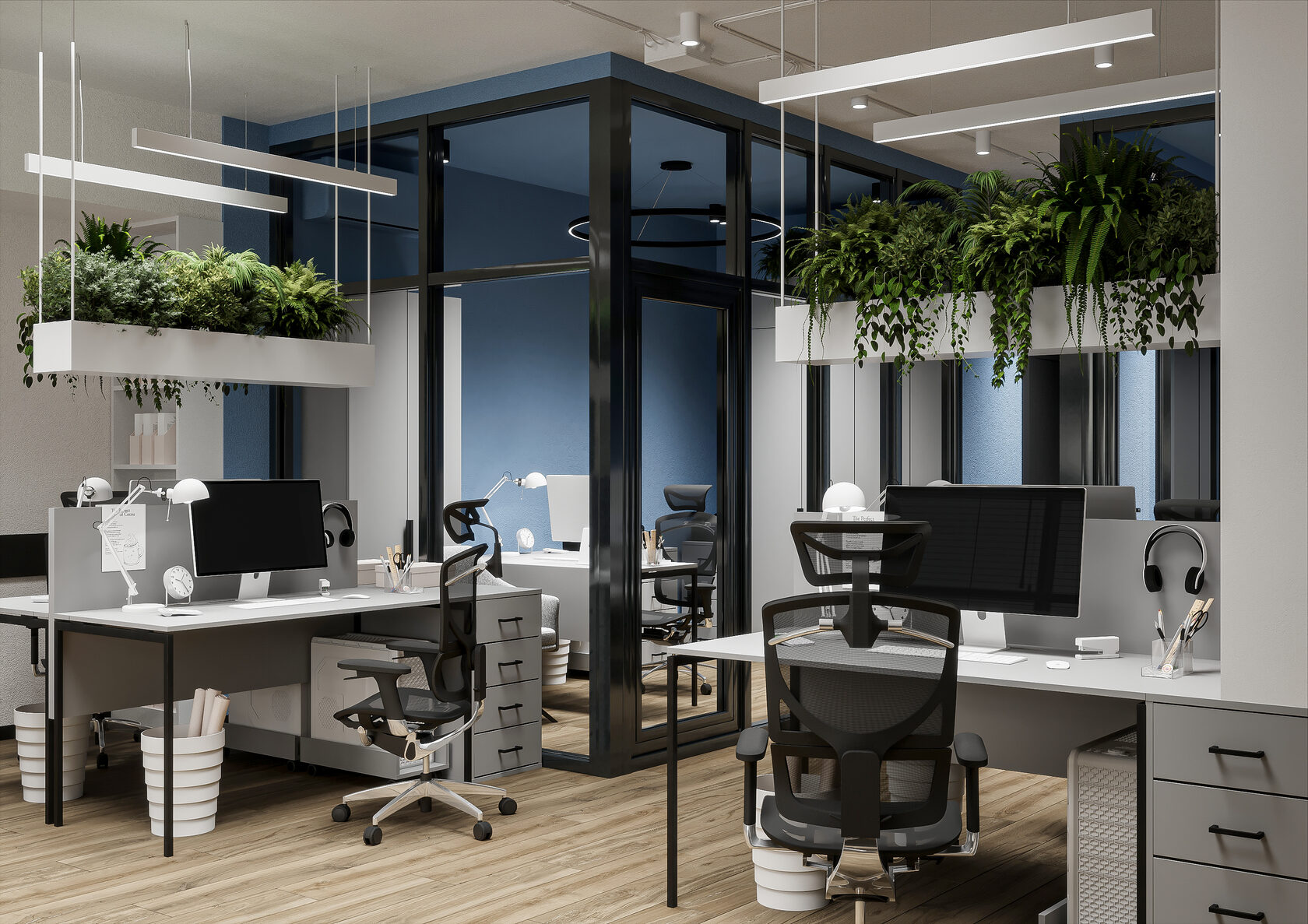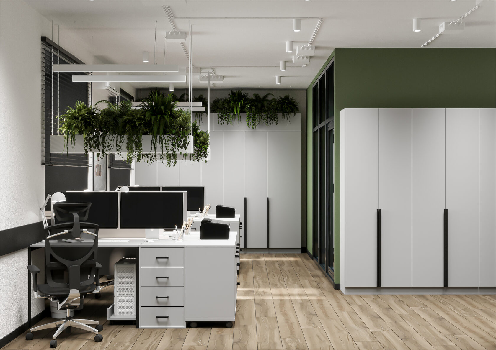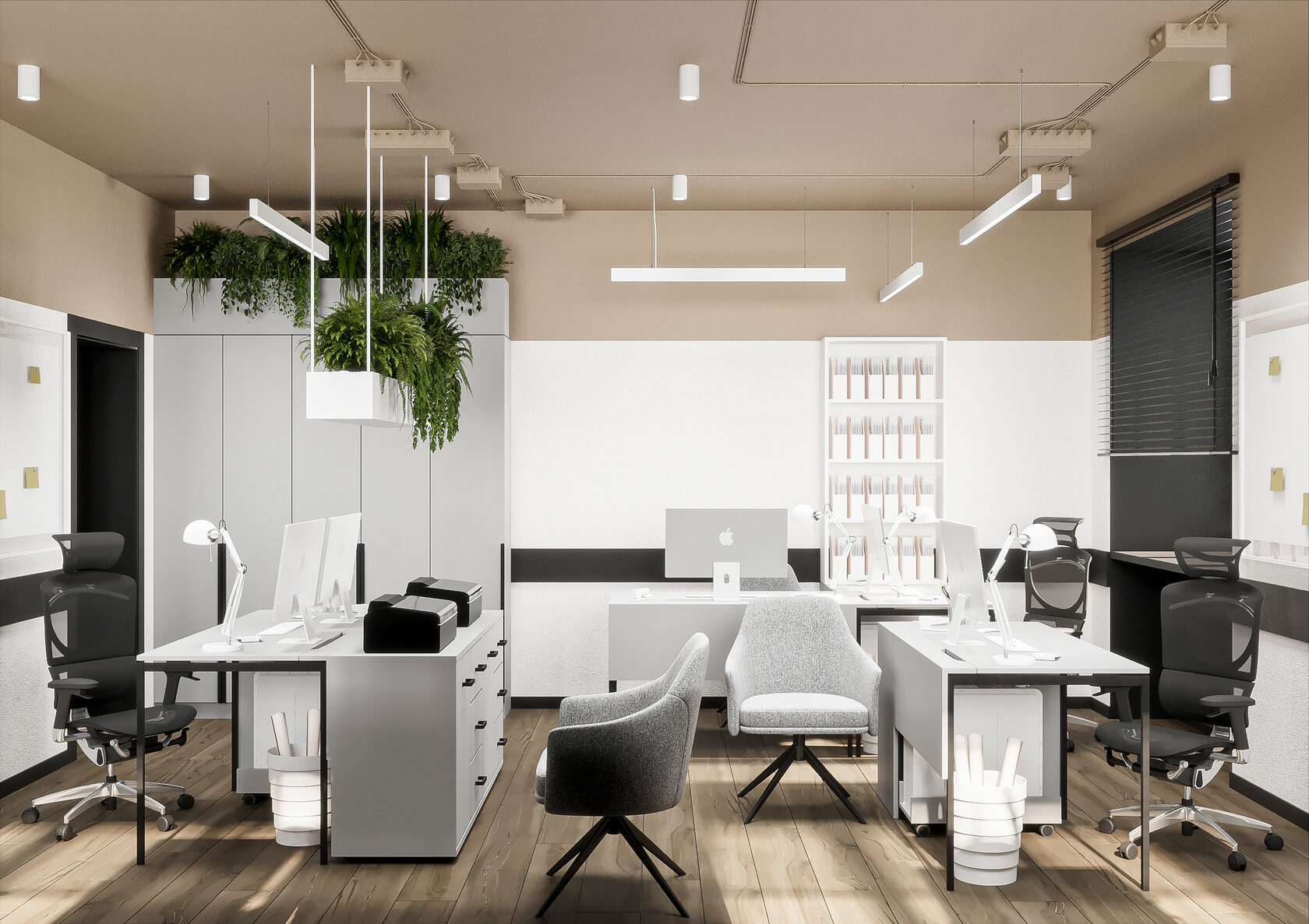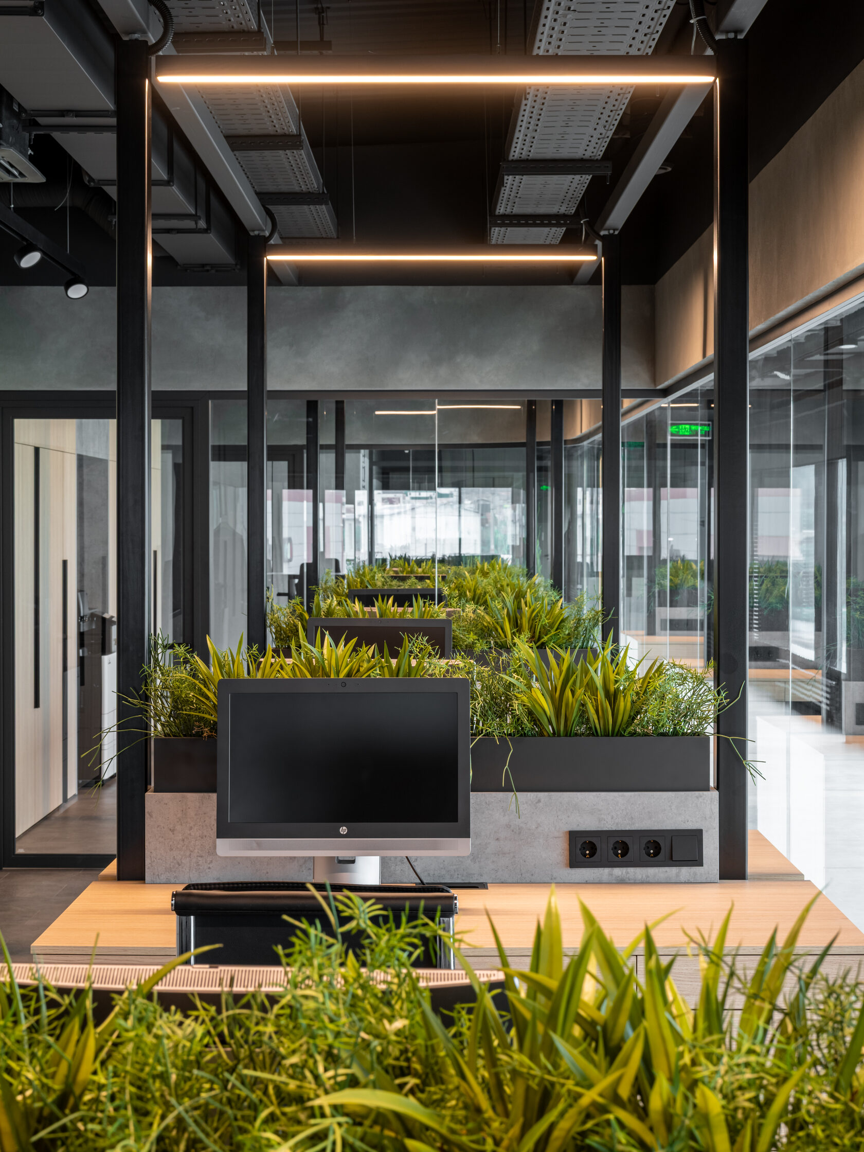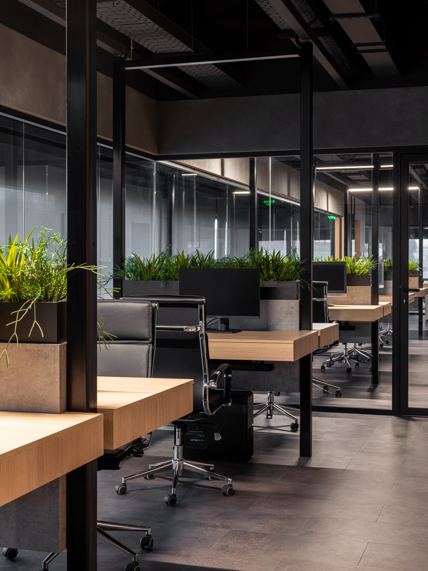 Для контраста добавлены зеленые акценты – растения в зонирующих конструкциях и на рабочих местах
