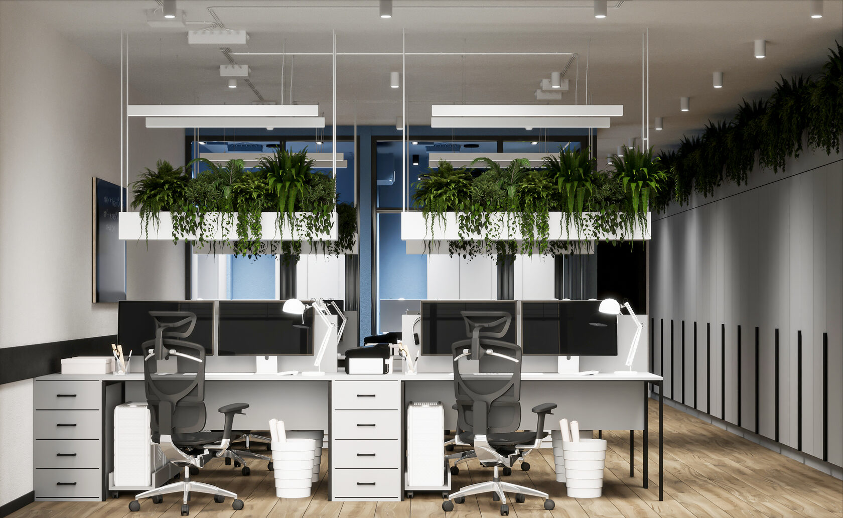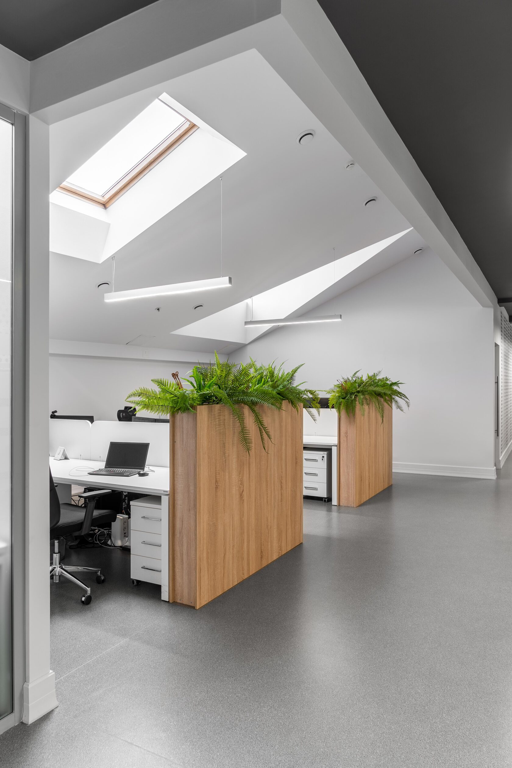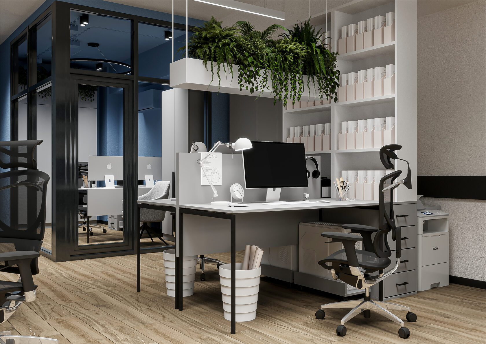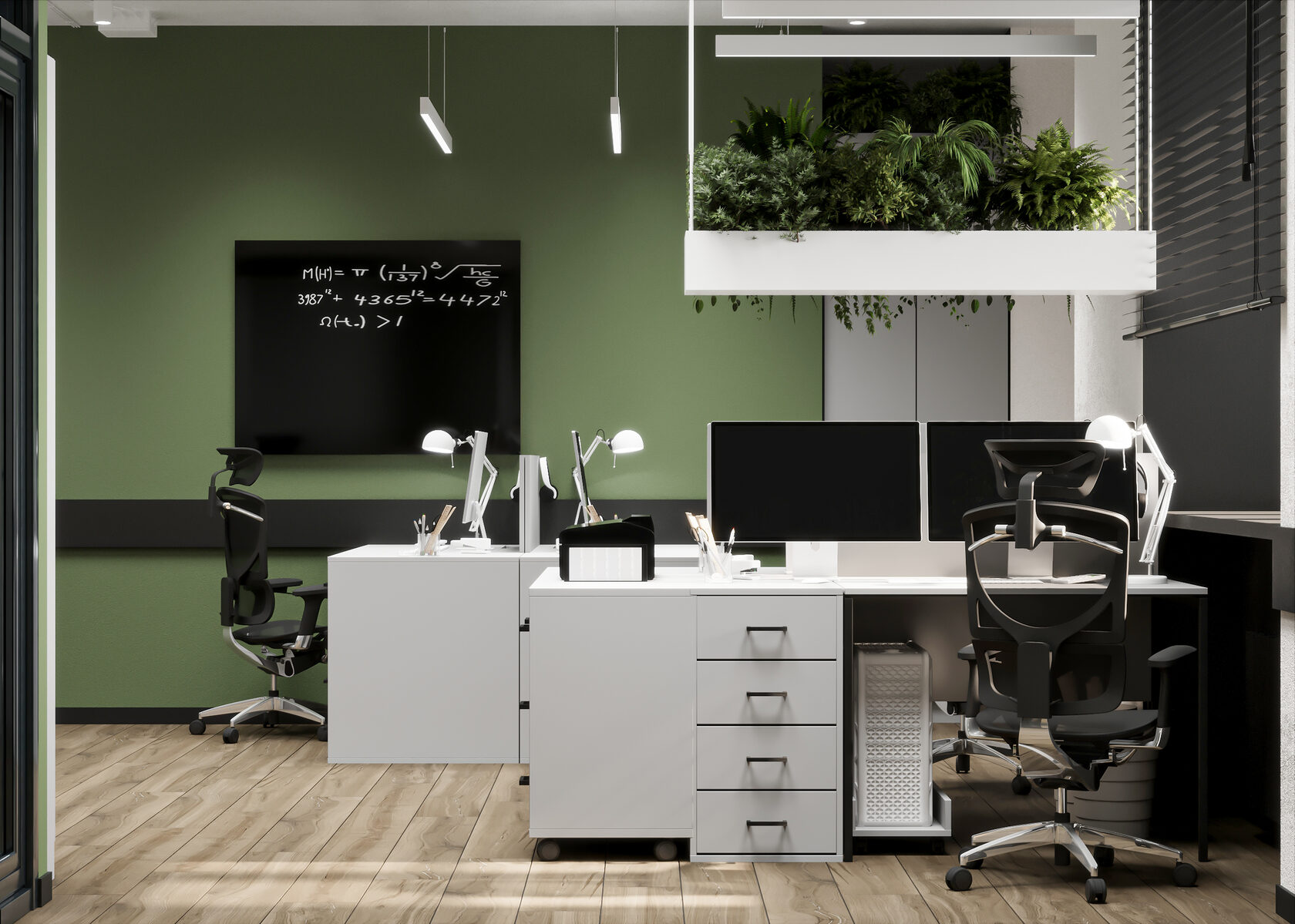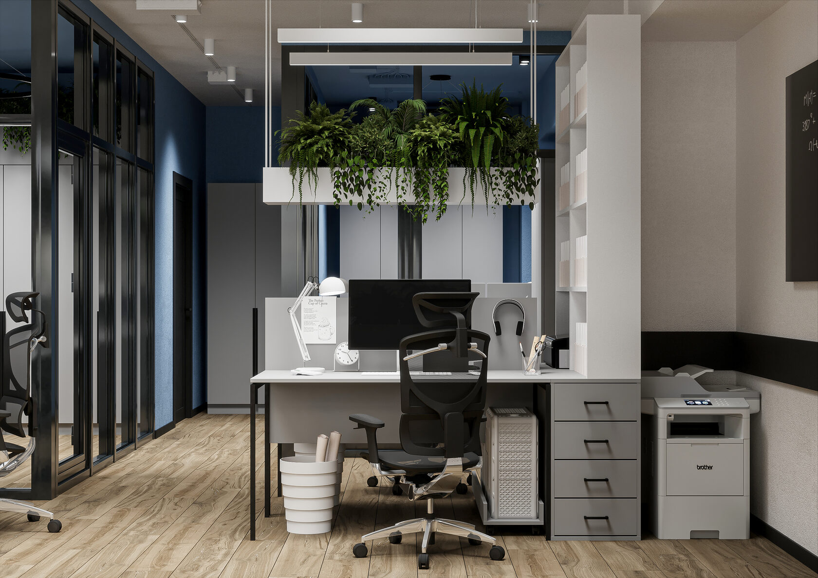 Для контраста добавлены зеленые акценты – растения в зонирующих конструкциях и на рабочих местах