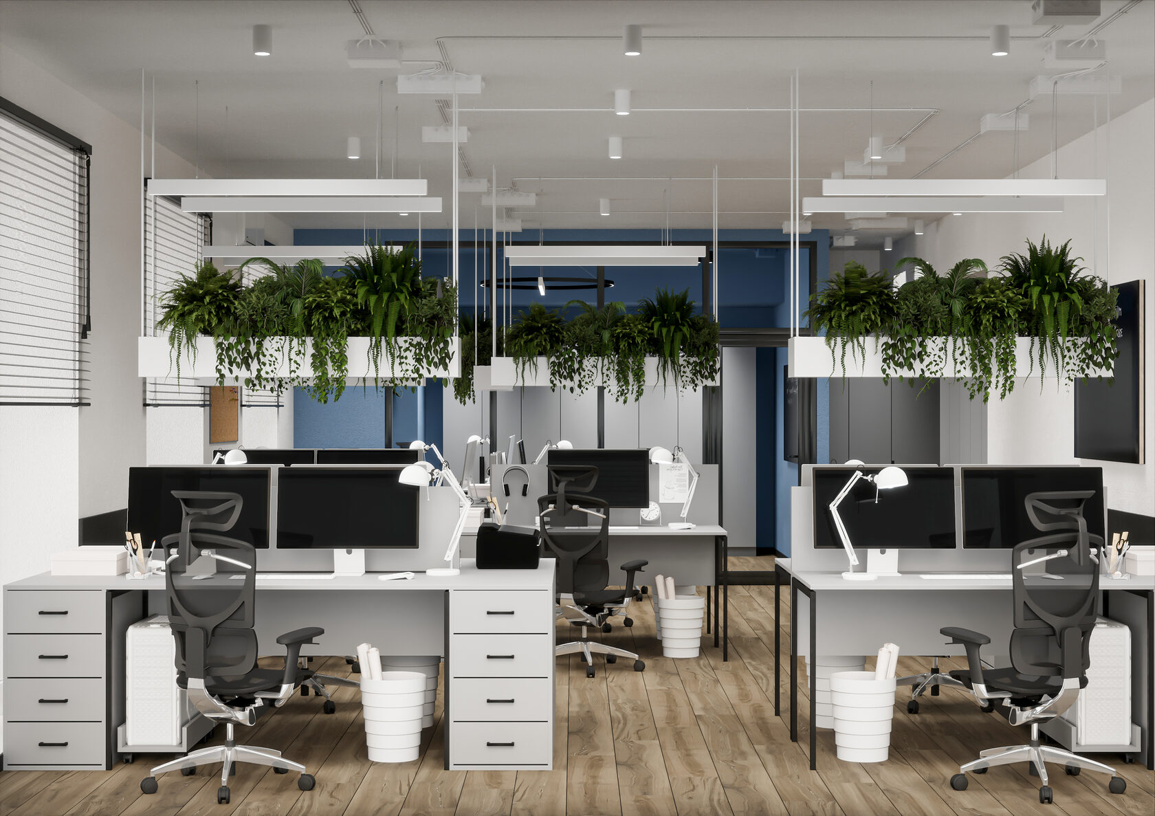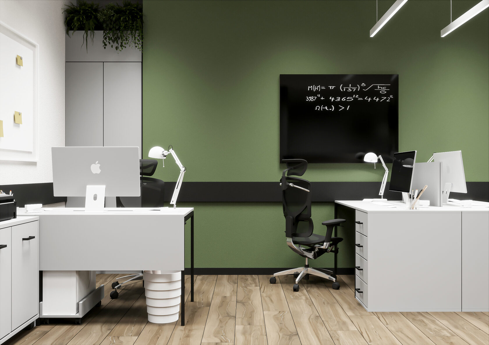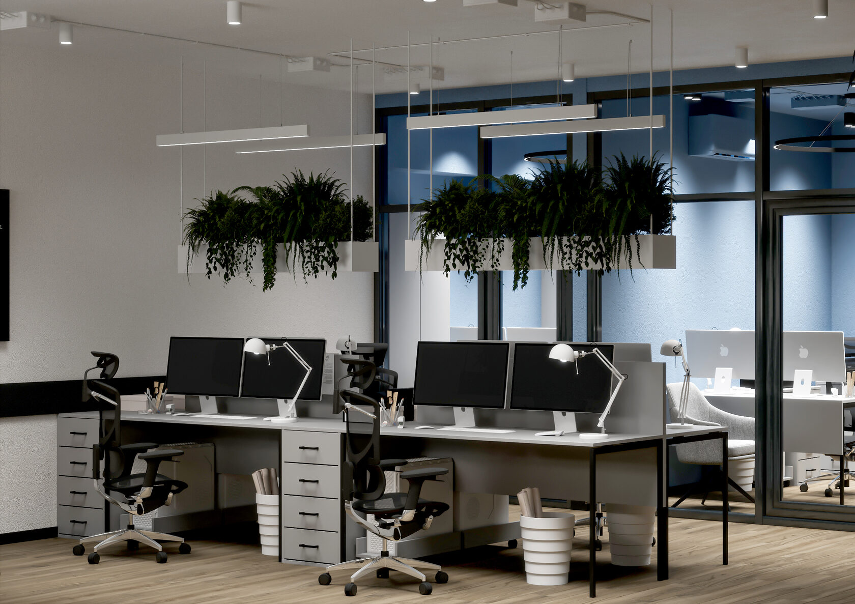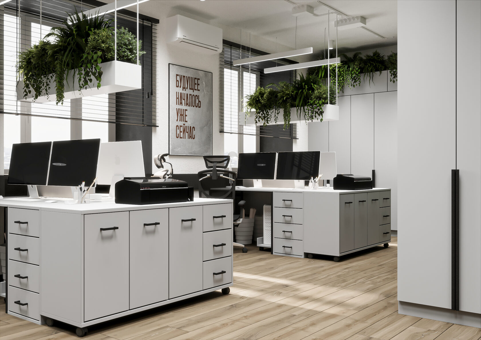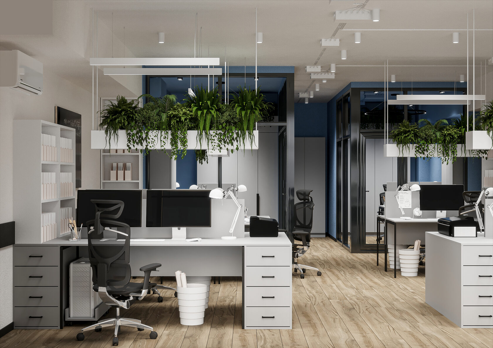 Для контраста добавлены зеленые акценты – растения в зонирующих конструкциях и на рабочих местах