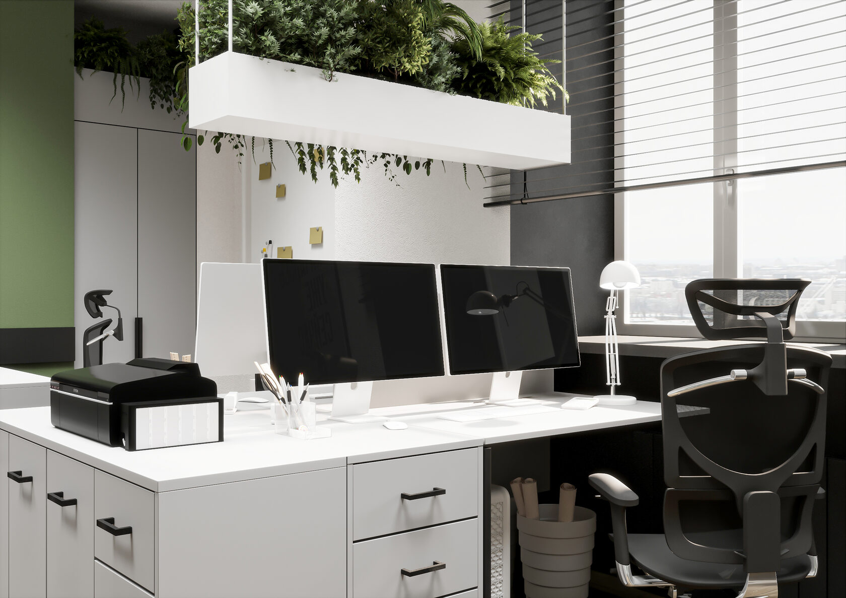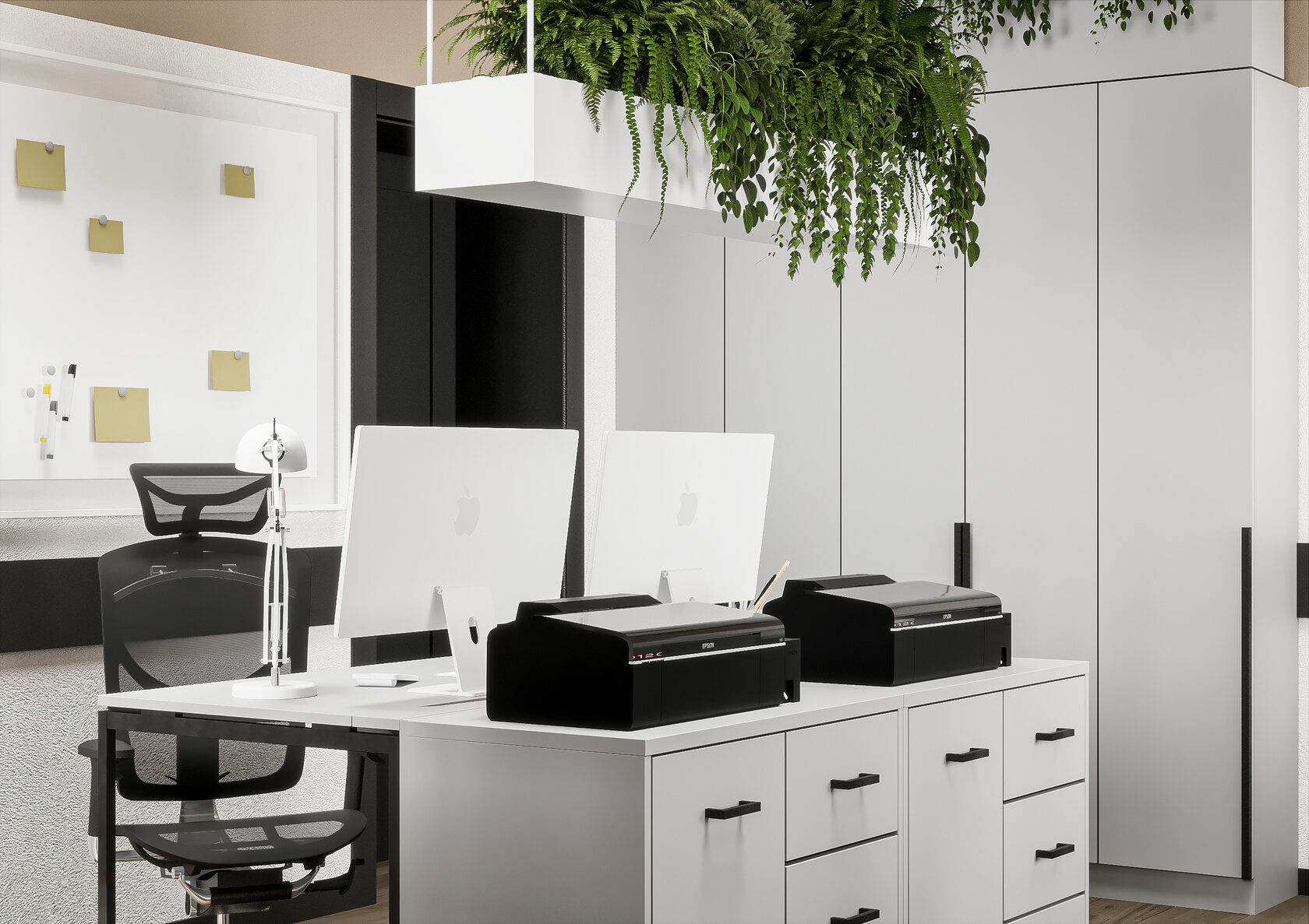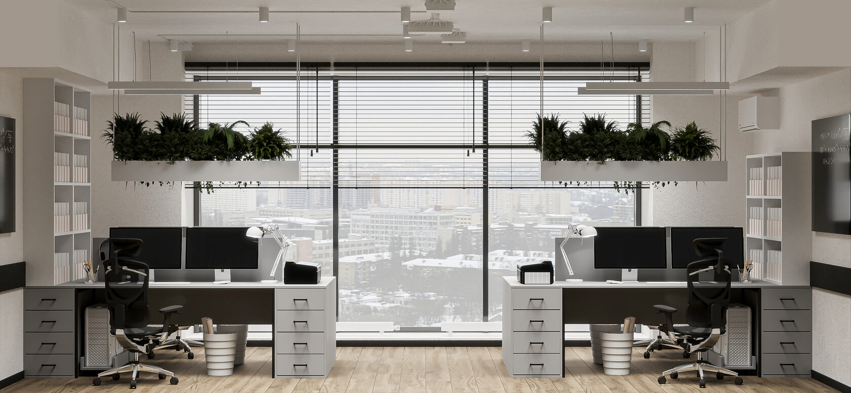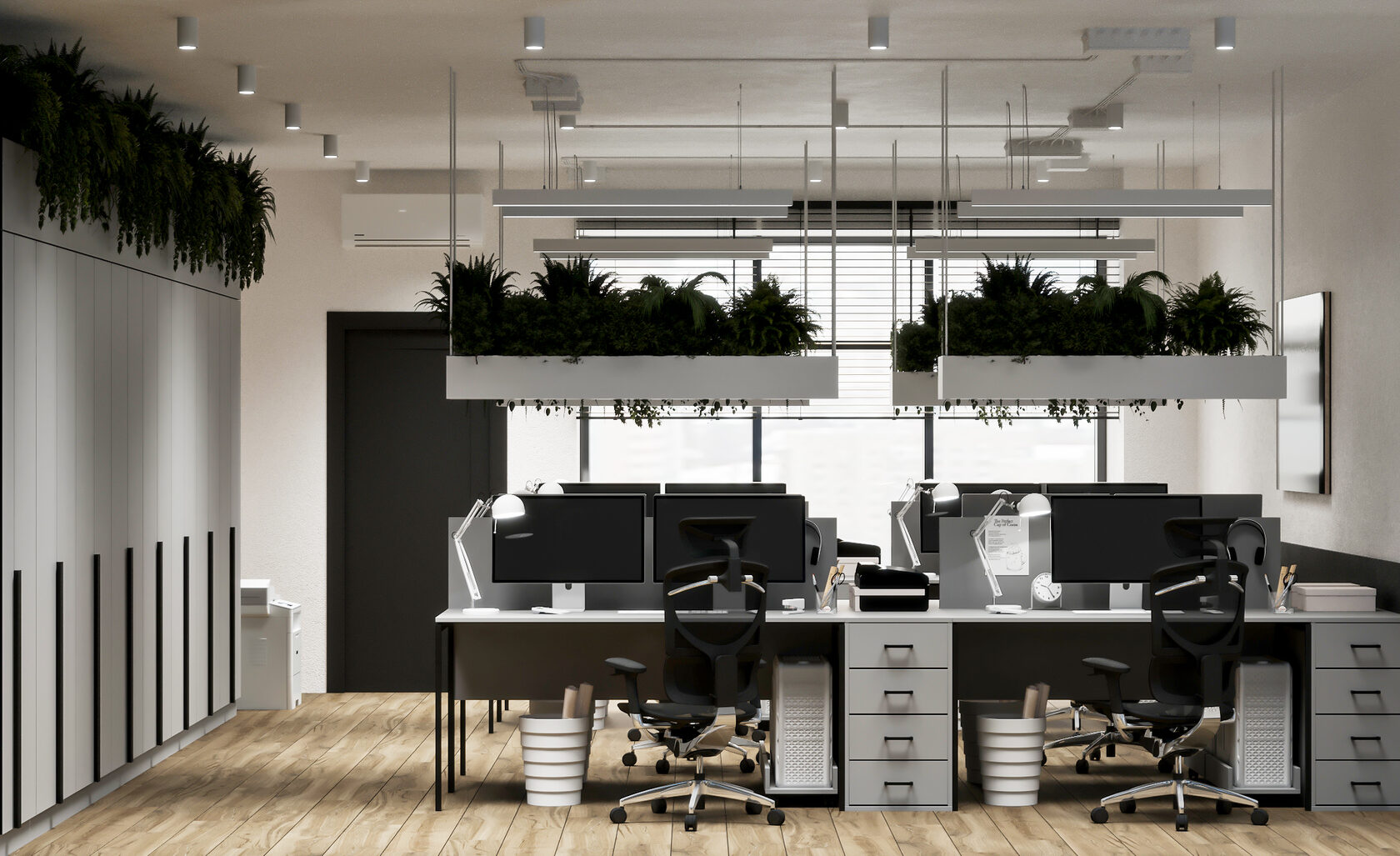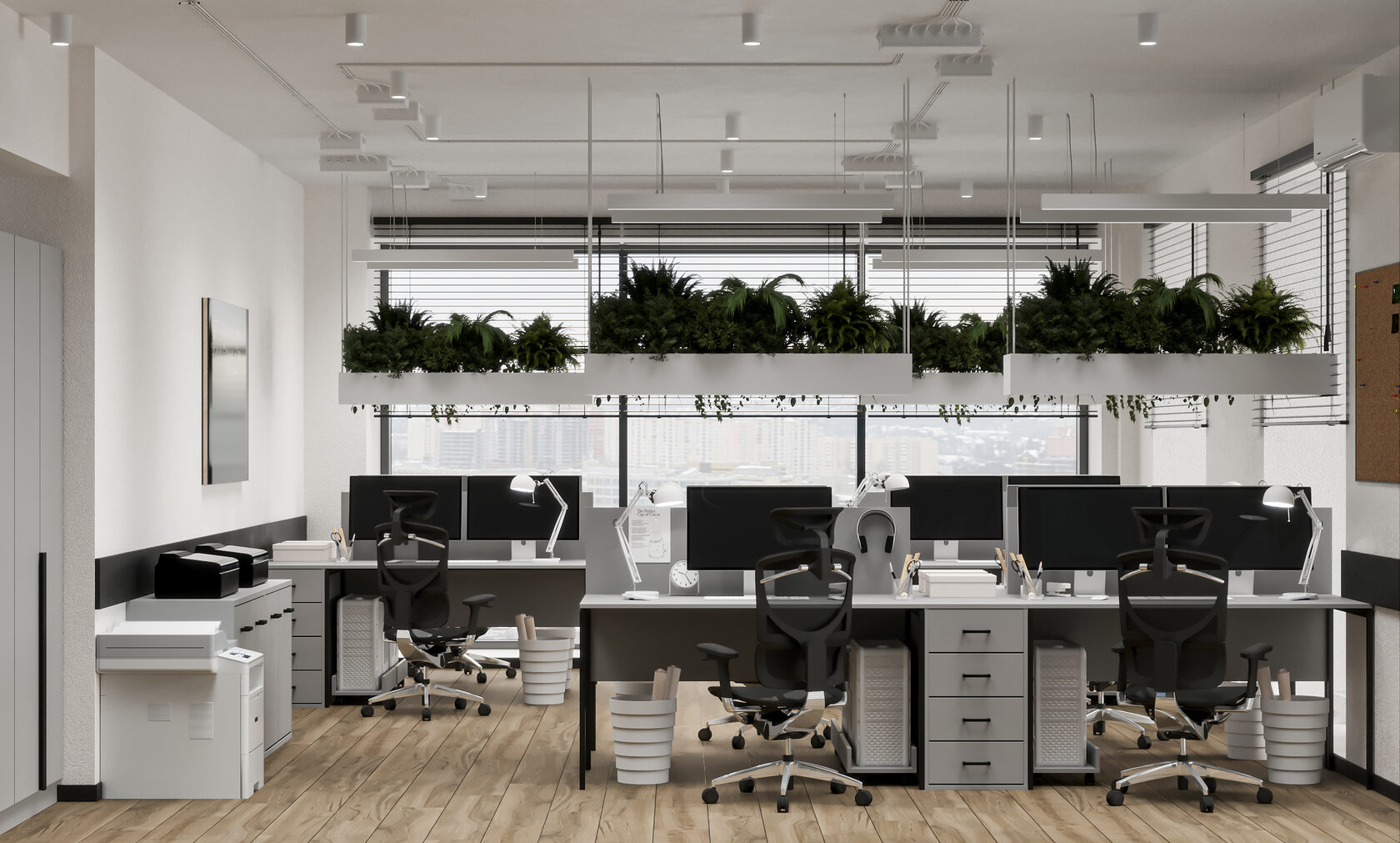 Для контраста добавлены зеленые акценты – растения в зонирующих конструкциях и на рабочих местах
