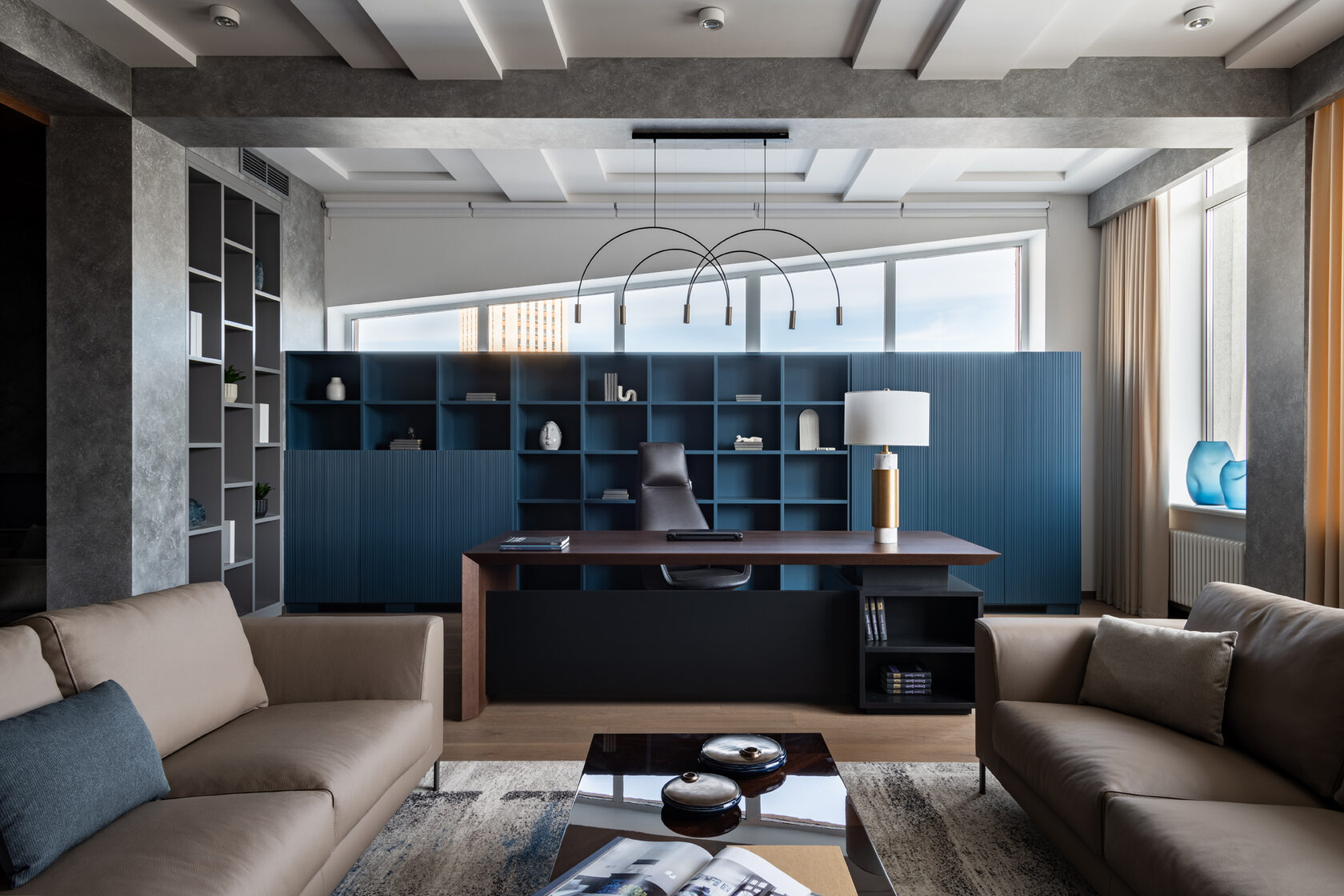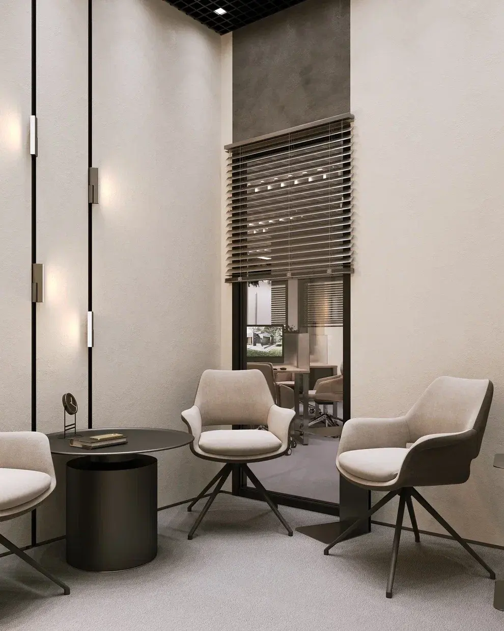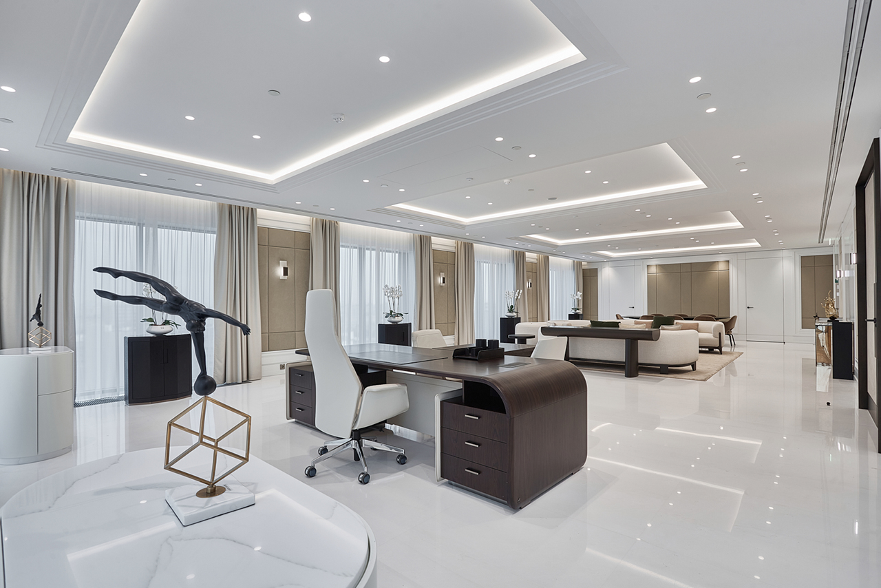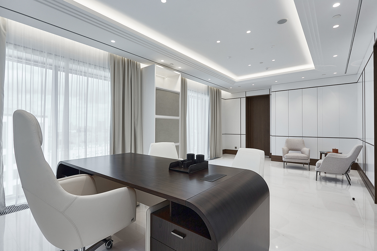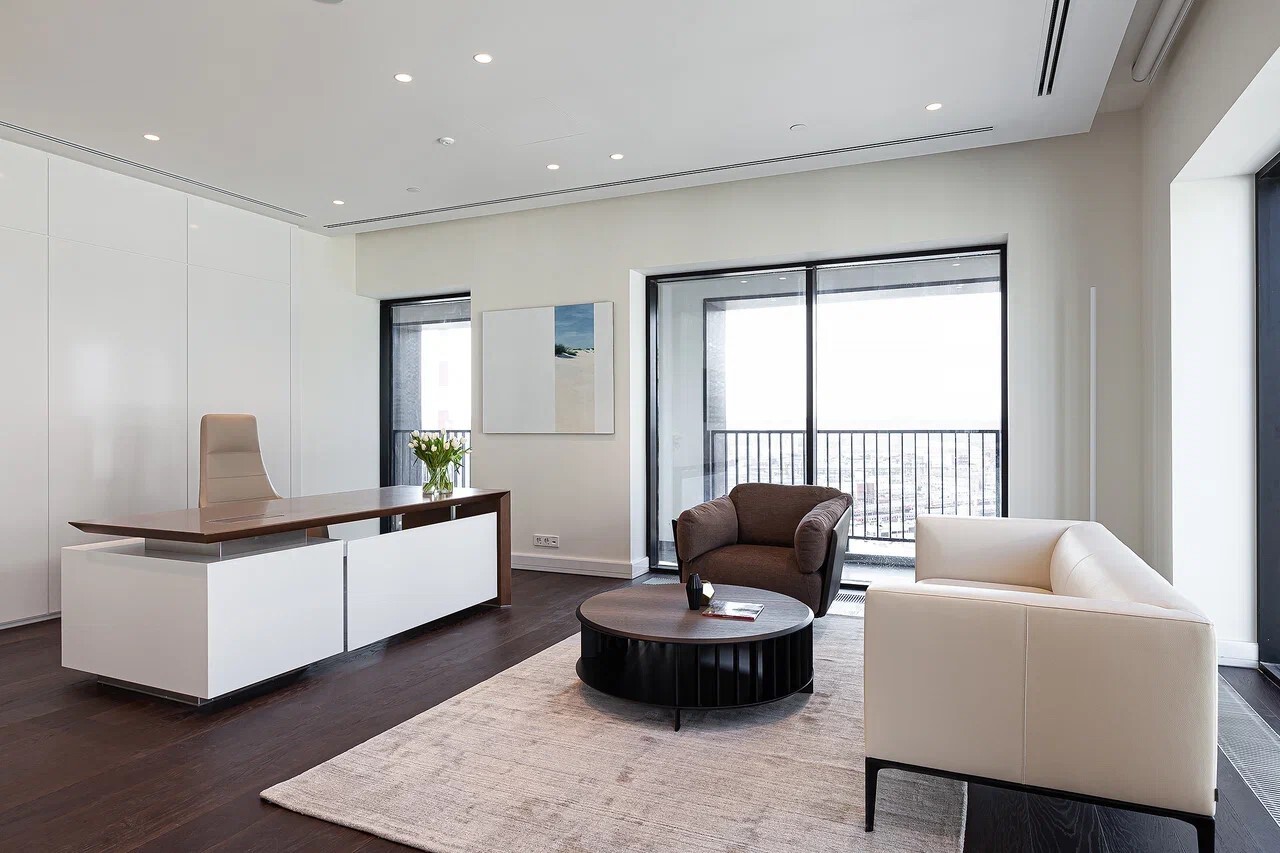 Концепция: Основная концепция — создание представительского пространства, где эффективность работы гармонично сочетается с ощущением уюта и высокого статуса. Интерьер выполнен в спокойной светлой гамме с элегантными контрастными акцентами из металла, дополненный уникальными авторскими элементами декора: от пластичного портала с подсветкой в переговорной до мраморного камина в приватной библиотеке. Использование натуральных материалов высочайшего качества, таких как шпонированные панели и белый мрамор, формирует безупречную эстетику. Продуманная организация пространства с усиленной акустической изоляцией, приватной зоной отдыха и функциональными рабочими блоками обеспечивает непревзойденный уровень комфорта и конфиденциальности.