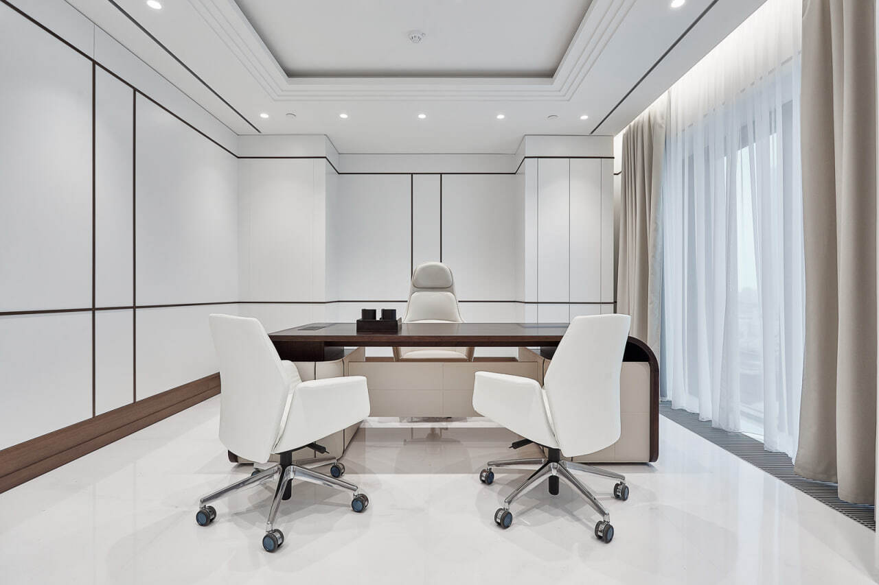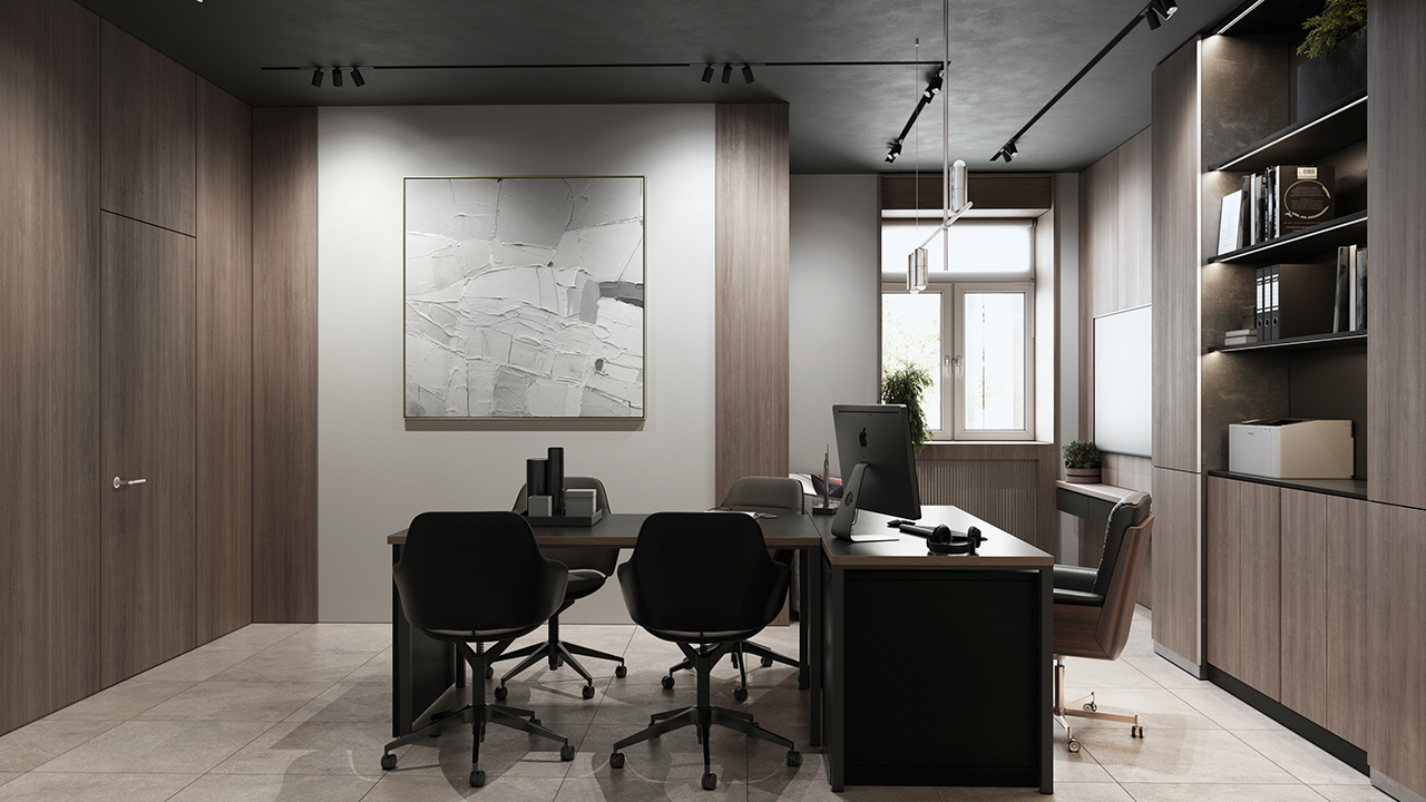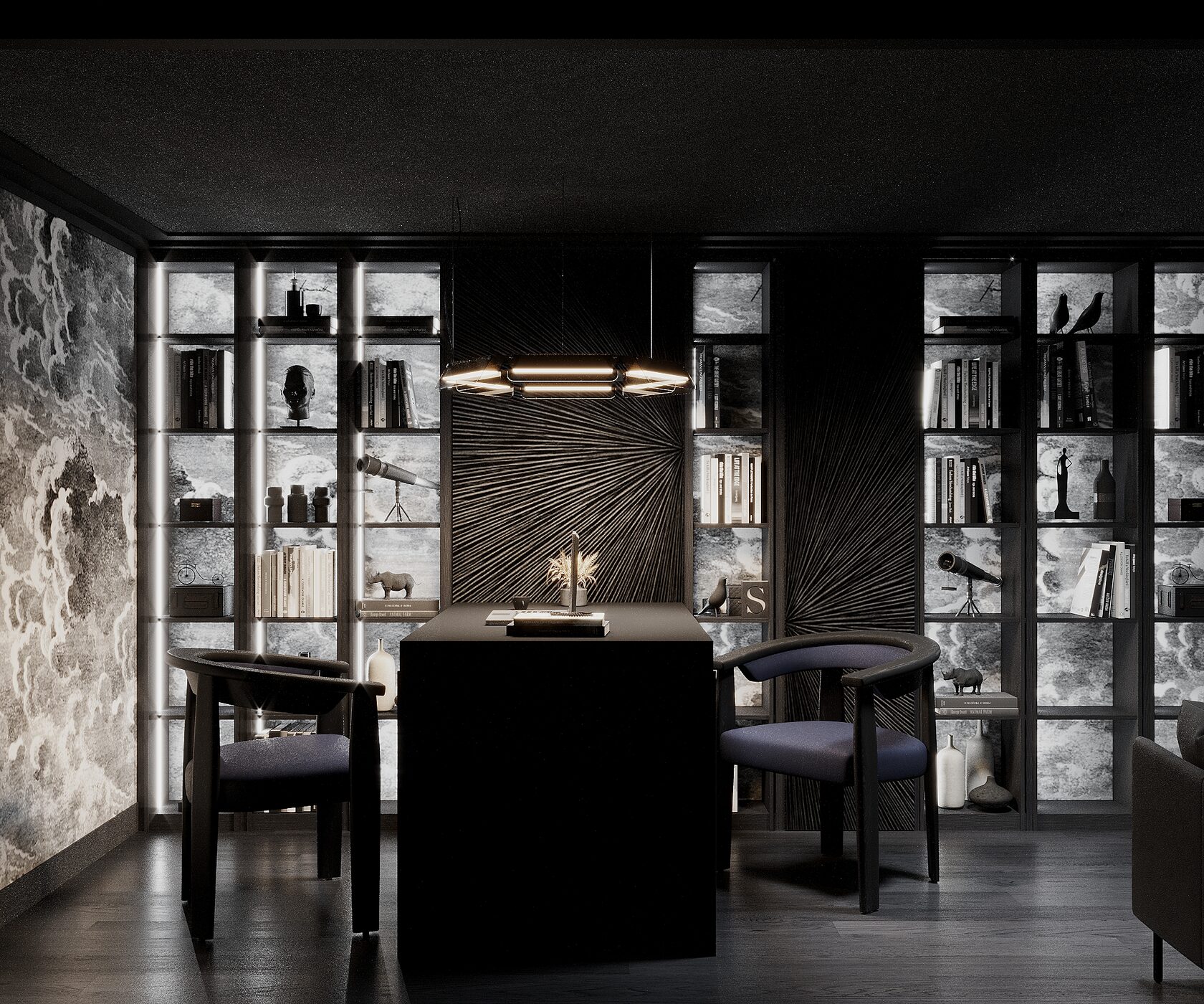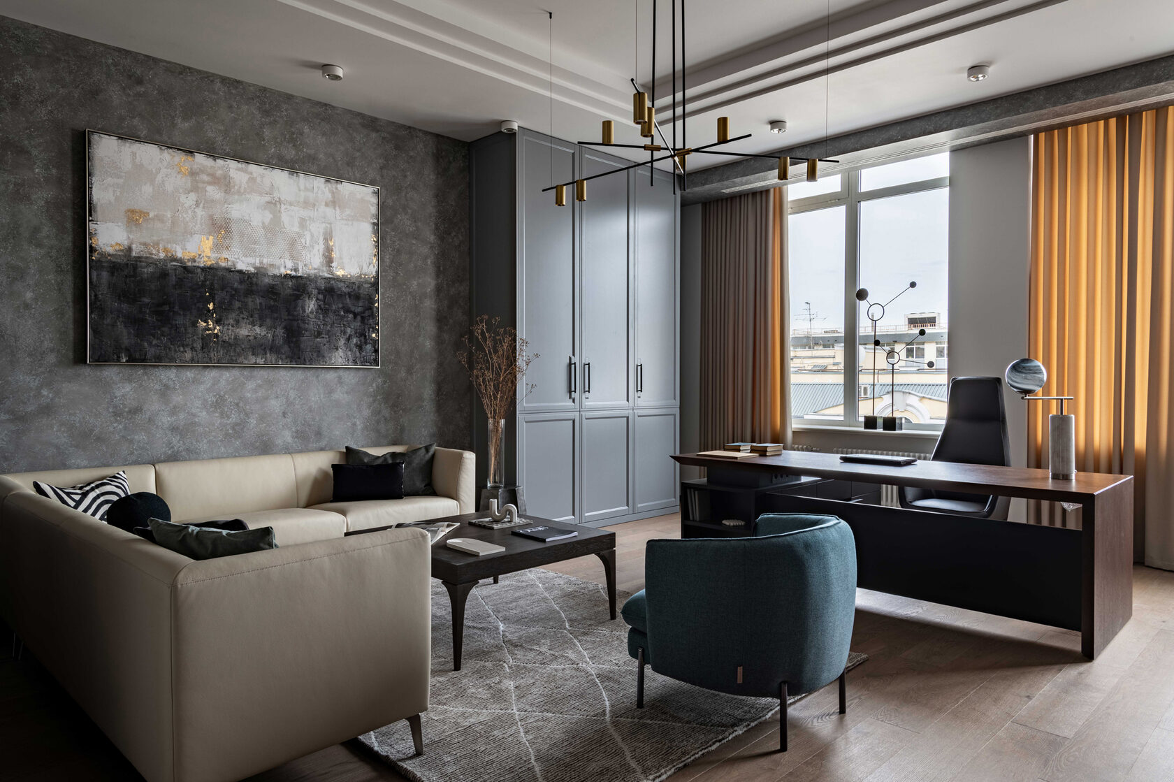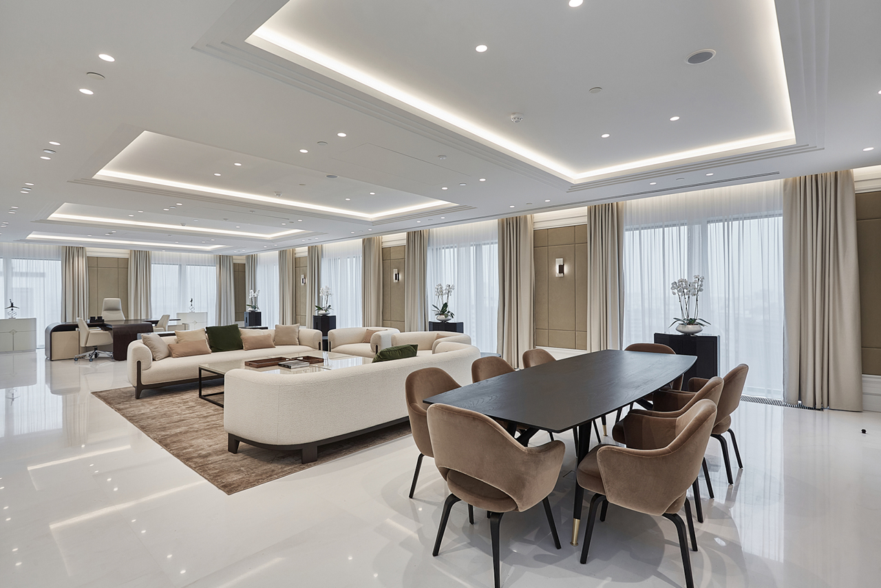 Концепция: Основная концепция — создание представительского пространства, где эффективность работы гармонично сочетается с ощущением уюта и высокого статуса. Интерьер выполнен в спокойной светлой гамме с элегантными контрастными акцентами из металла, дополненный уникальными авторскими элементами декора: от пластичного портала с подсветкой в переговорной до мраморного камина в приватной библиотеке. Использование натуральных материалов высочайшего качества, таких как шпонированные панели и белый мрамор, формирует безупречную эстетику. Продуманная организация пространства с усиленной акустической изоляцией, приватной зоной отдыха и функциональными рабочими блоками обеспечивает непревзойденный уровень комфорта и конфиденциальности.