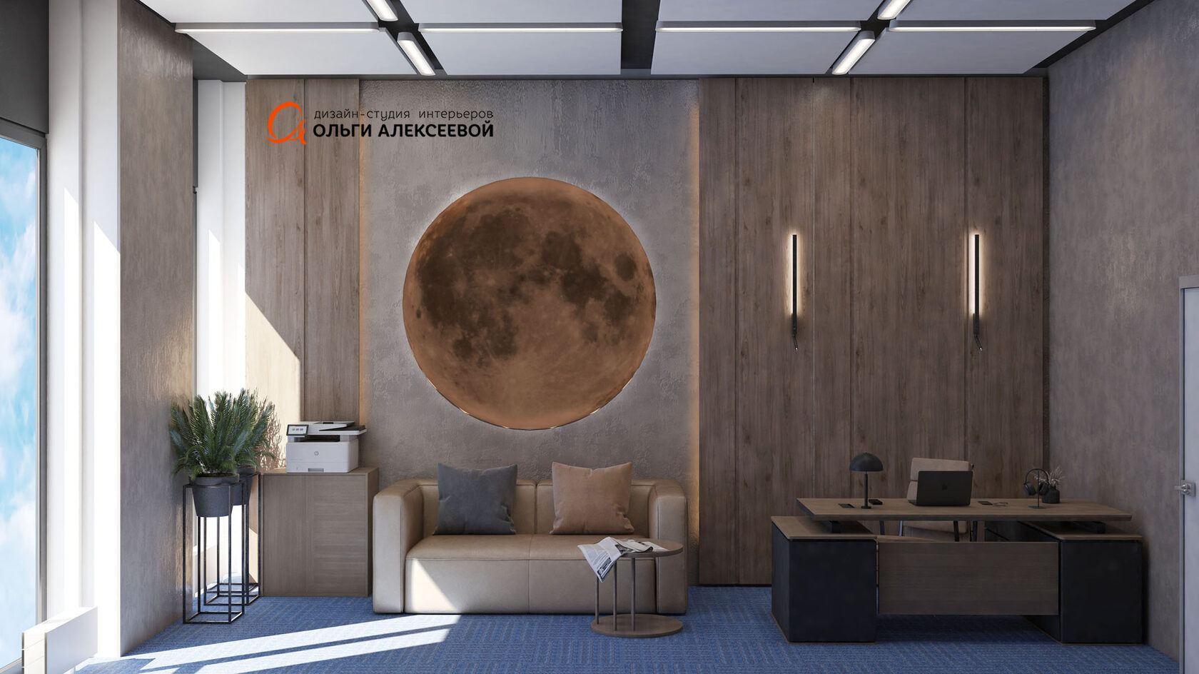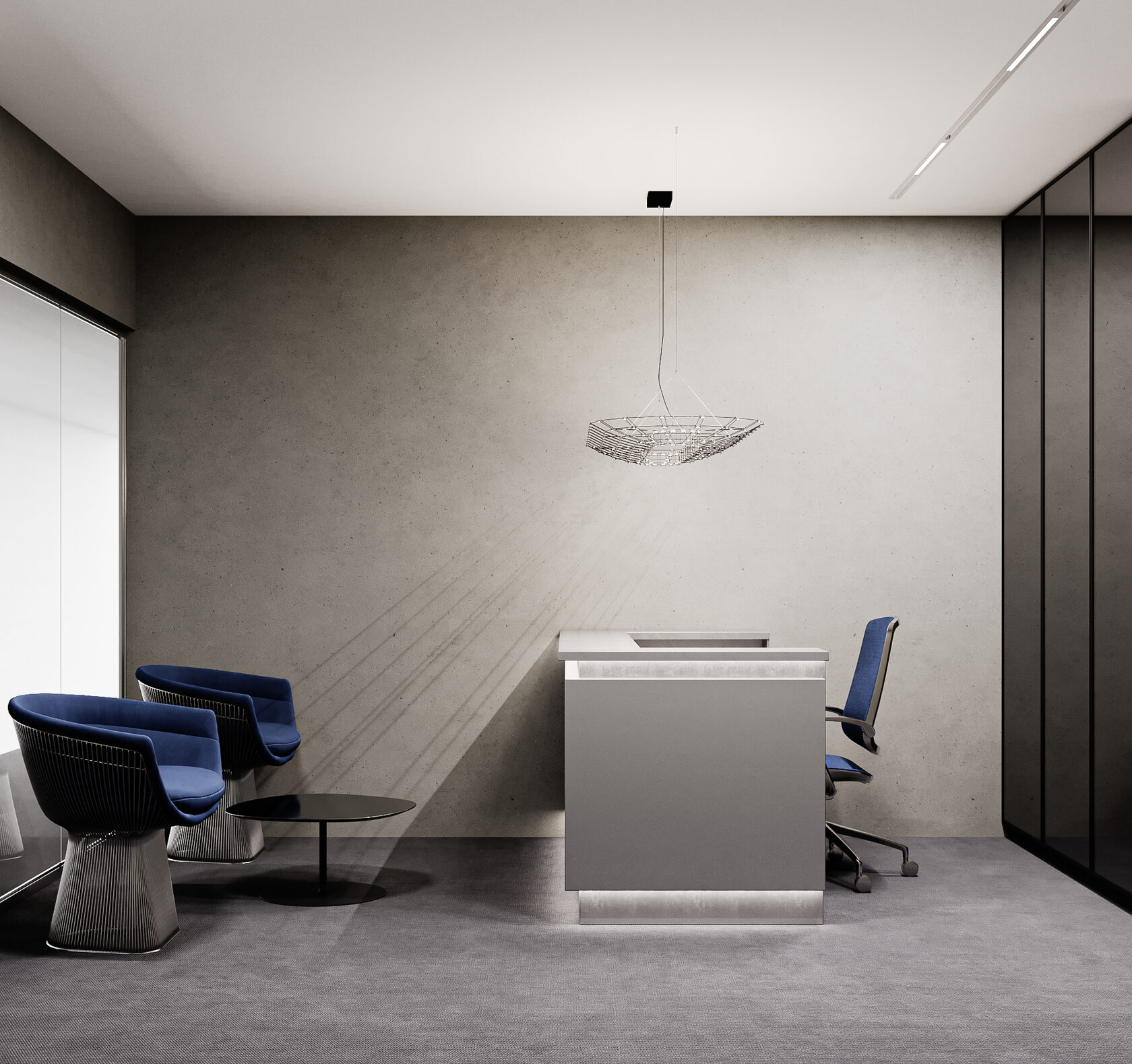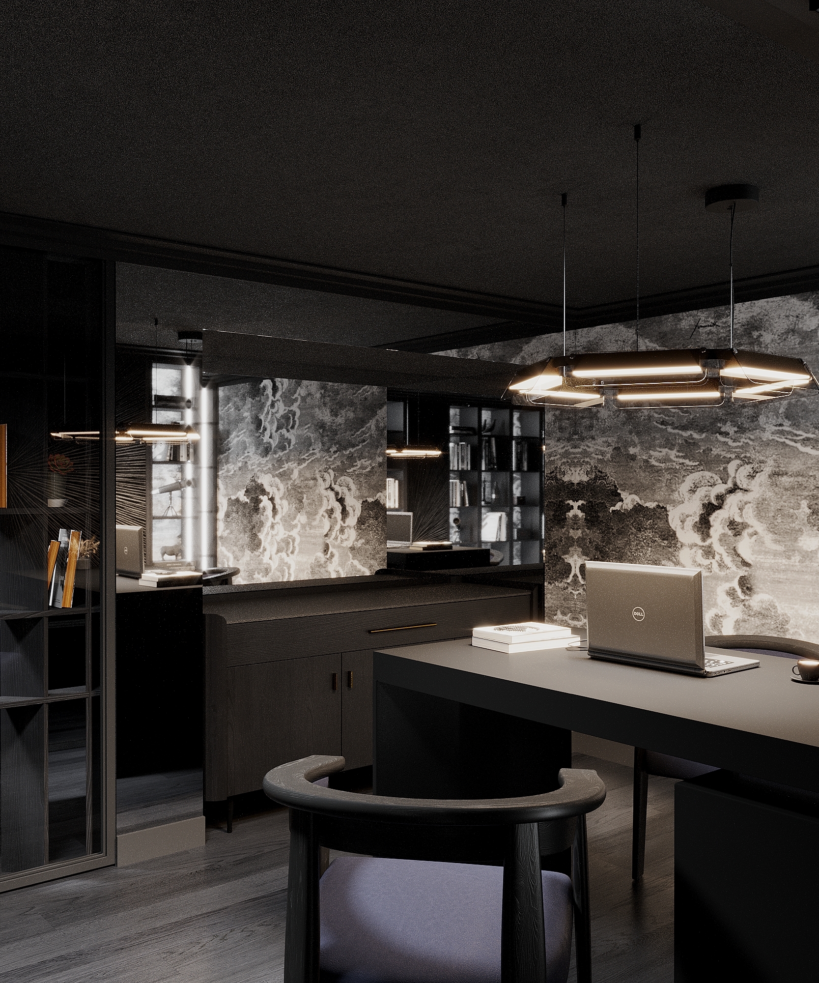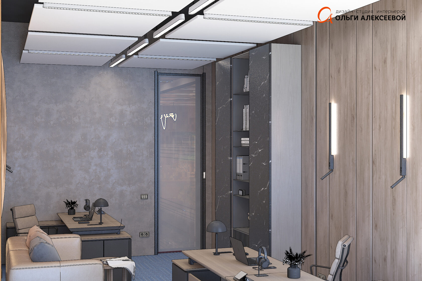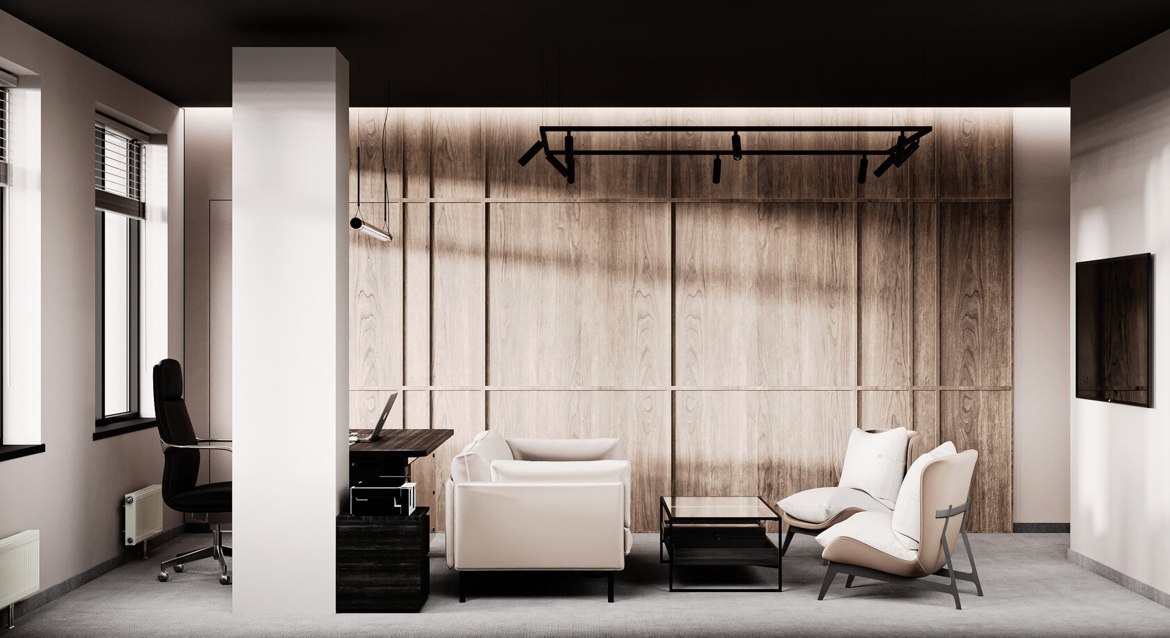 Концепция: Основная концепция — создание представительского пространства, где эффективность работы гармонично сочетается с ощущением уюта и высокого статуса. Интерьер выполнен в спокойной светлой гамме с элегантными контрастными акцентами из металла, дополненный уникальными авторскими элементами декора: от пластичного портала с подсветкой в переговорной до мраморного камина в приватной библиотеке. Использование натуральных материалов высочайшего качества, таких как шпонированные панели и белый мрамор, формирует безупречную эстетику. Продуманная организация пространства с усиленной акустической изоляцией, приватной зоной отдыха и функциональными рабочими блоками обеспечивает непревзойденный уровень комфорта и конфиденциальности.