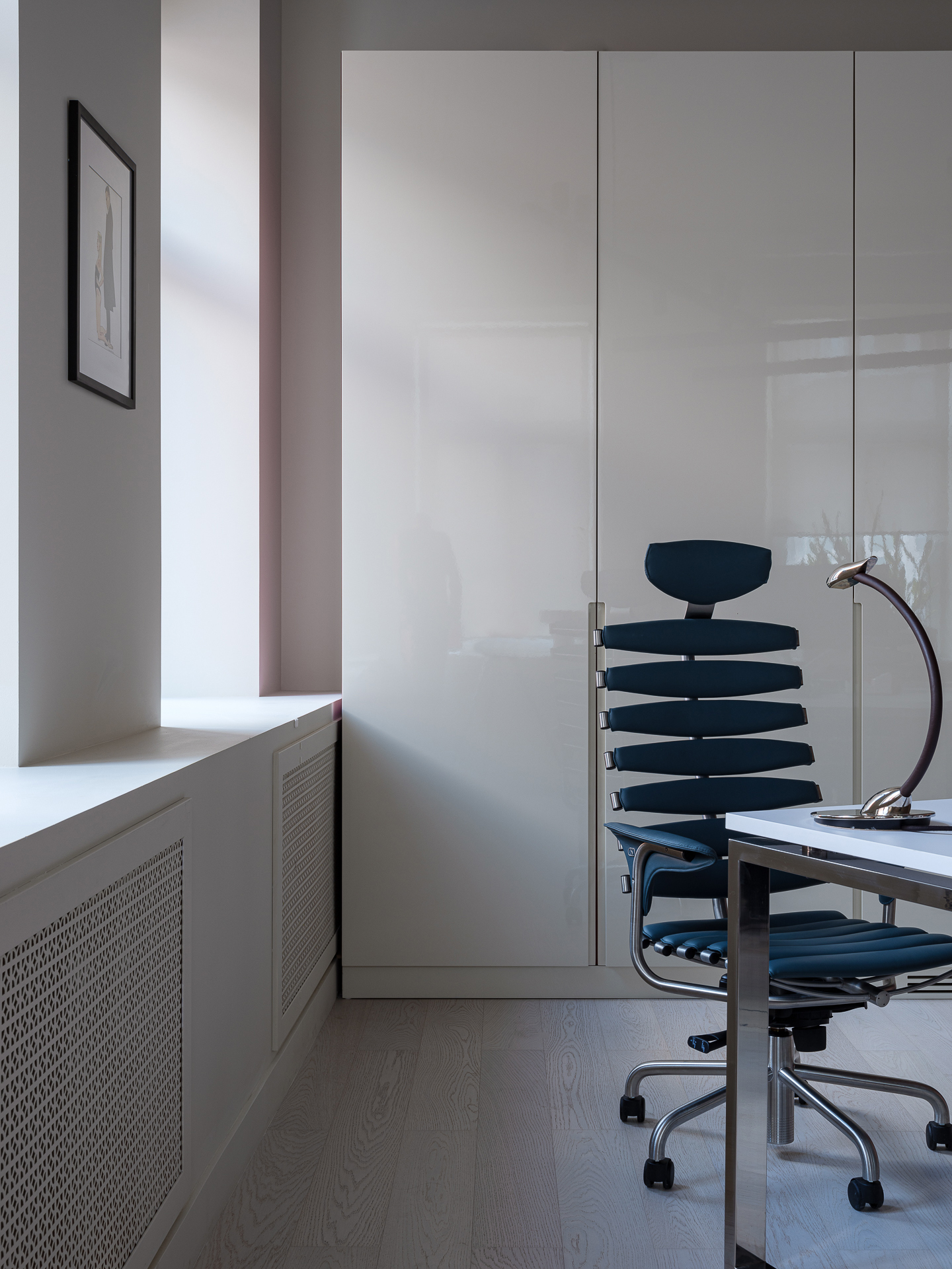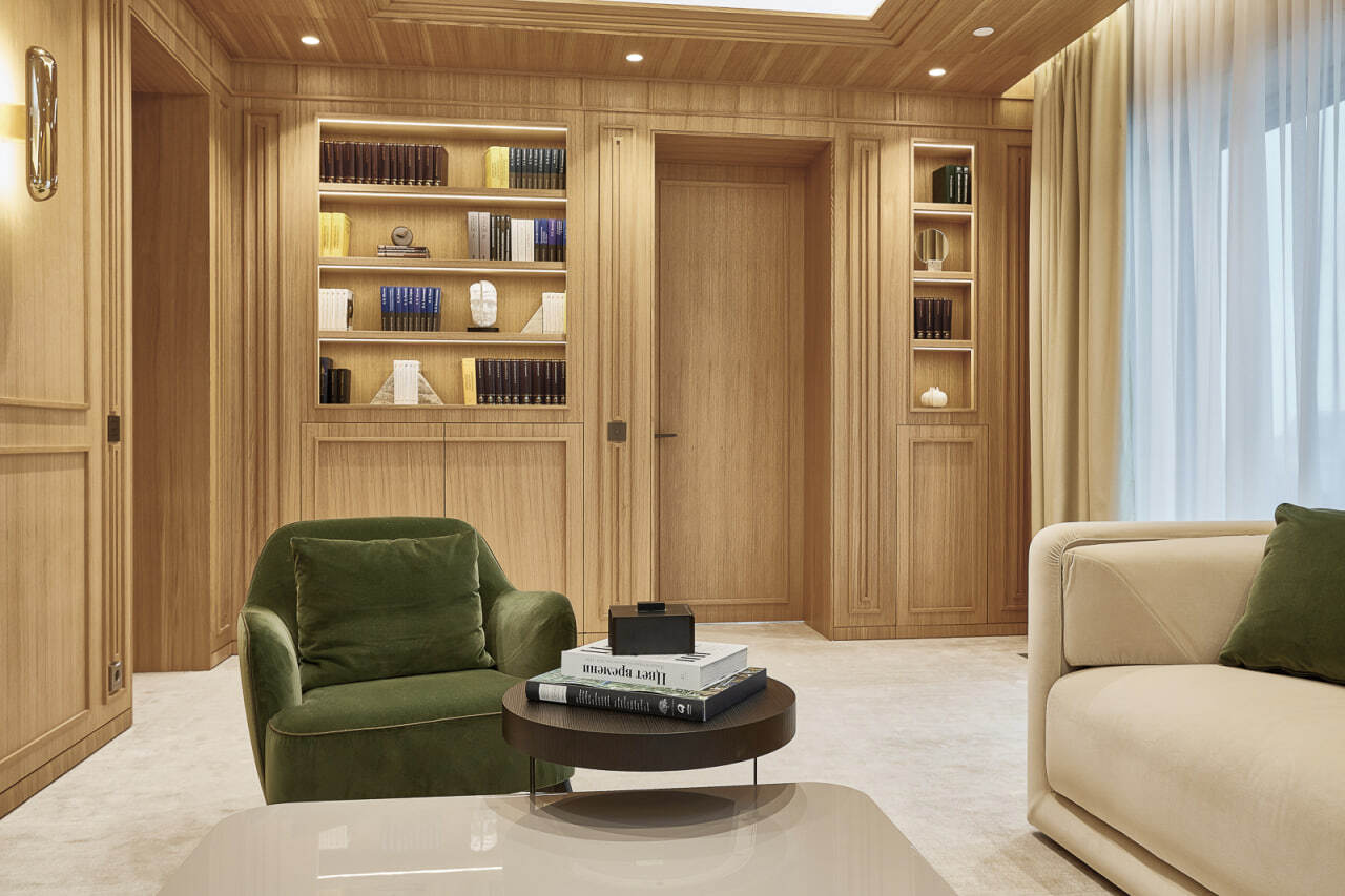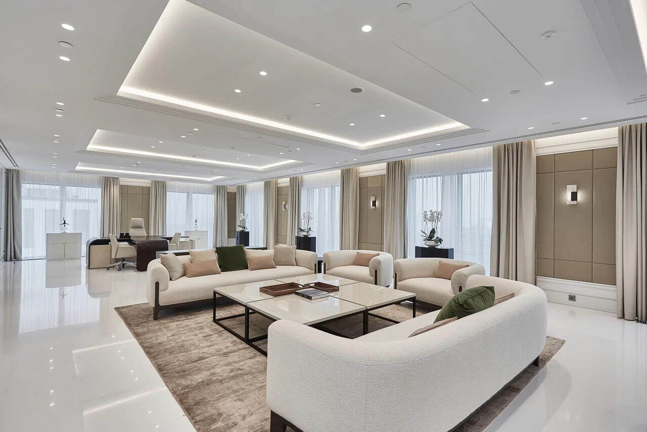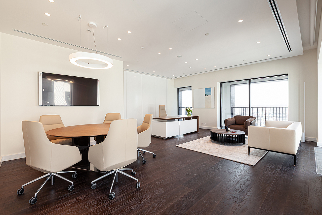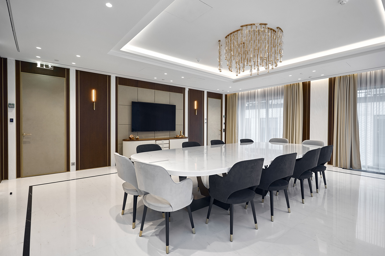 Концепция: Основная концепция — создание представительского пространства, где эффективность работы гармонично сочетается с ощущением уюта и высокого статуса. Интерьер выполнен в спокойной светлой гамме с элегантными контрастными акцентами из металла, дополненный уникальными авторскими элементами декора: от пластичного портала с подсветкой в переговорной до мраморного камина в приватной библиотеке. Использование натуральных материалов высочайшего качества, таких как шпонированные панели и белый мрамор, формирует безупречную эстетику. Продуманная организация пространства с усиленной акустической изоляцией, приватной зоной отдыха и функциональными рабочими блоками обеспечивает непревзойденный уровень комфорта и конфиденциальности.