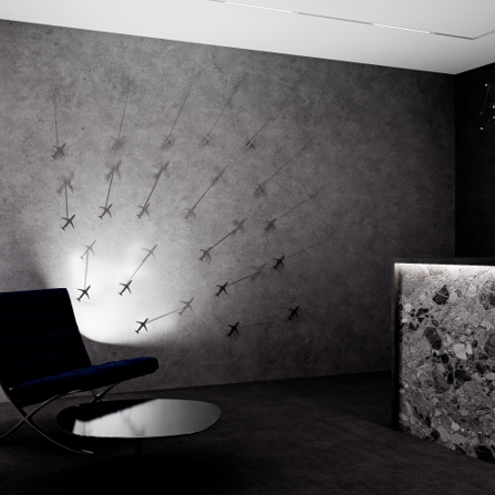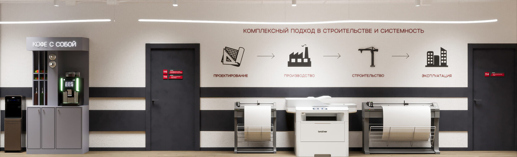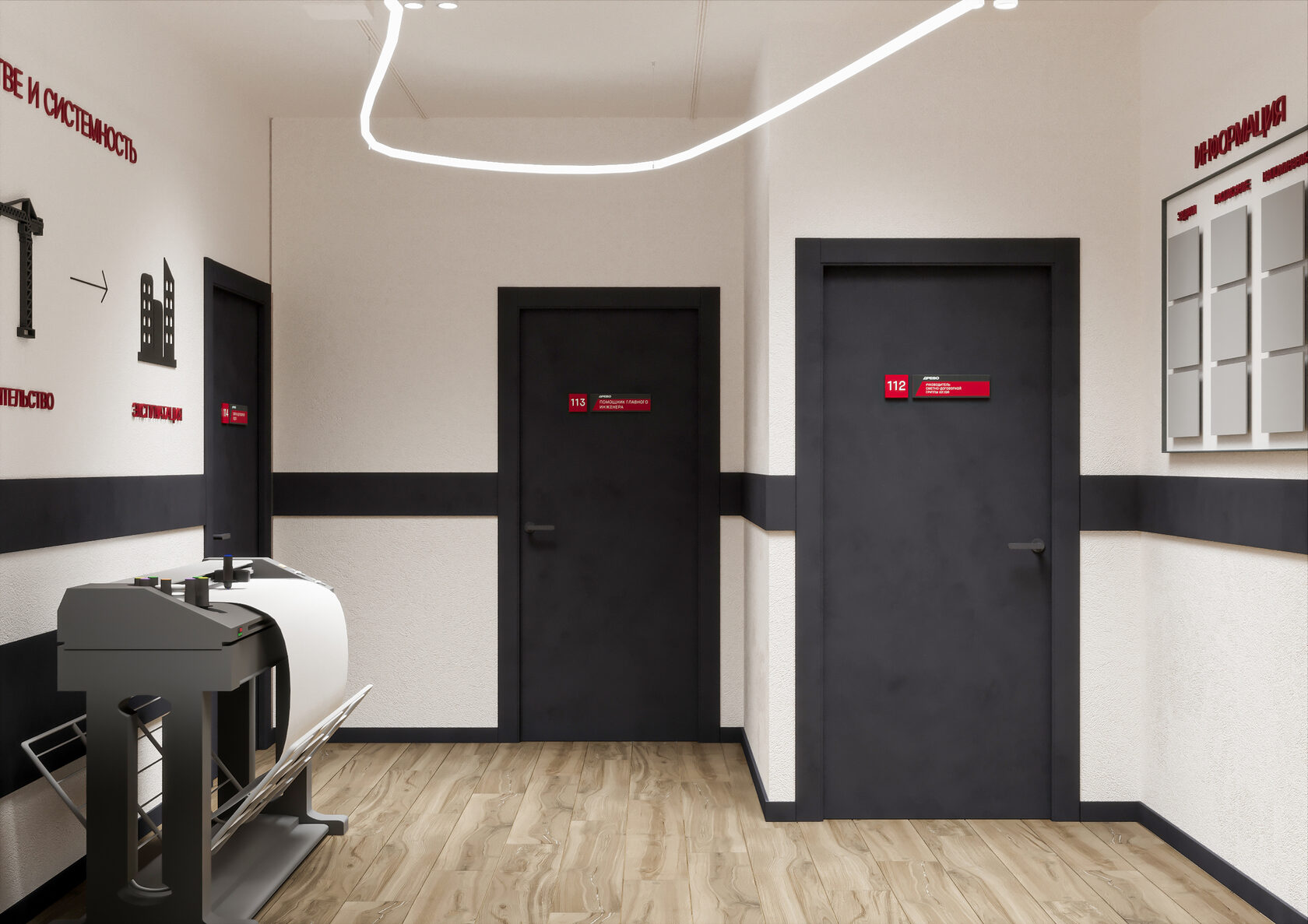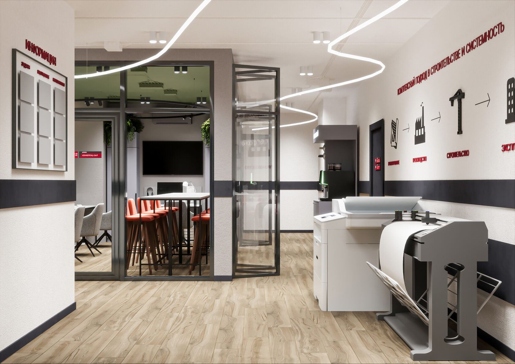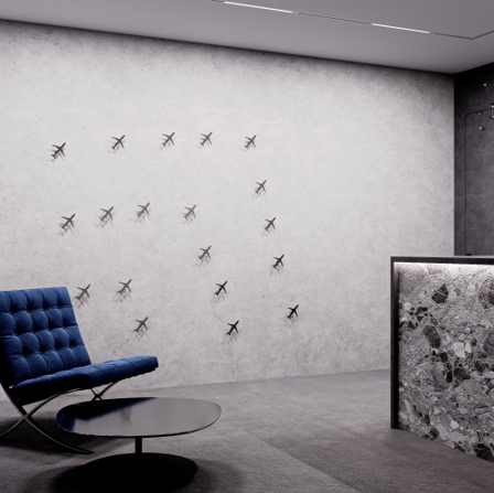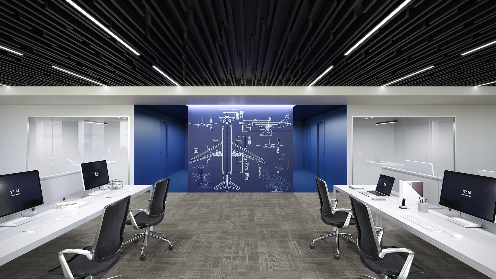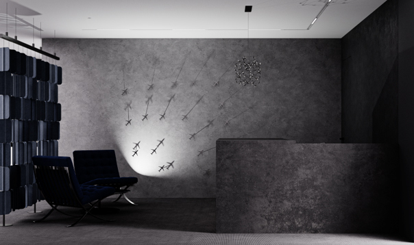 Концепция: Основная концепция проекта заключалась в гармоничном сочетании функциональности, современного дизайна и глубокой интеграции корпоративной идентичности. Для создания ощущения открытости и единства, а также максимального проникновения естественного света, стены, граничащие с Open Space, были выполнены из панорамного остекления от пола до потолка с градиентным тонированием. Кабинеты, расположенные по периметру внутреннего атриума, формируют динамичную визуальную среду, подчеркивая статус и оставаясь при этом максимально функциональными. Тематические акценты, такие как масштабные изображения чертежей самолетов, служат не только навигационными точками, но и мощными визуальными элементами, погружающими в мир авиапроектирования. Зона ресепшена акцентирована облицовкой из стальных листов с заклепками, напрямую отсылающей к конструкции фюзеляжа самолета, что создает запоминающийся первый контакт. Динамичная световая инсталляция, символизирующая устремленные ввысь самолеты, визуализирует идеи движения, прогресса и высотных достижений компании.