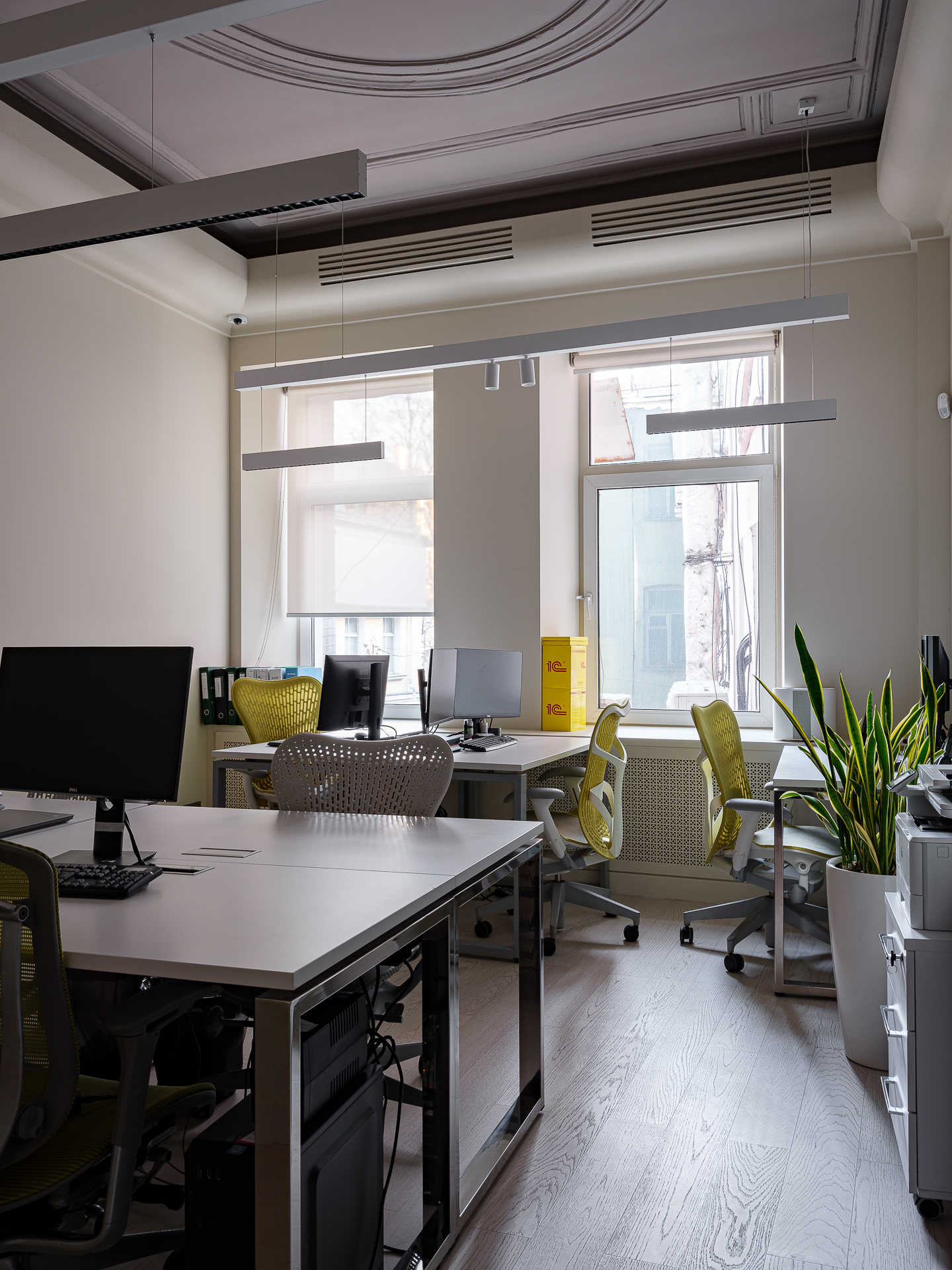Концепция: Основной замысел проекта заключался в искусном диалоге между исторической архитектурой и современными технологиями. Была поставлена задача не просто обновить, а радикально переосмыслить пространство, создав высокоэффективную и вдохновляющую среду. Четкое функциональное зонирование, где административные функции сосредоточены на первом этаже, а динамичное рабочее пространство с open space и индивидуальными кабинетами для разработчиков — на втором, позволило оптимизировать рабочие процессы и создать условия для продуктивного творчества.