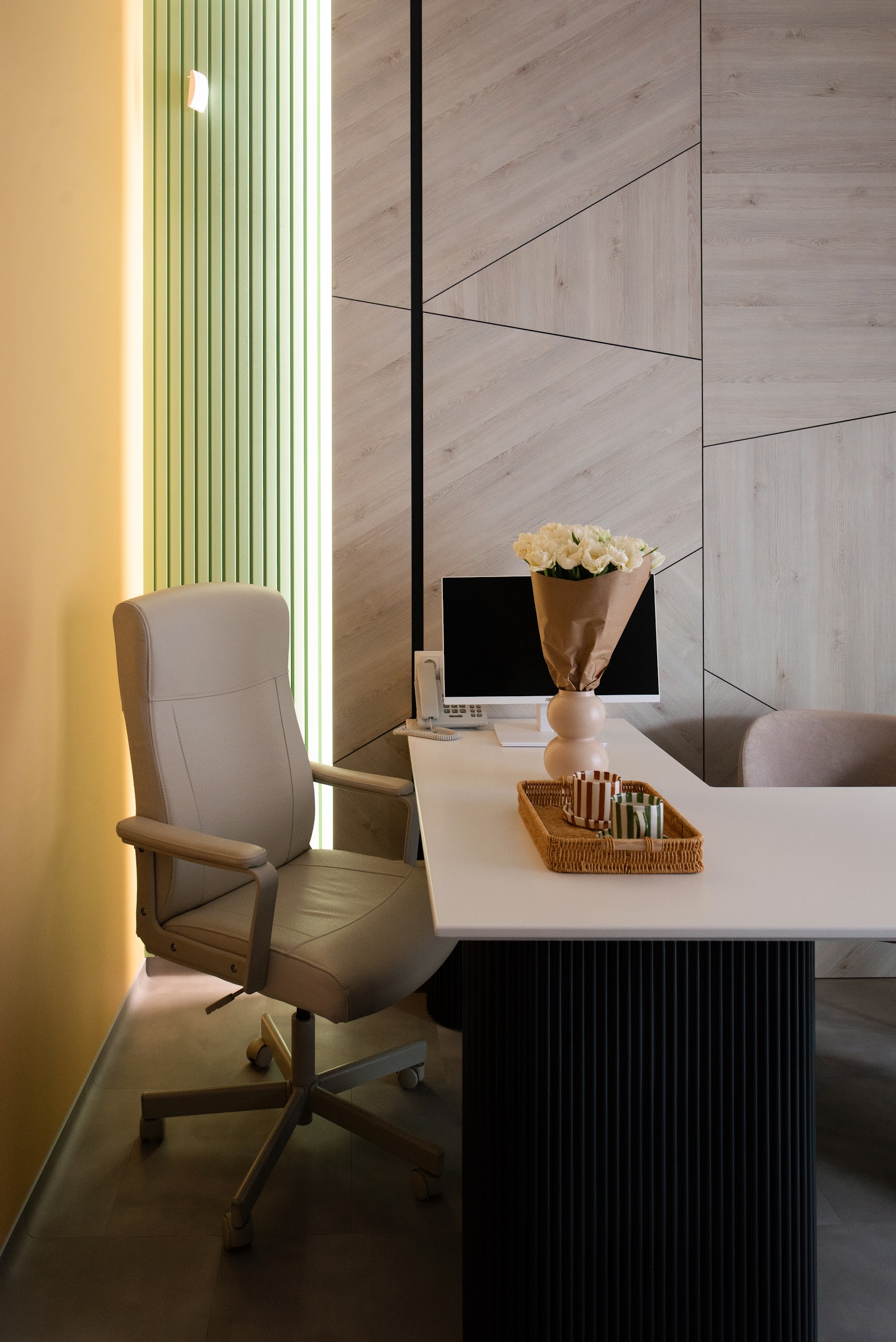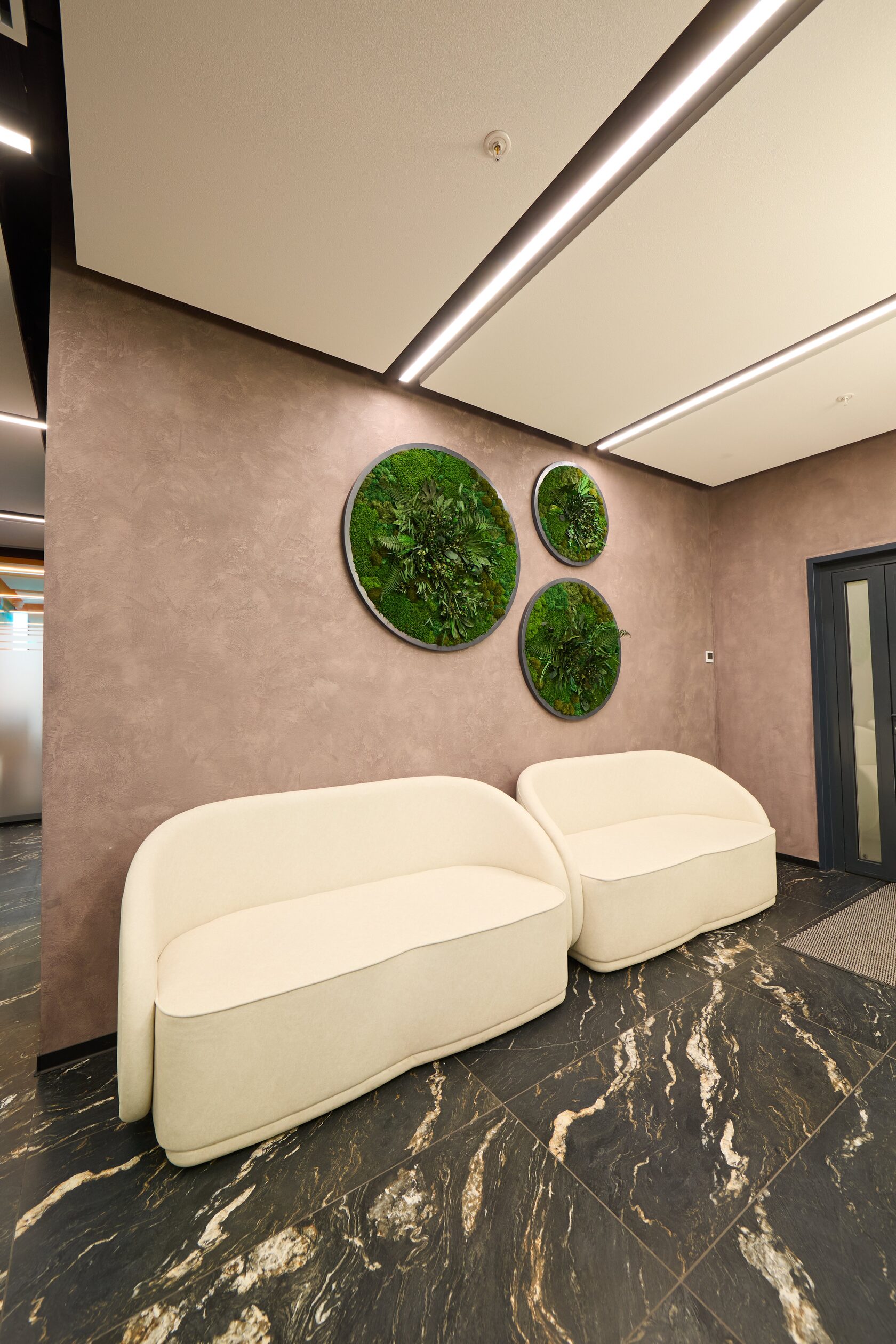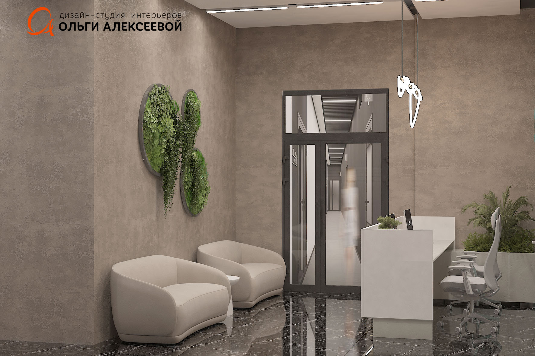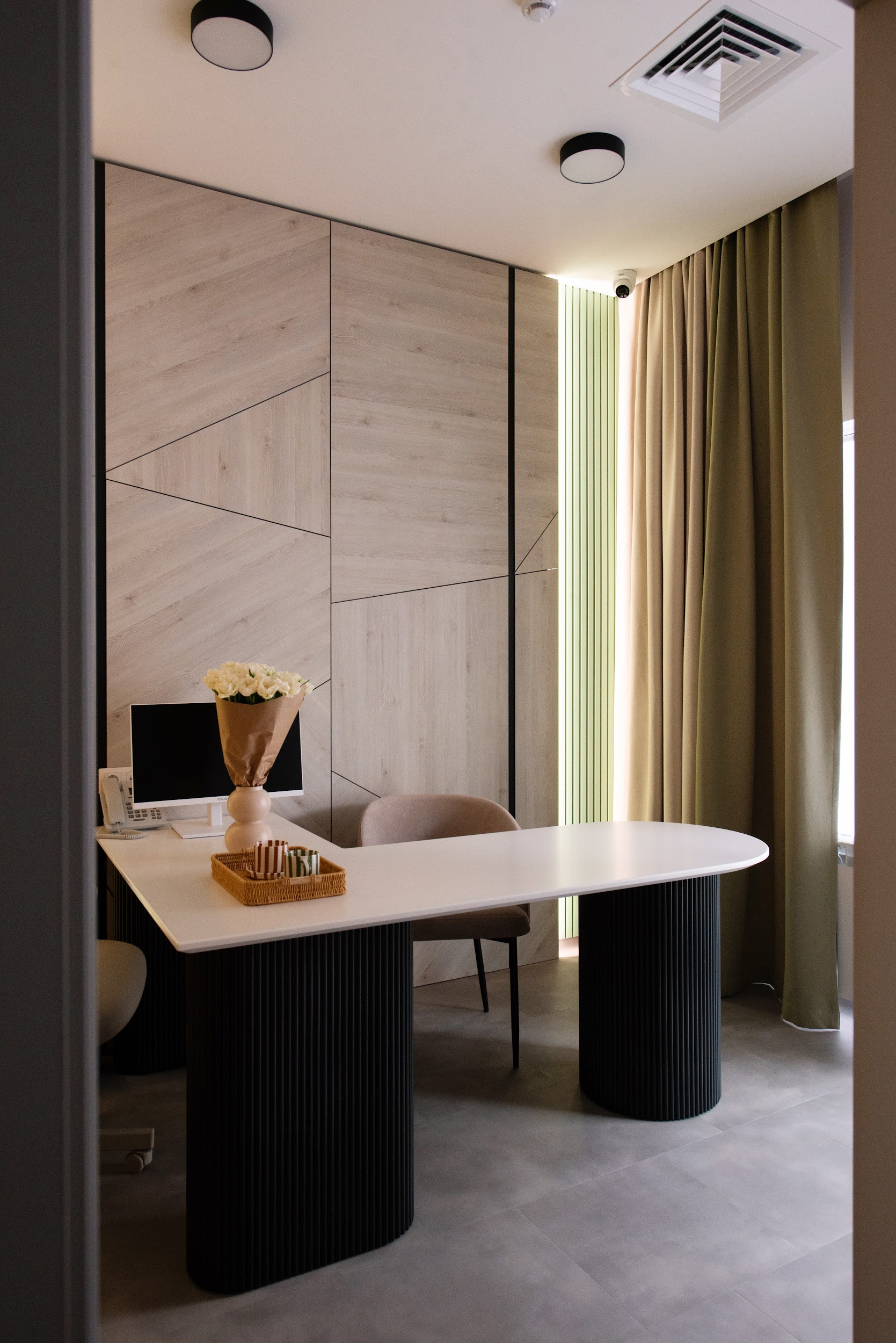 Концепция: Дизайн интерьера выполнен в современном стиле с акцентом на спокойные теплые оттенки, создающие ощущение уюта и эмоционального комфорта. Особое внимание уделено применению природных материалов, таких как дерево и стабилизированный мох, интегрированных в элементы оформления – от панно на ресепшн до фитостены в зоне руководителя. Паттерны фирменного стиля, разработанные студией Артемия Лебедева, органично вписались в пространство, подчеркивая индивидуальность центра и создавая визуальный порядок.