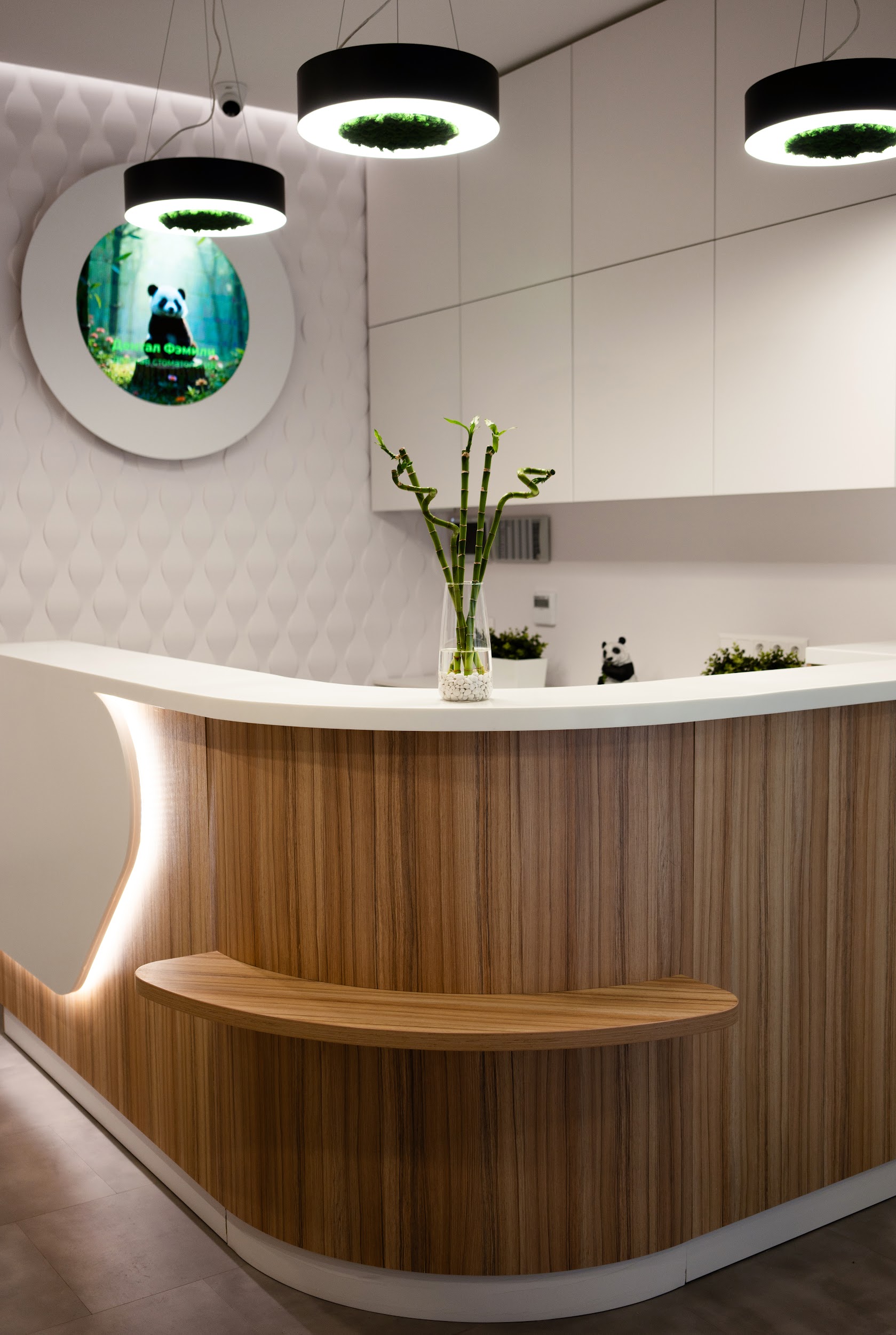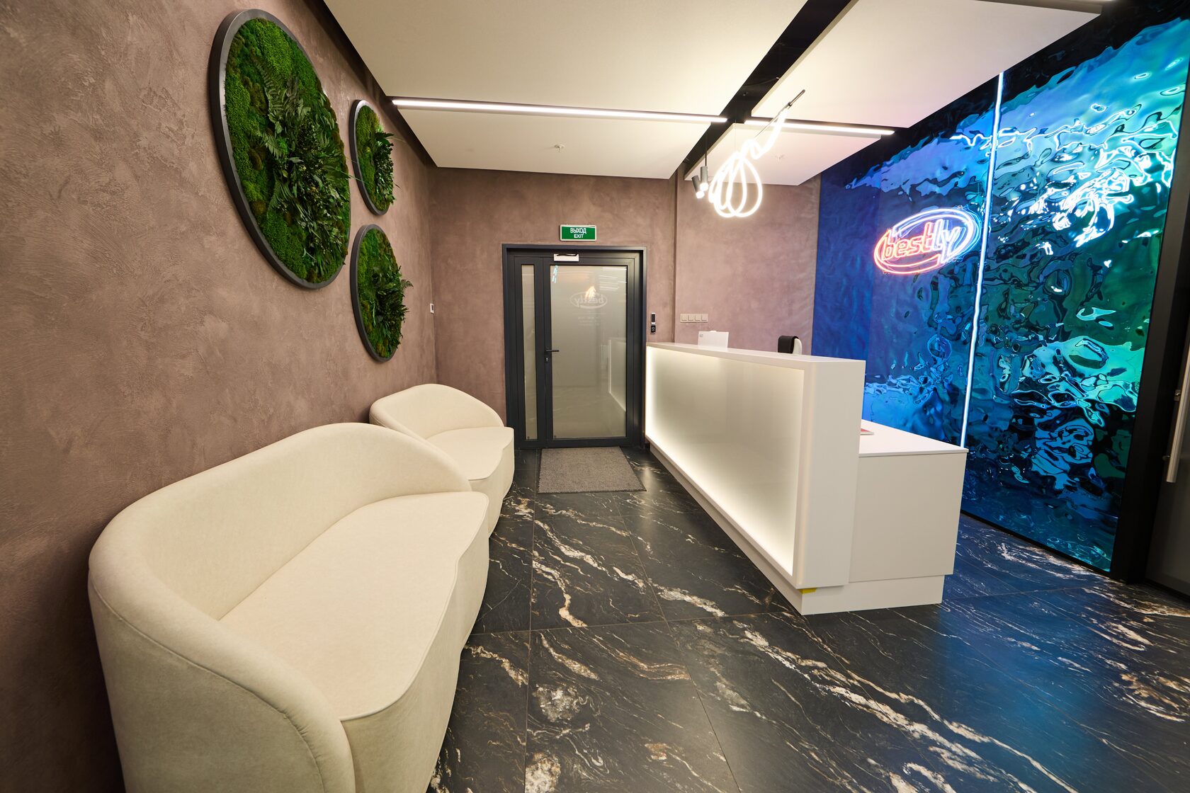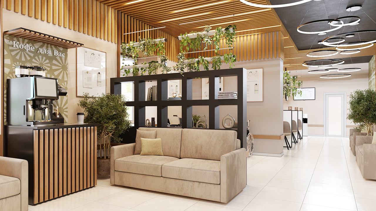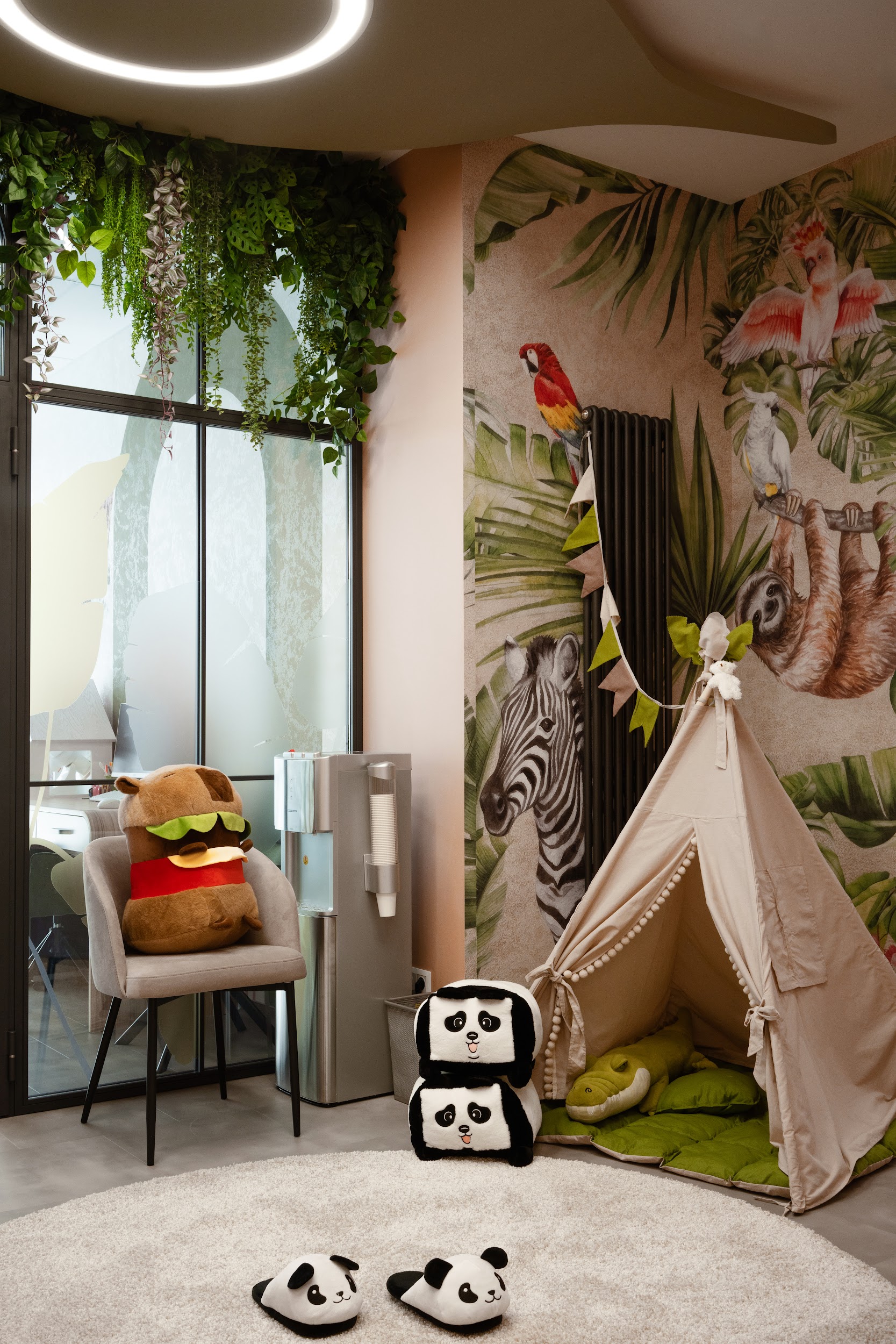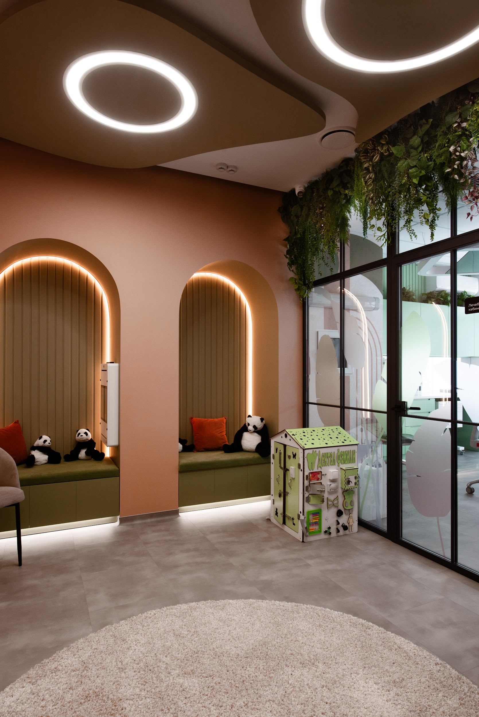 Концепция: Дизайн интерьера выполнен в современном стиле с акцентом на спокойные теплые оттенки, создающие ощущение уюта и эмоционального комфорта. Особое внимание уделено применению природных материалов, таких как дерево и стабилизированный мох, интегрированных в элементы оформления – от панно на ресепшн до фитостены в зоне руководителя. Паттерны фирменного стиля, разработанные студией Артемия Лебедева, органично вписались в пространство, подчеркивая индивидуальность центра и создавая визуальный порядок.