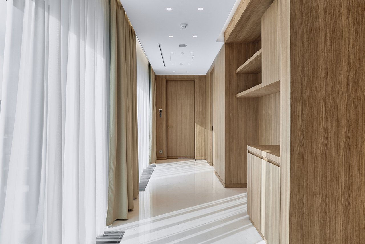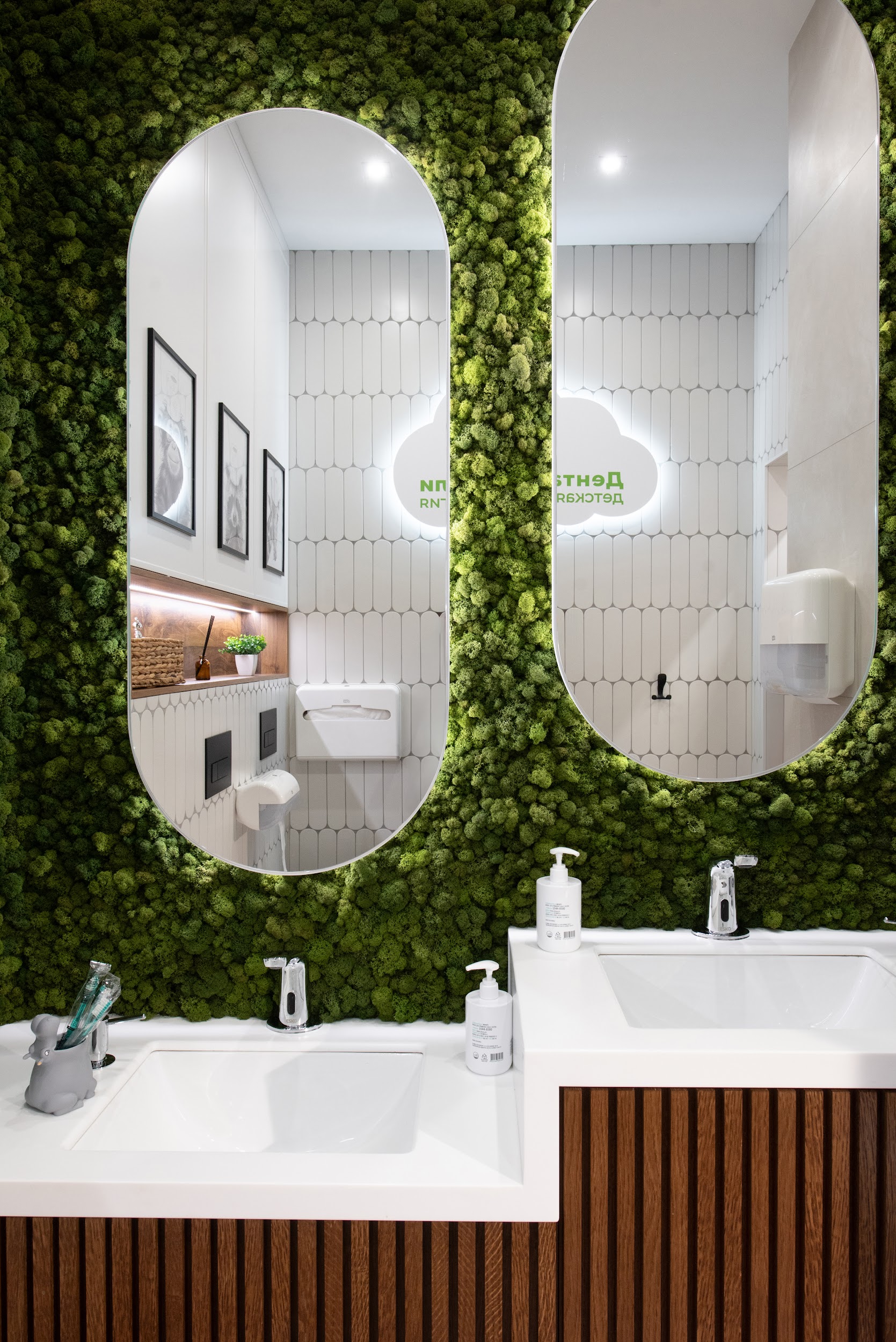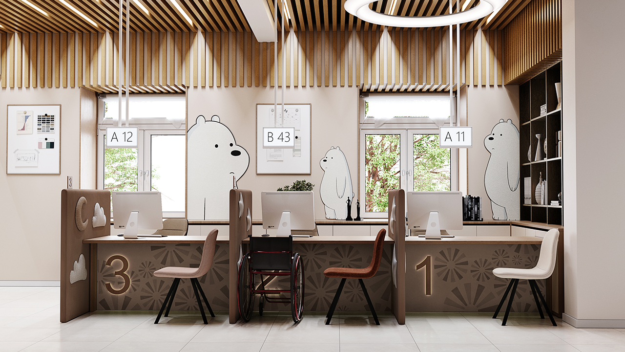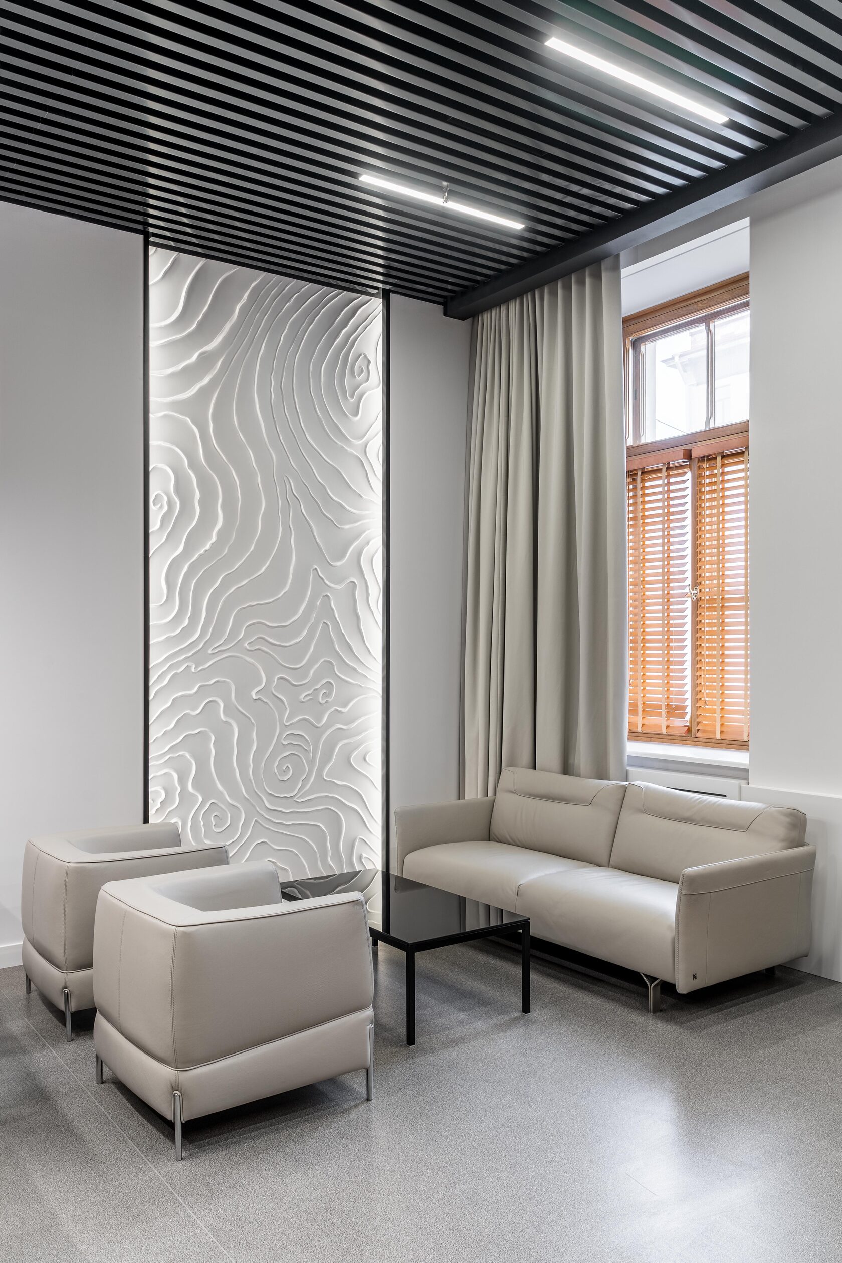 Концепция: Дизайн интерьера выполнен в современном стиле с акцентом на спокойные теплые оттенки, создающие ощущение уюта и эмоционального комфорта. Особое внимание уделено применению природных материалов, таких как дерево и стабилизированный мох, интегрированных в элементы оформления – от панно на ресепшн до фитостены в зоне руководителя. Паттерны фирменного стиля, разработанные студией Артемия Лебедева, органично вписались в пространство, подчеркивая индивидуальность центра и создавая визуальный порядок.