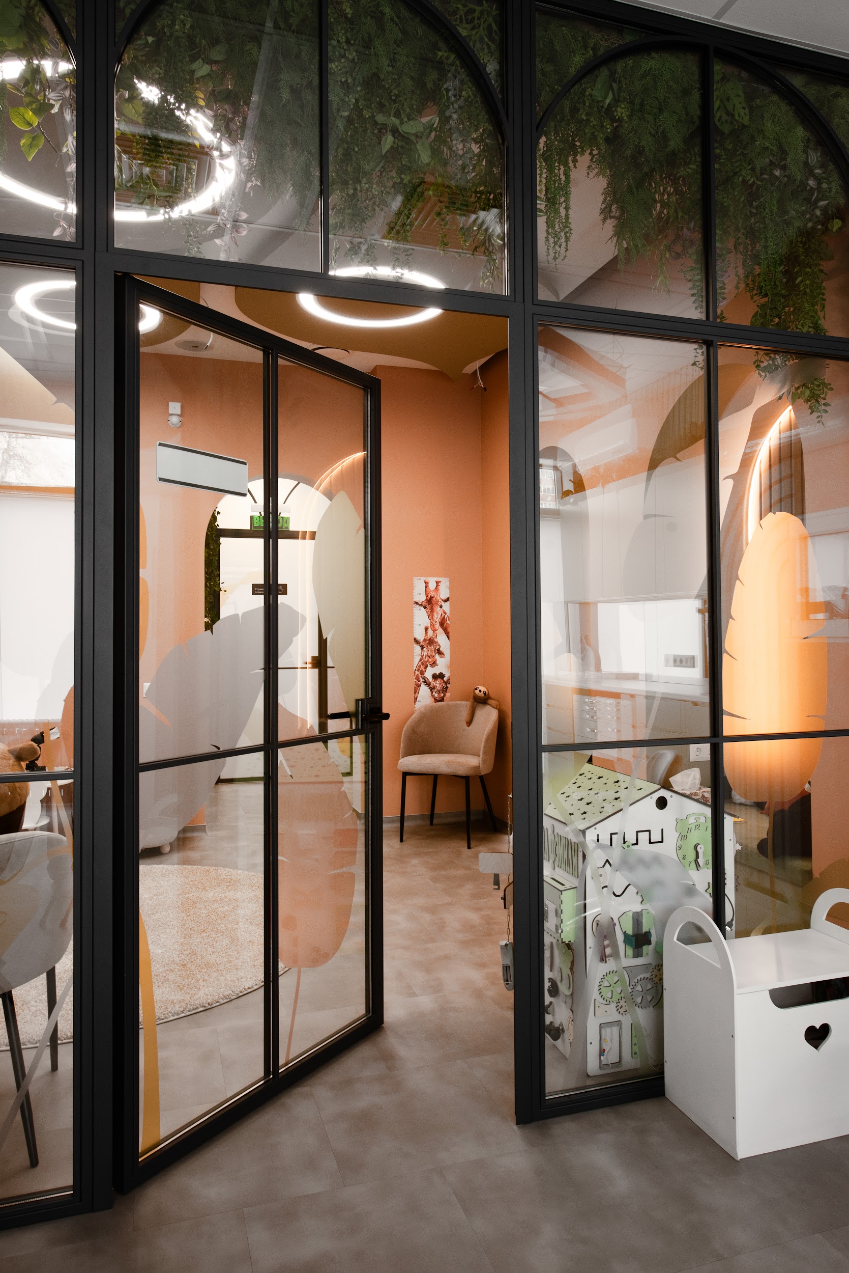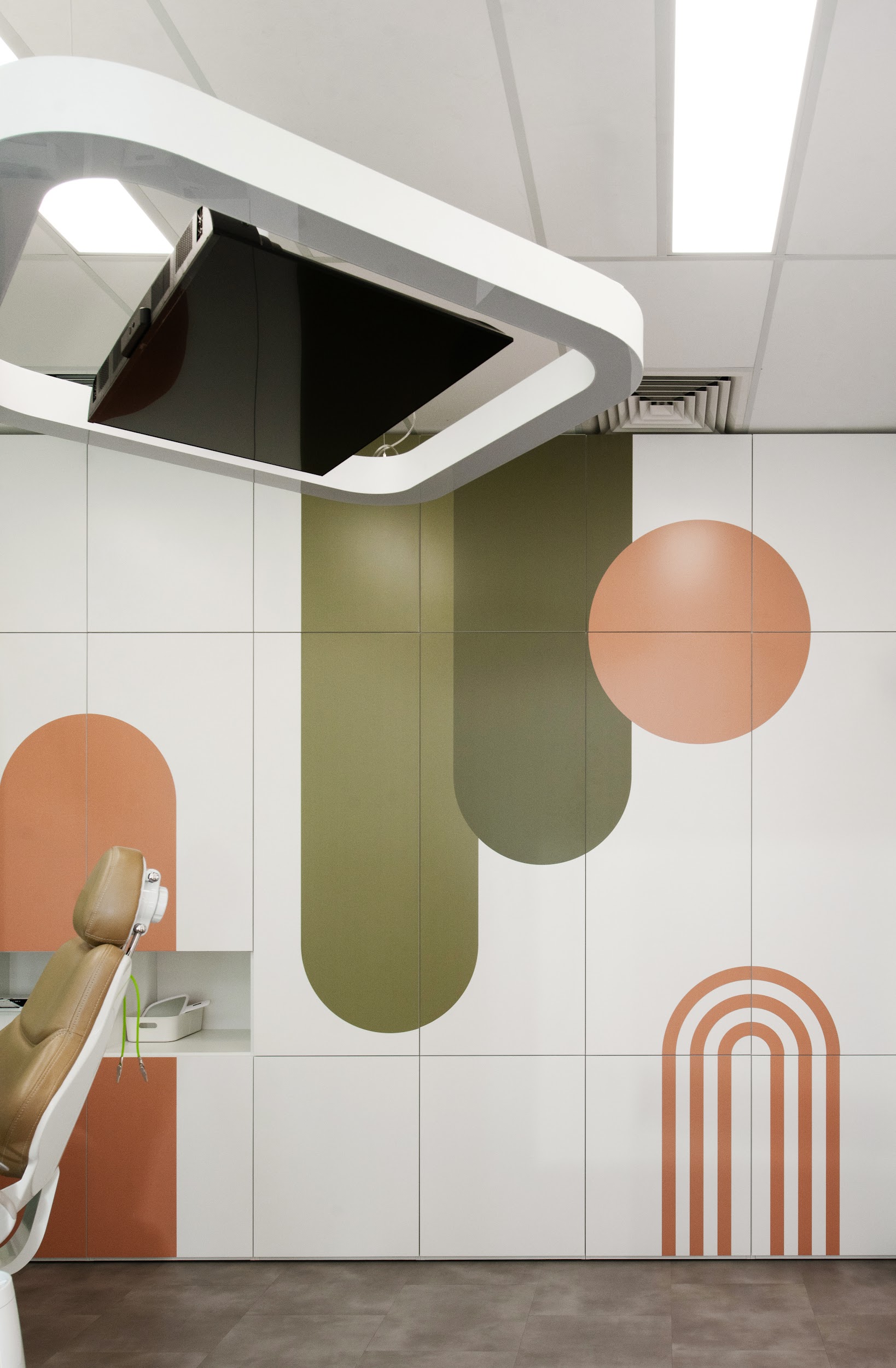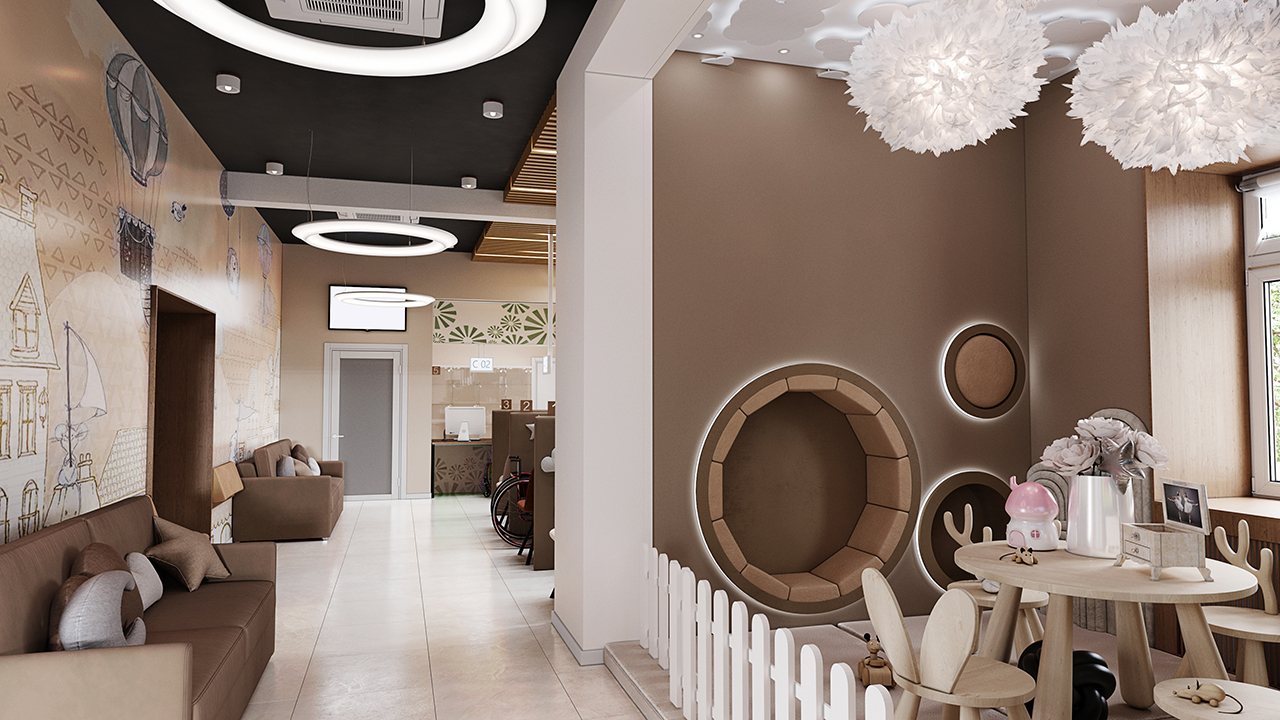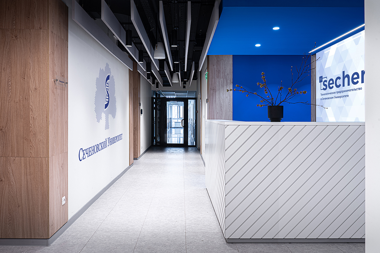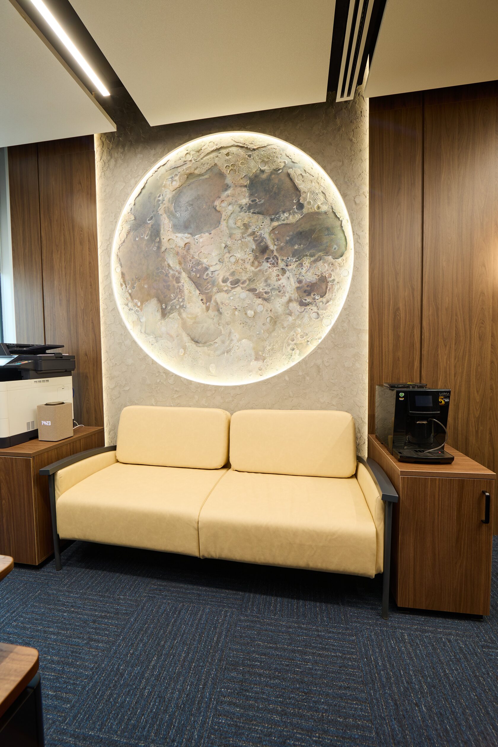 Концепция: Дизайн интерьера выполнен в современном стиле с акцентом на спокойные теплые оттенки, создающие ощущение уюта и эмоционального комфорта. Особое внимание уделено применению природных материалов, таких как дерево и стабилизированный мох, интегрированных в элементы оформления – от панно на ресепшн до фитостены в зоне руководителя. Паттерны фирменного стиля, разработанные студией Артемия Лебедева, органично вписались в пространство, подчеркивая индивидуальность центра и создавая визуальный порядок.